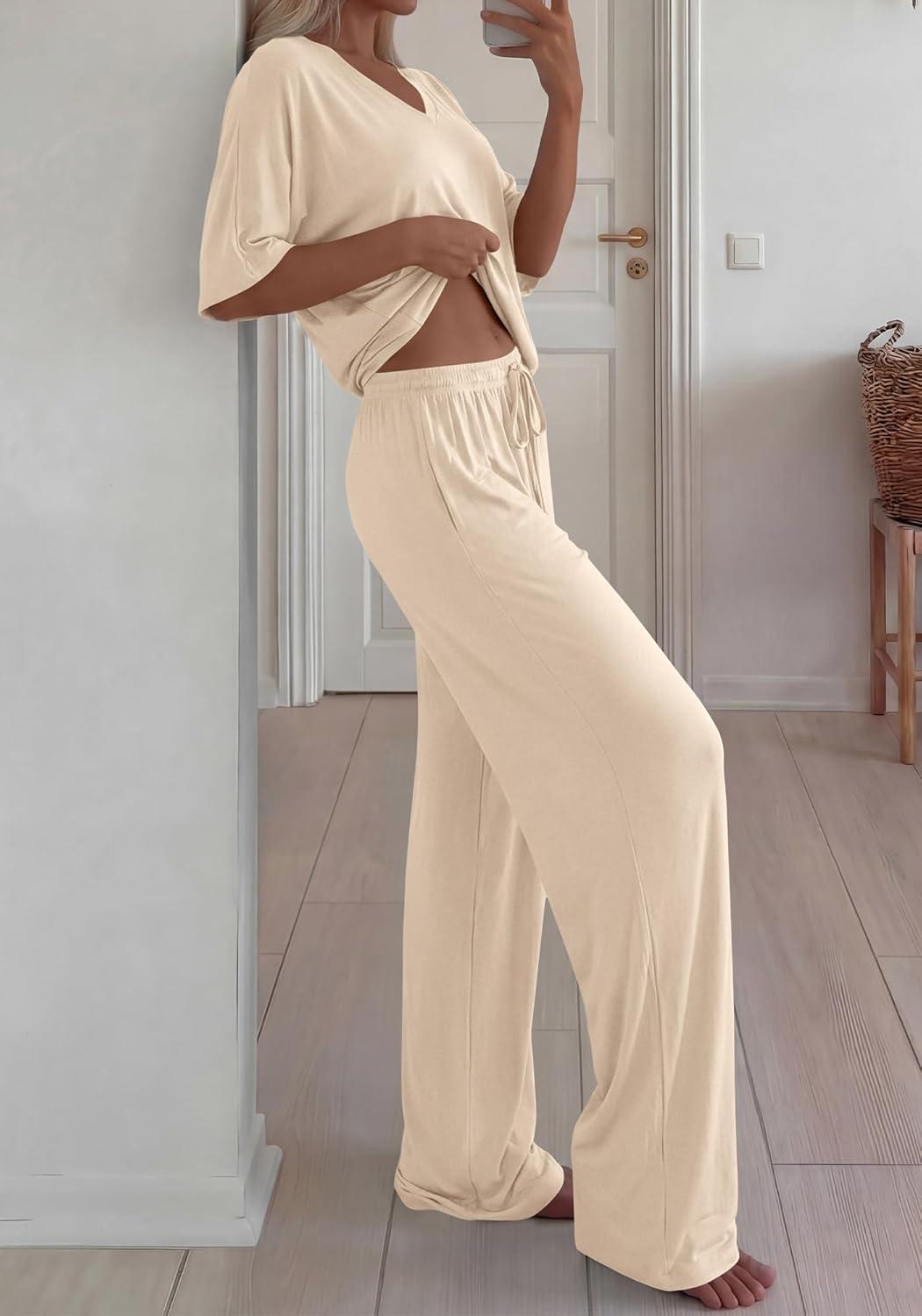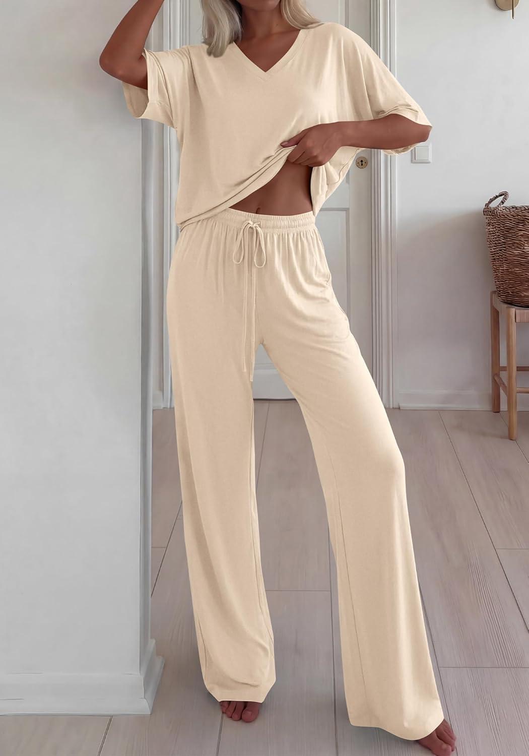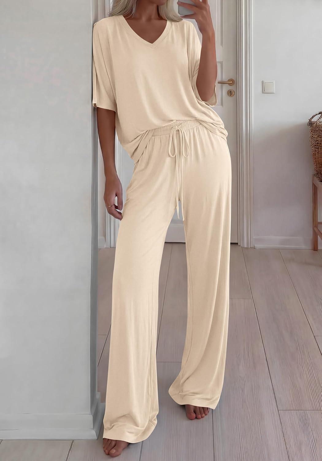 BTFBM 2 Piece Sets for Women Summer V Neck Short Sleeve Lounge Set Wide Leg Pants Matching Set Airport Travel Outfits(Beige)