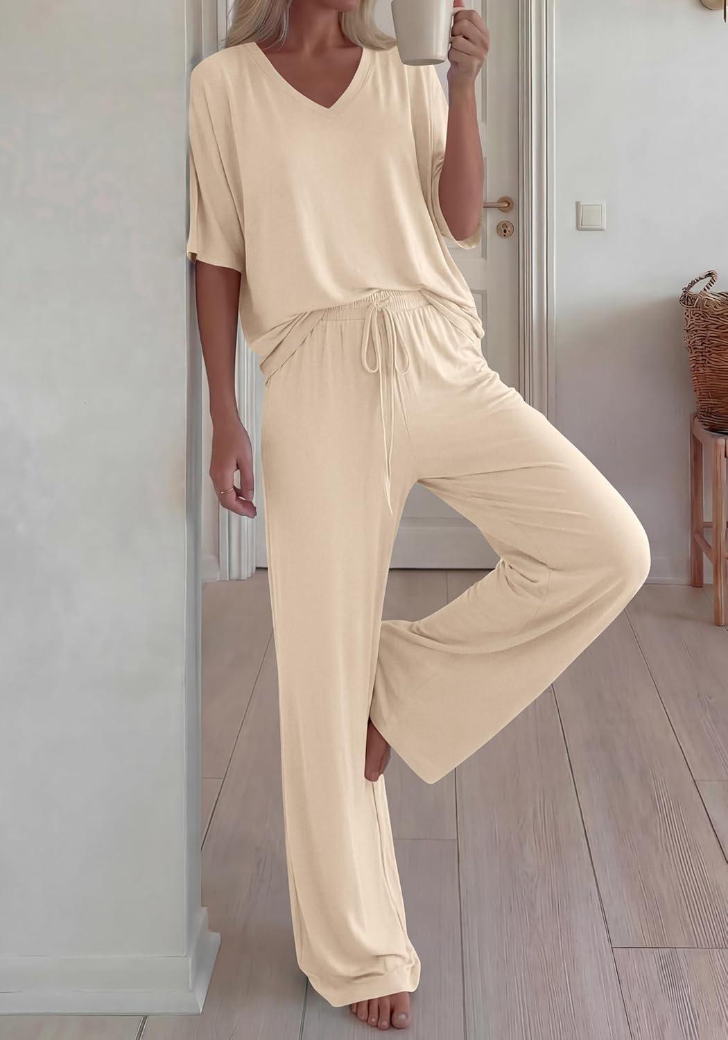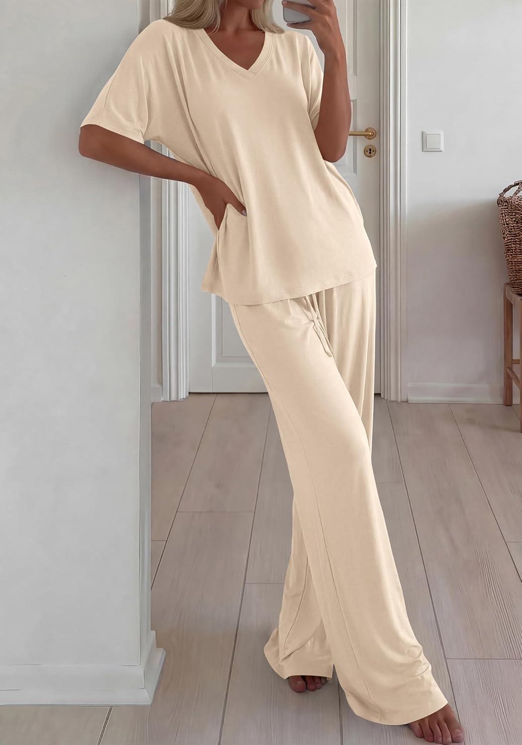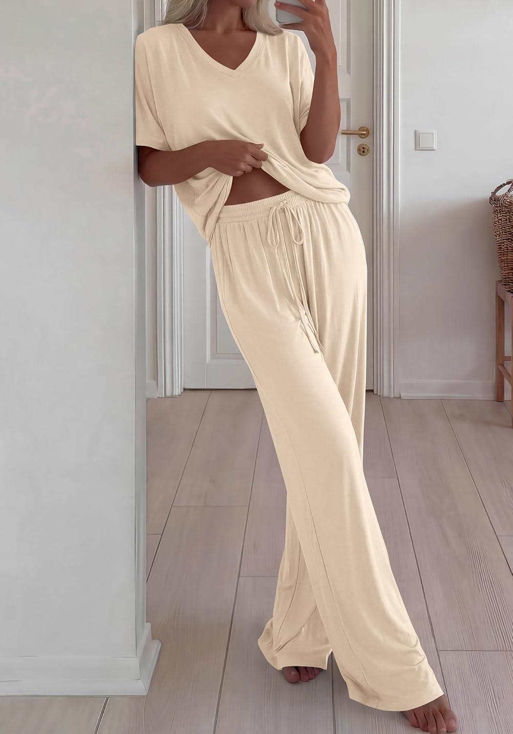 BTFBM 2 Piece Sets for Women Summer V Neck Short Sleeve Lounge Set Wide Leg Pants Matching Set Airport Travel Outfits(Beige)