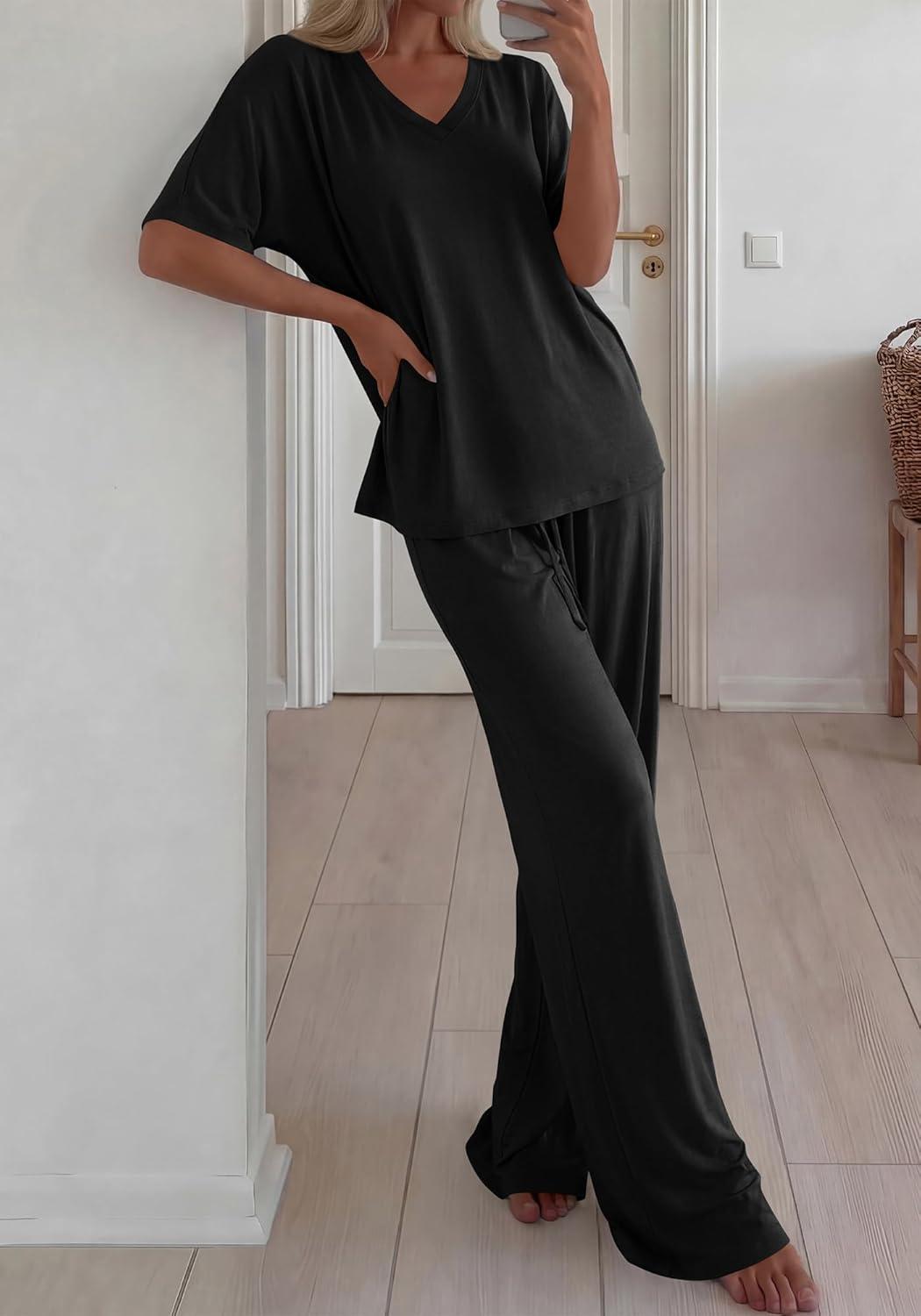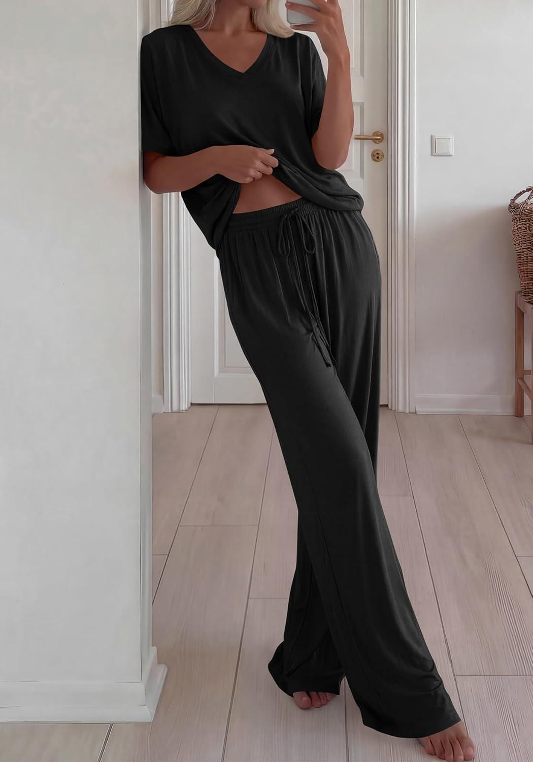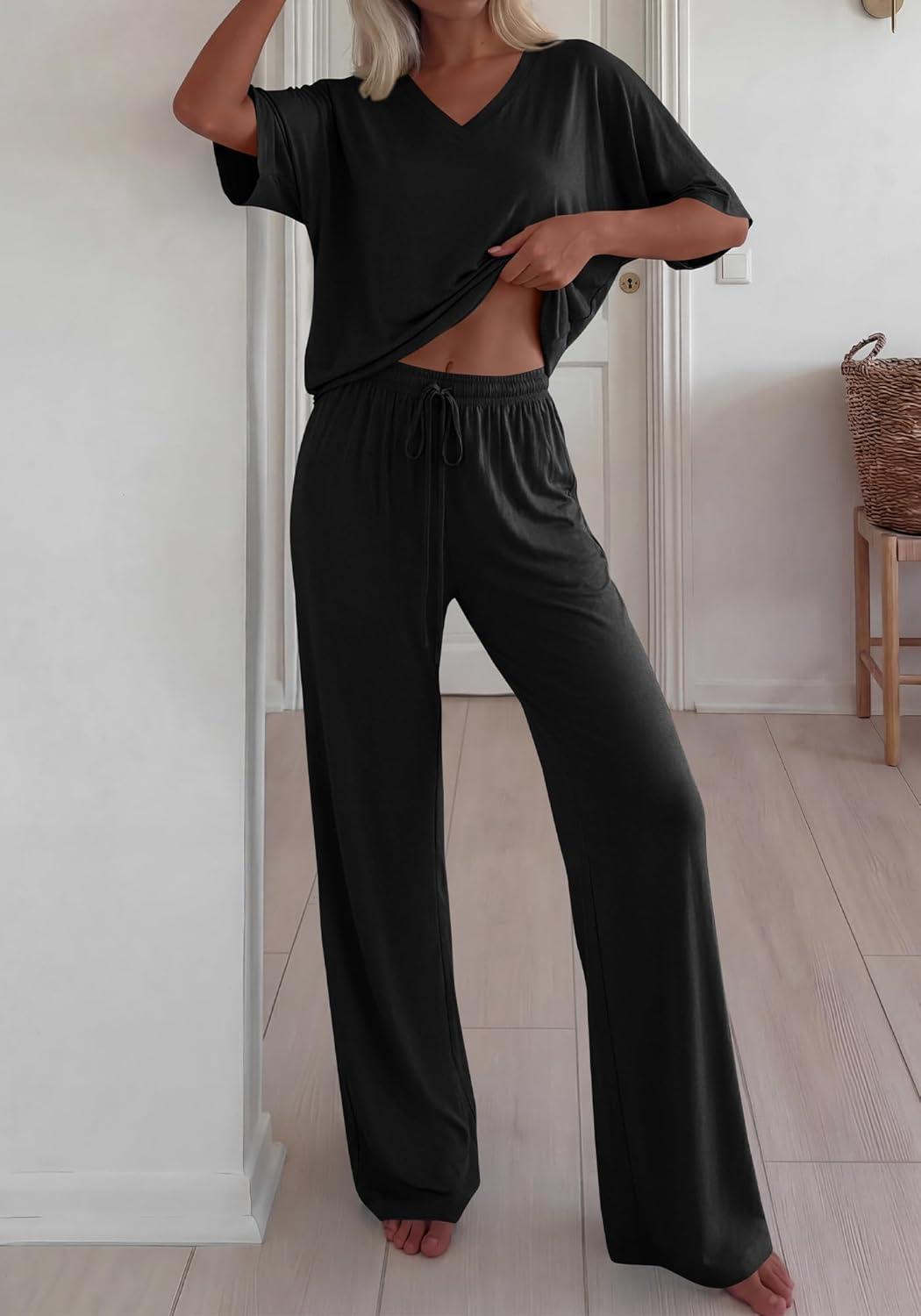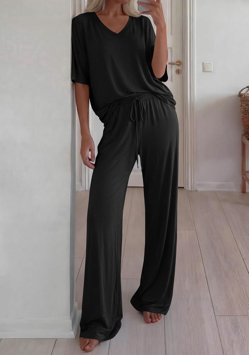 BTFBM 2 Piece Sets for Women Summer V Neck Short Sleeve Lounge Set Wide Leg Pants Matching Set Airport Travel Outfits(Black)
