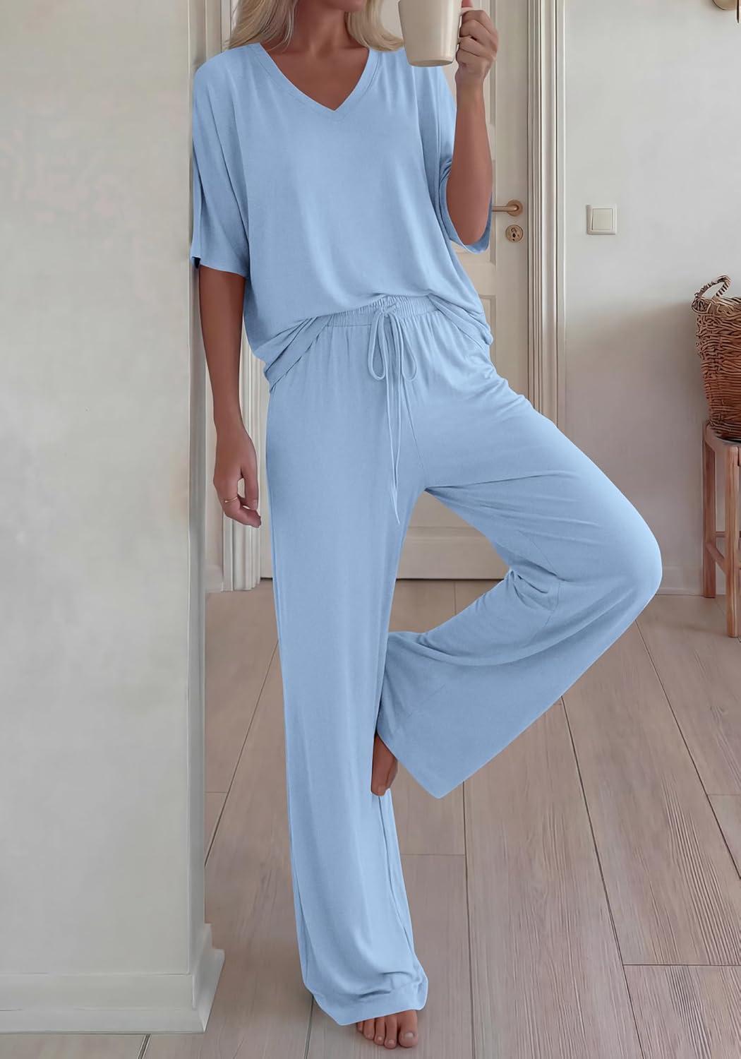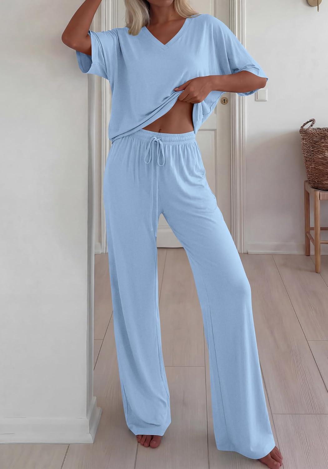 BTFBM 2 Piece Sets for Women Summer V Neck Short Sleeve Lounge Set Wide Leg Pants Matching Set Airport Travel Outfits(Light Blue)
