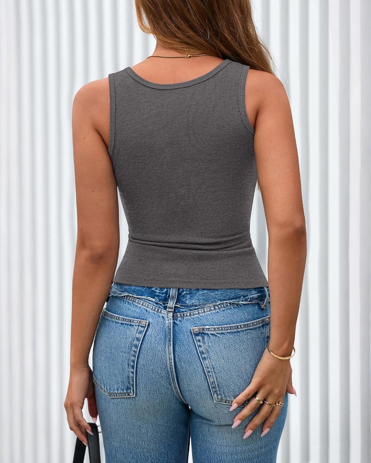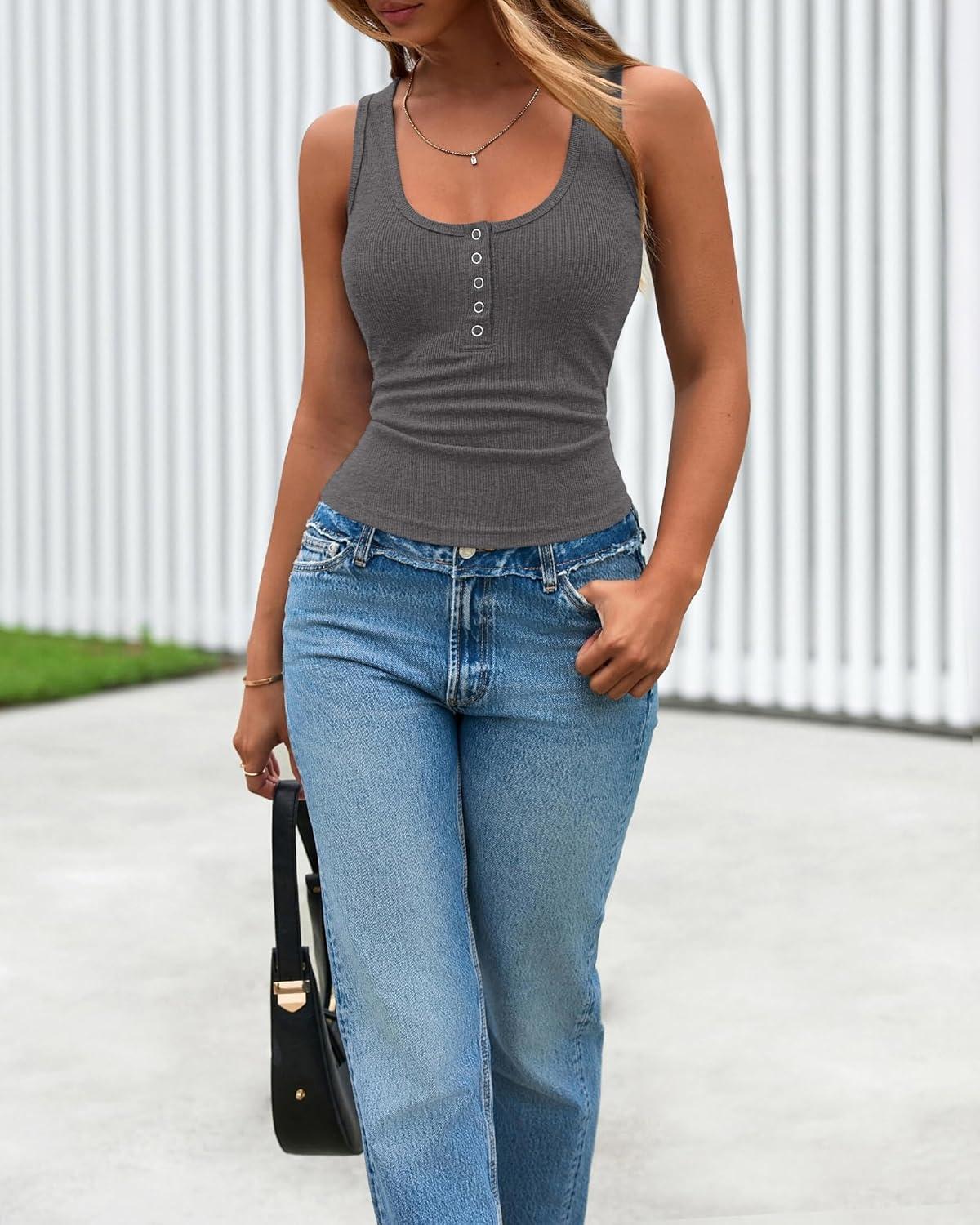 BTFBM 2026 Spring Tops for Women Summer Scoop Neck Ribbed Henley Button Sleeveless Casual Basic Tank Top Clothes Outfits(Dark Grey)
