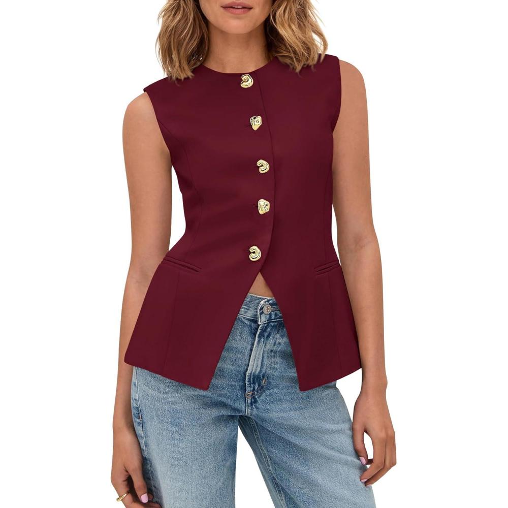 BTFBM Blazers for Women Vest Tops Business Casual Outfits Button Down Sleeveless Pockets Office Work Clothes Spring 2026(Burgundy)