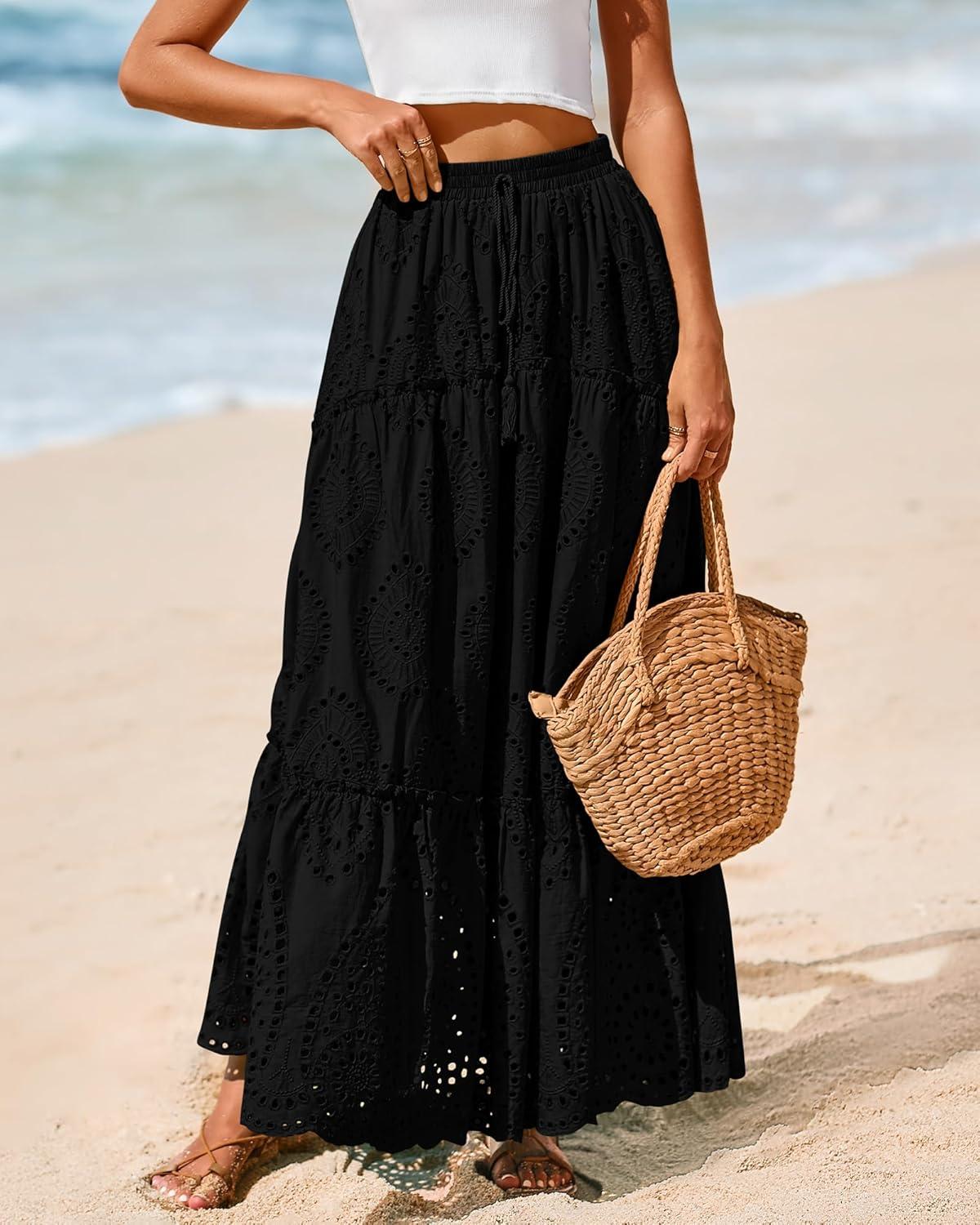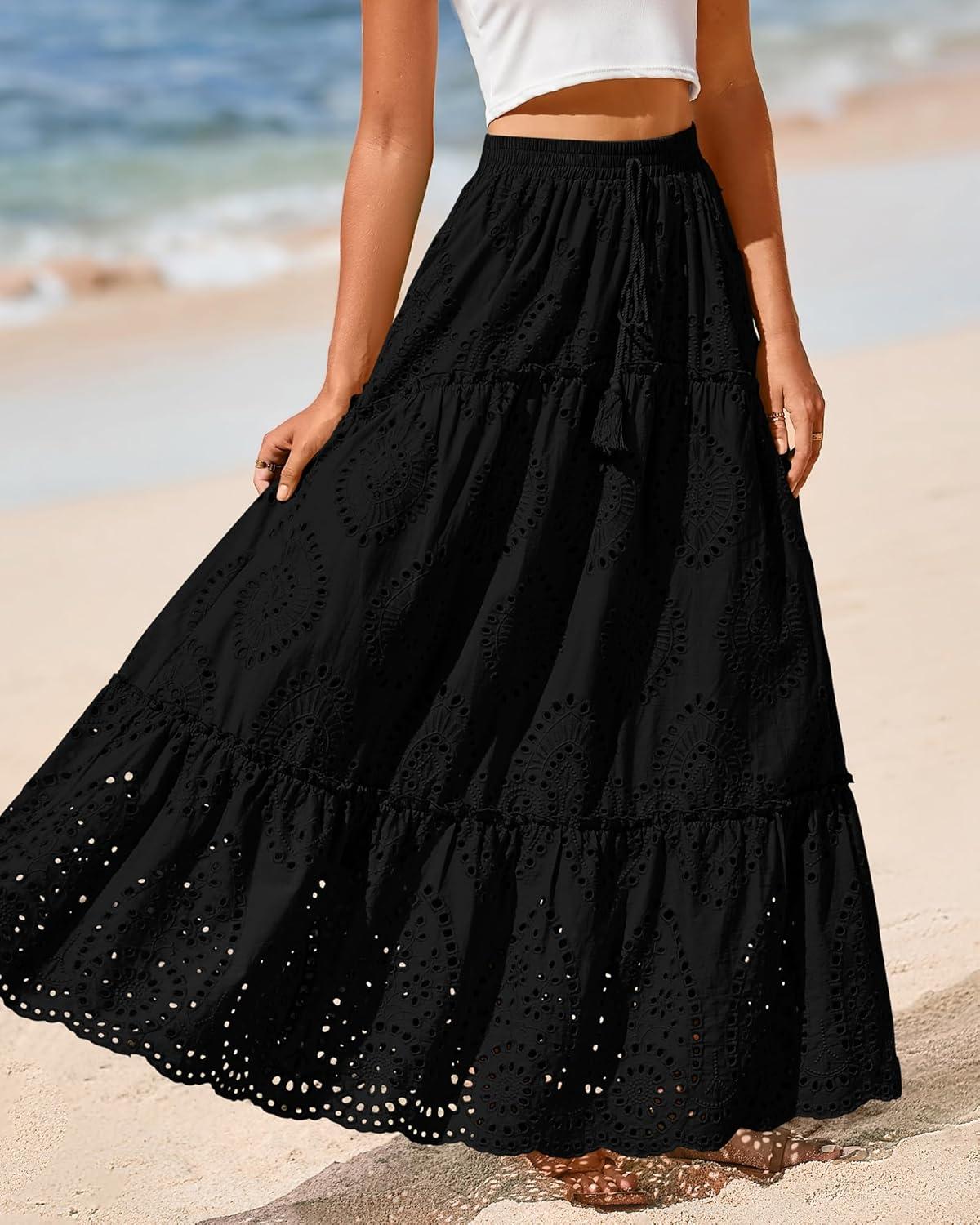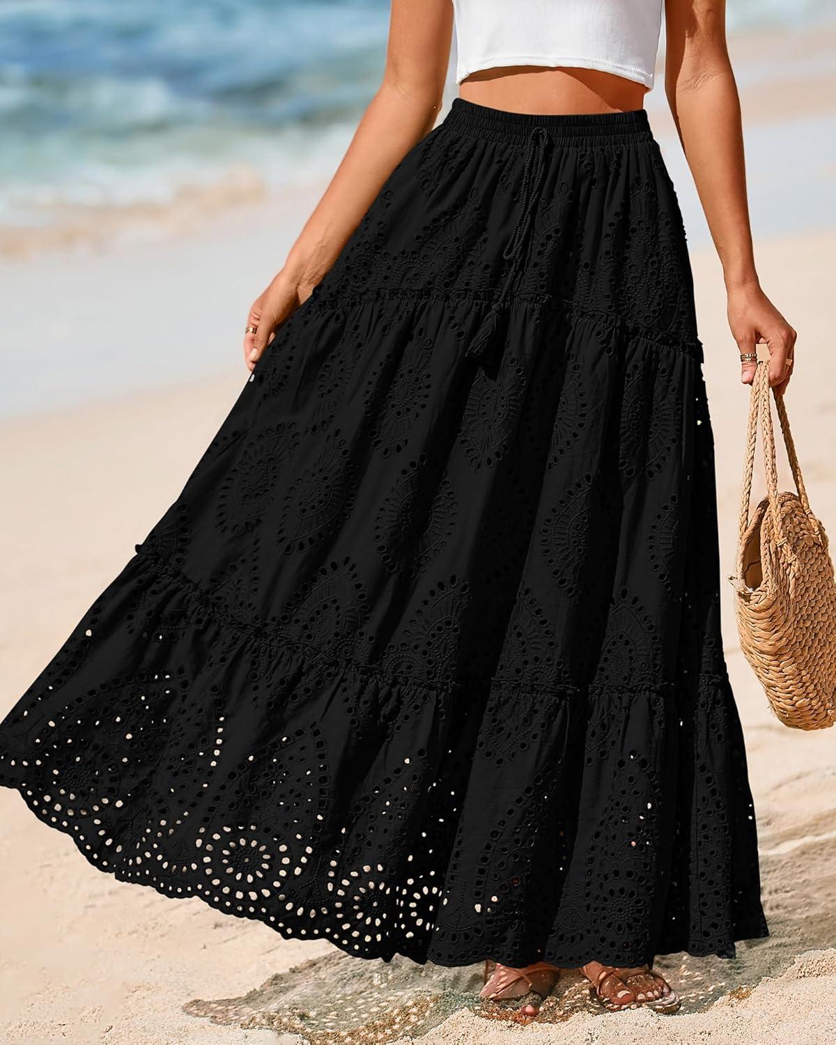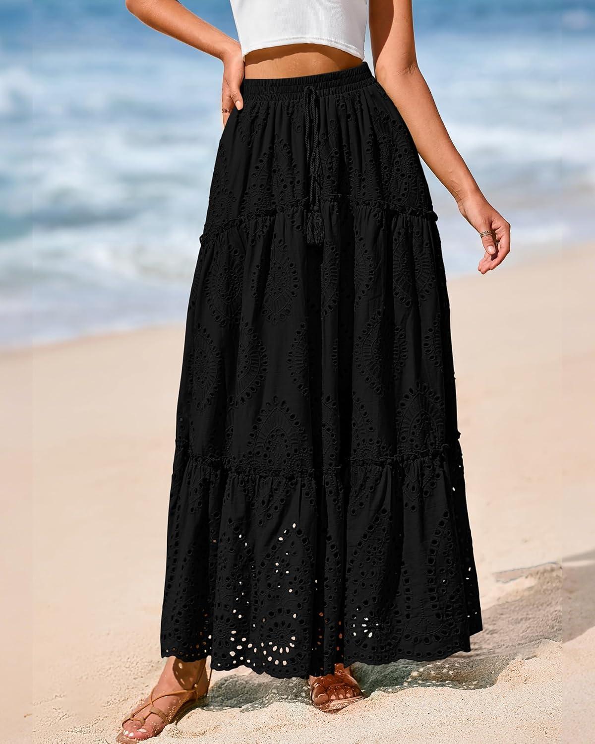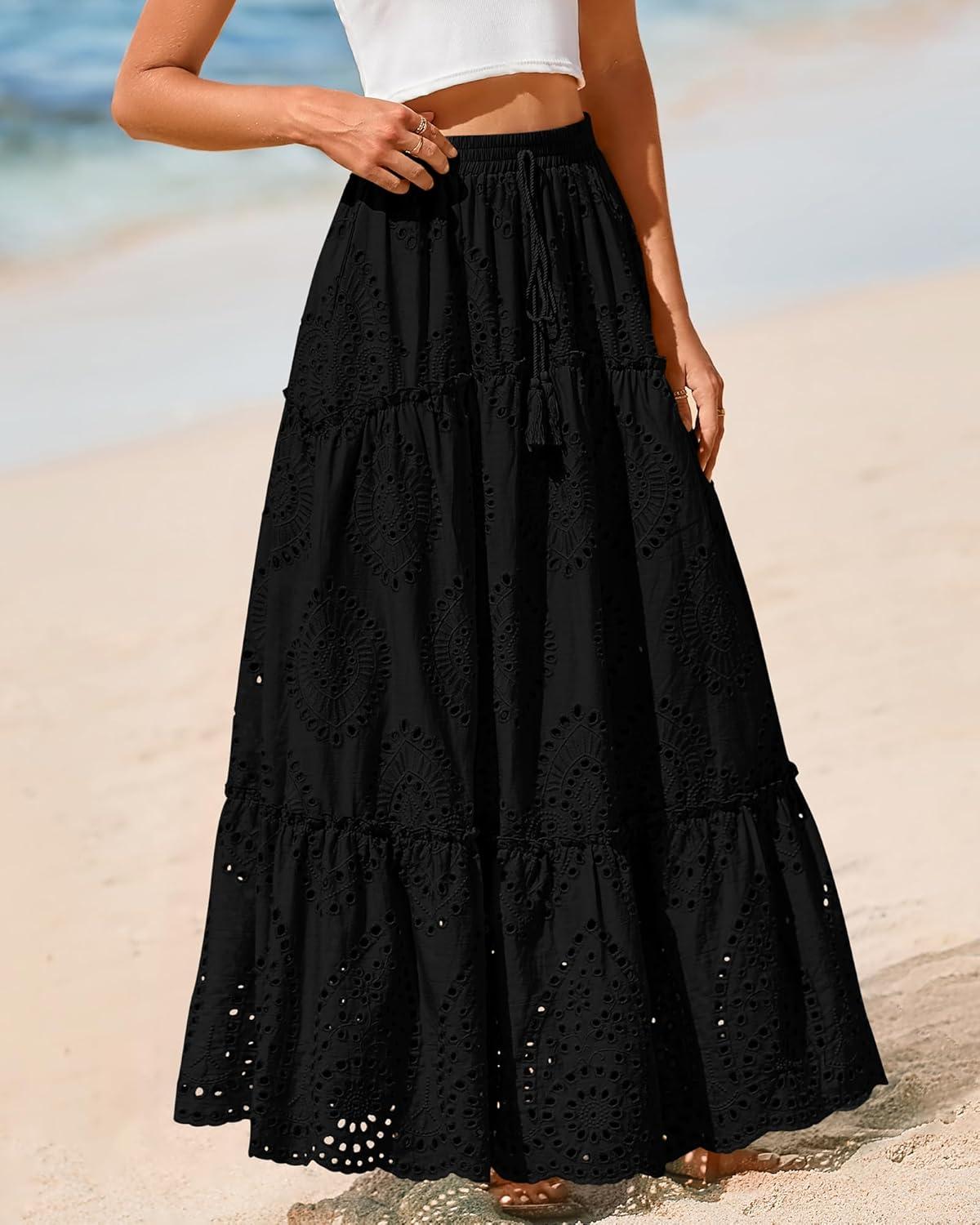 BTFBM Boho Long Skirts for Women Spring Summer 2026 Lace Embroidery High Waist Flowy Tiered Maxi Skirt Beach Vacation(Black)
