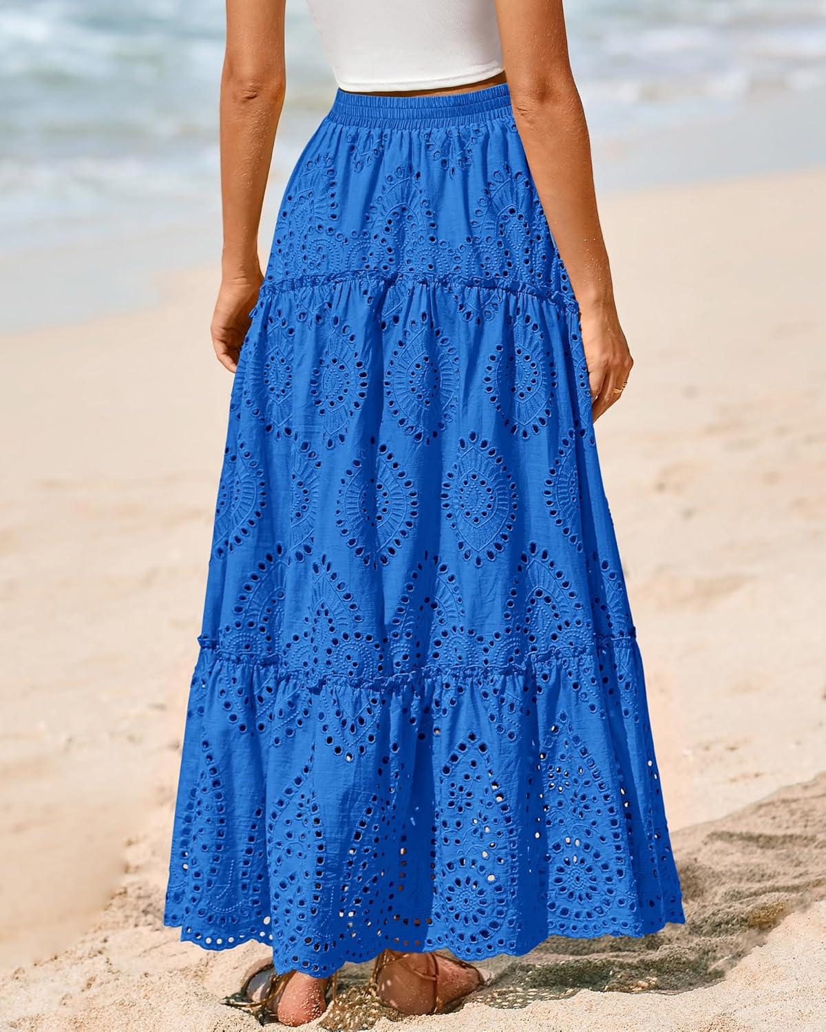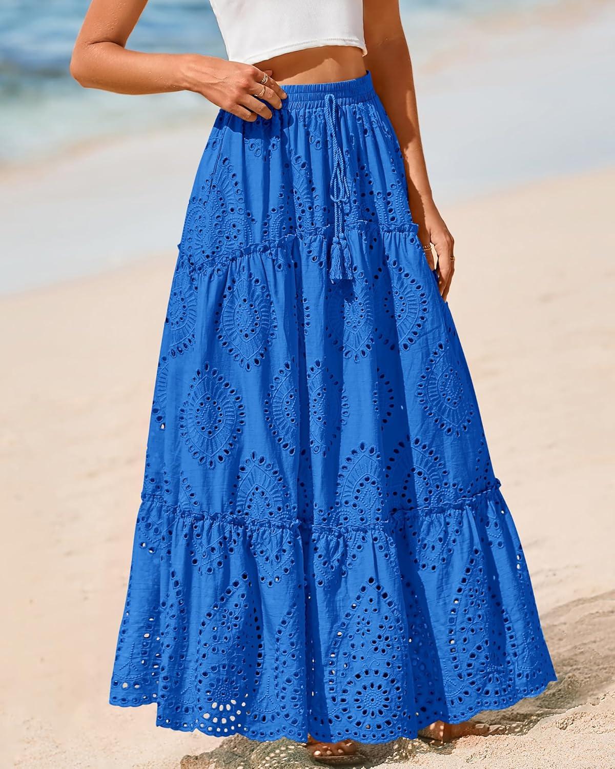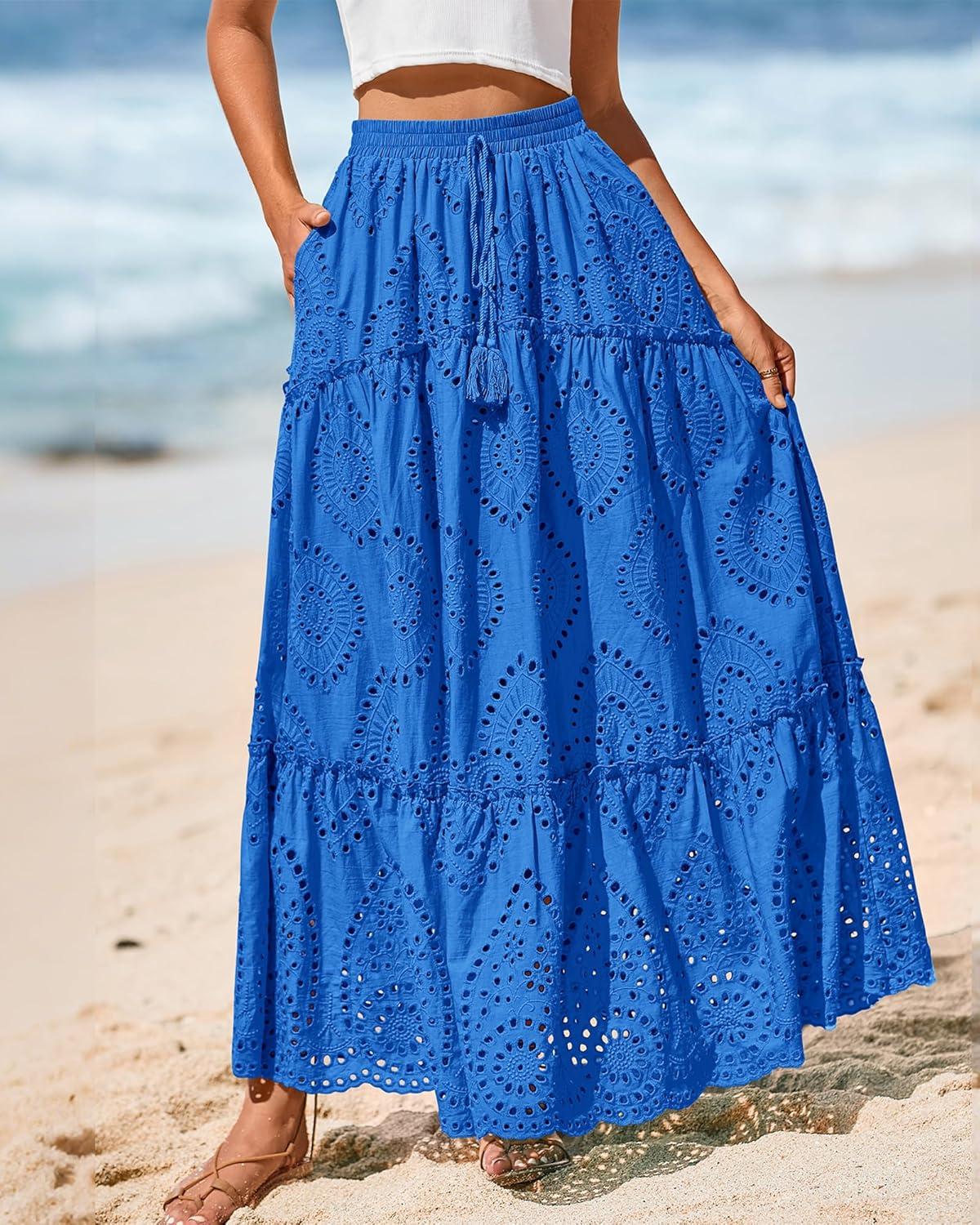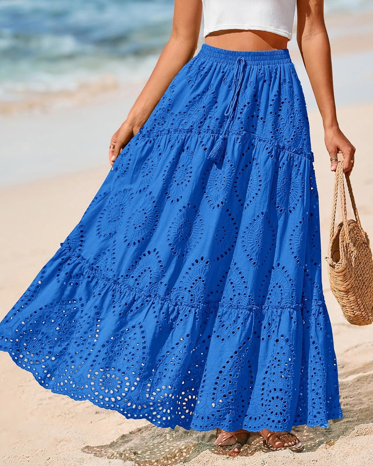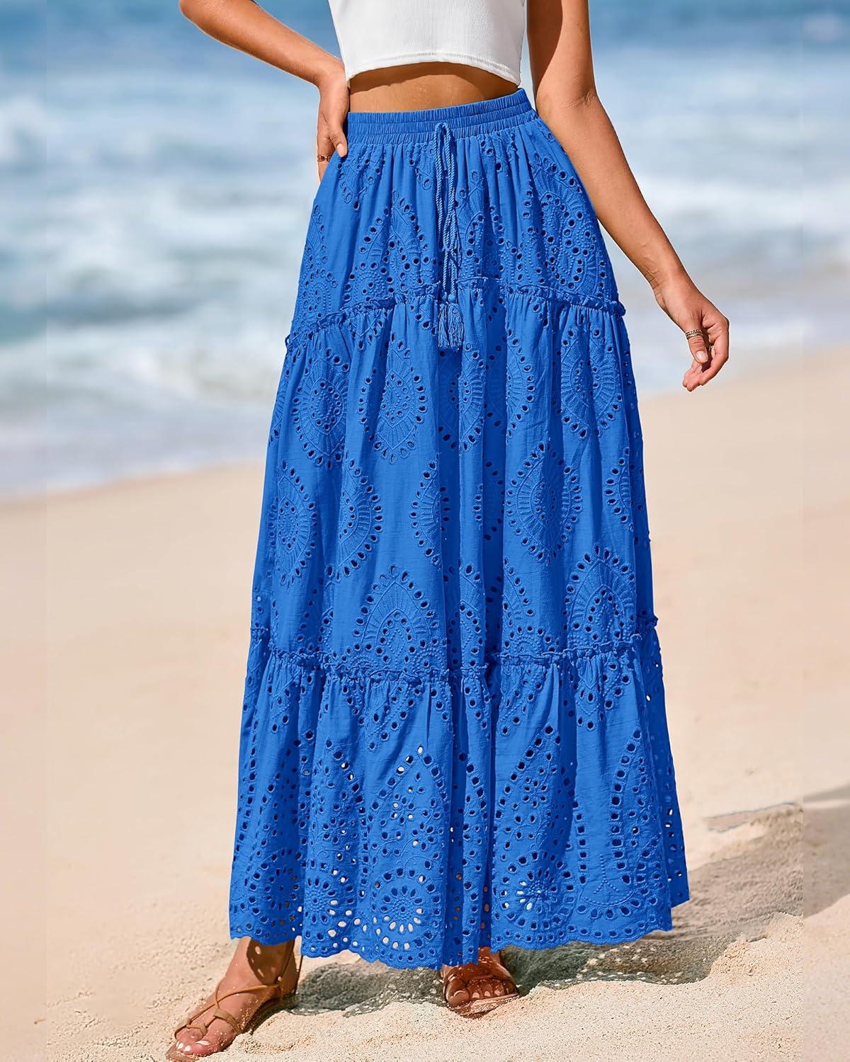 BTFBM Boho Long Skirts for Women Spring Summer 2026 Lace Embroidery High Waist Flowy Tiered Maxi Skirt Beach Vacation(Blue)