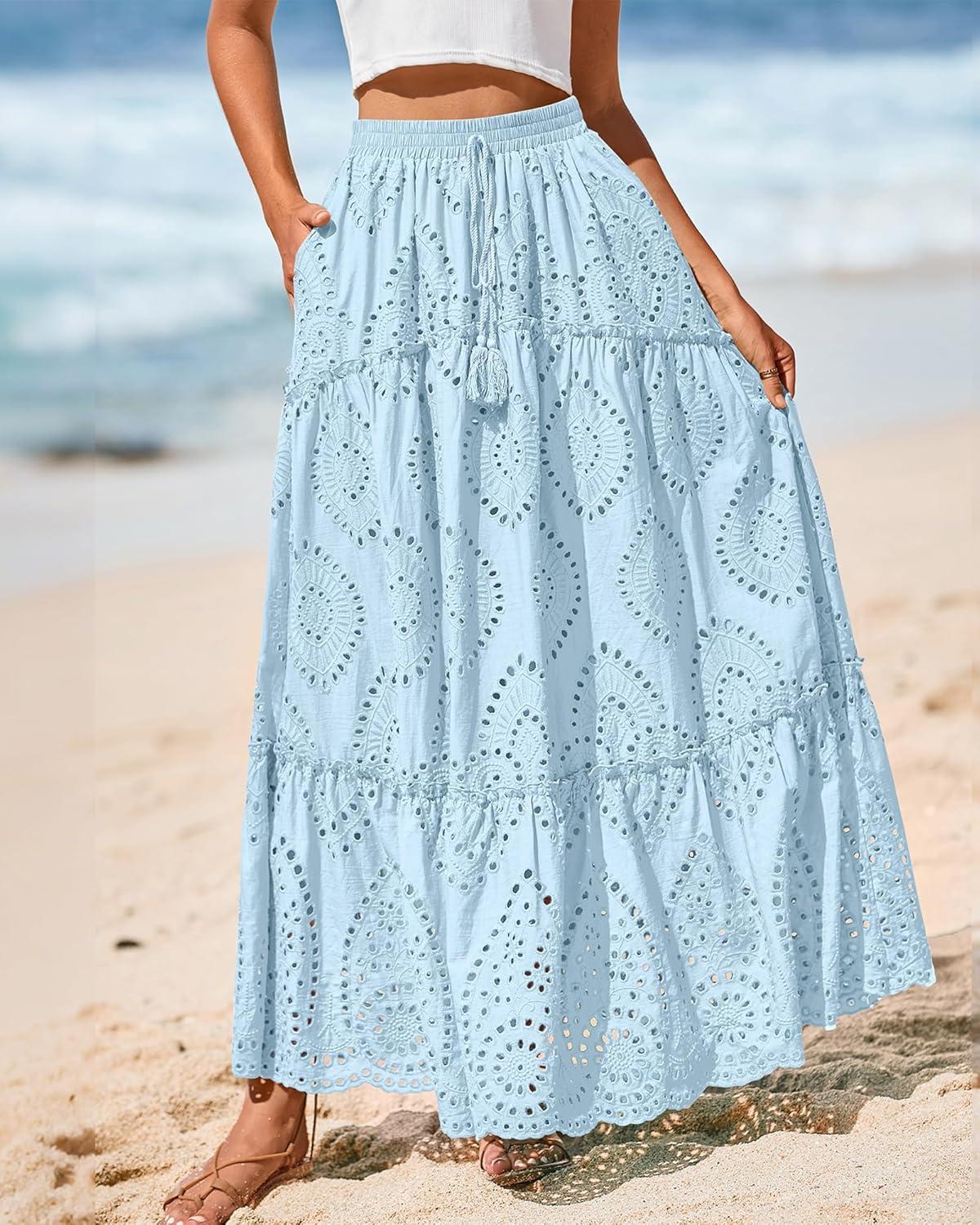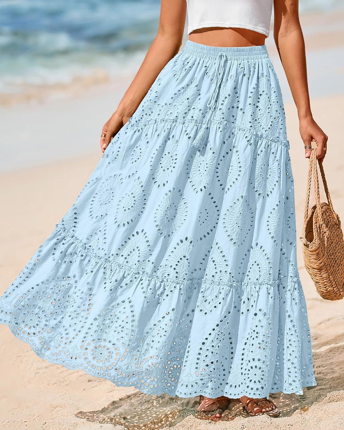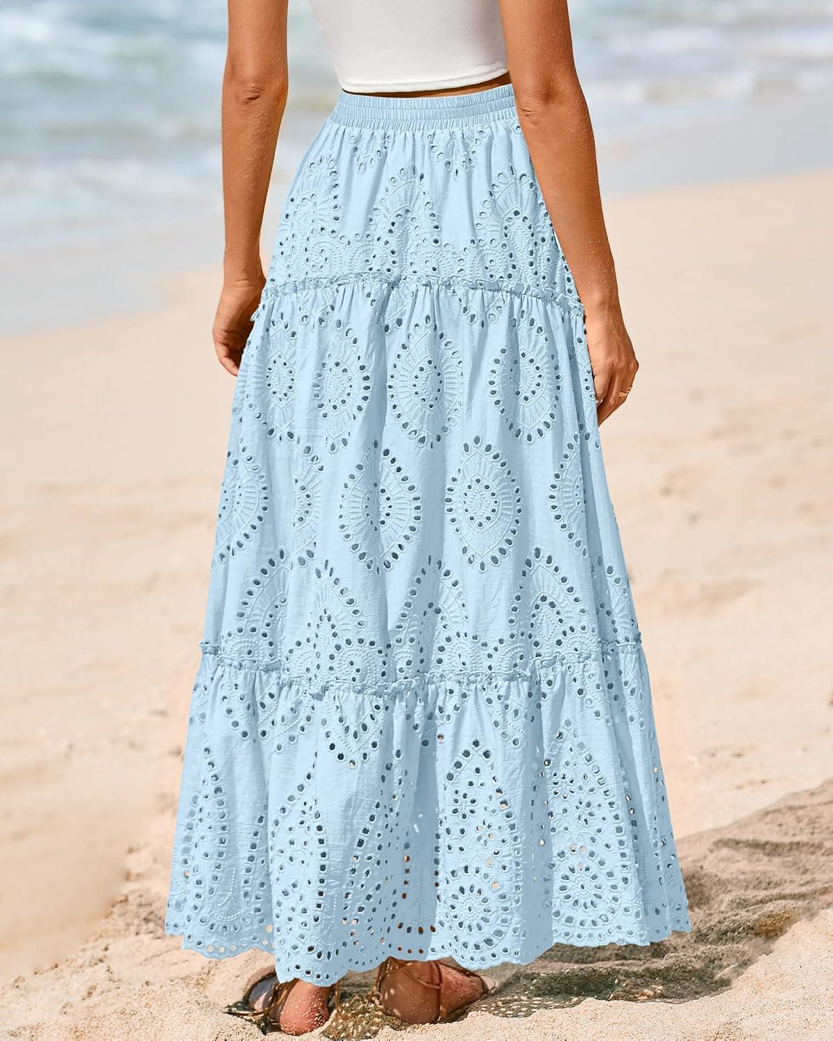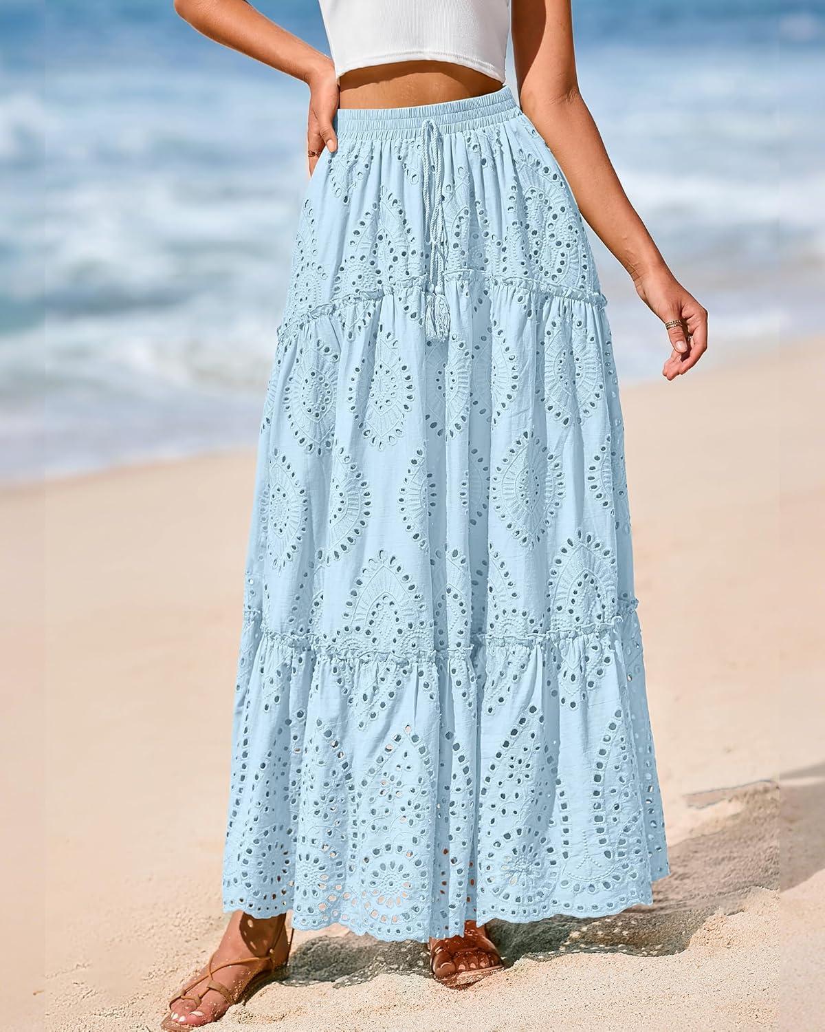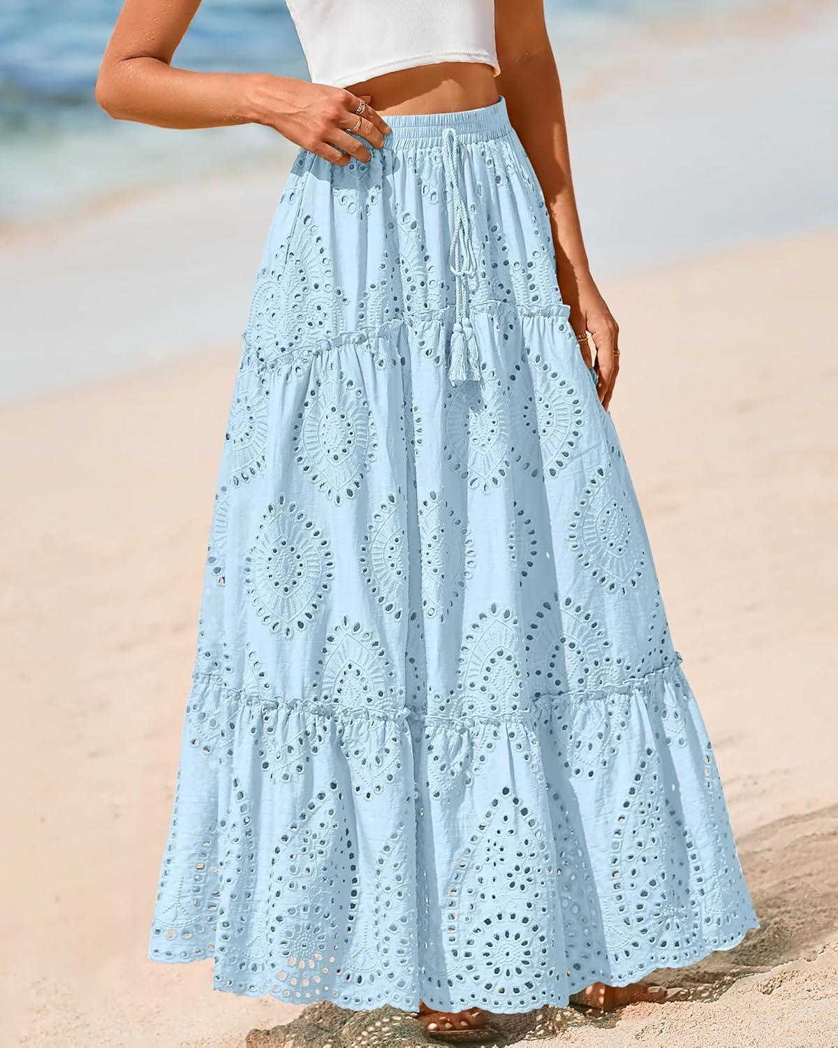BTFBM Boho Long Skirts for Women Spring Summer 2026 Lace Embroidery High Waist Flowy Tiered Maxi Skirt Beach Vacation(Light Blue)
