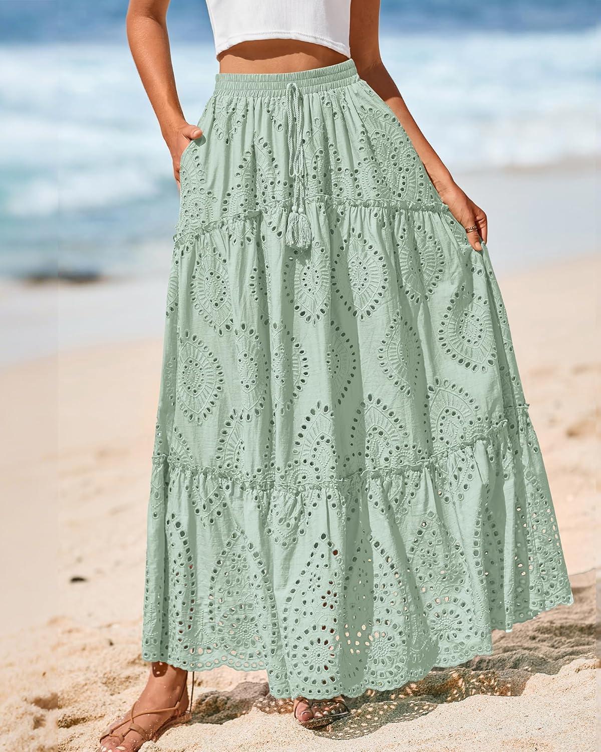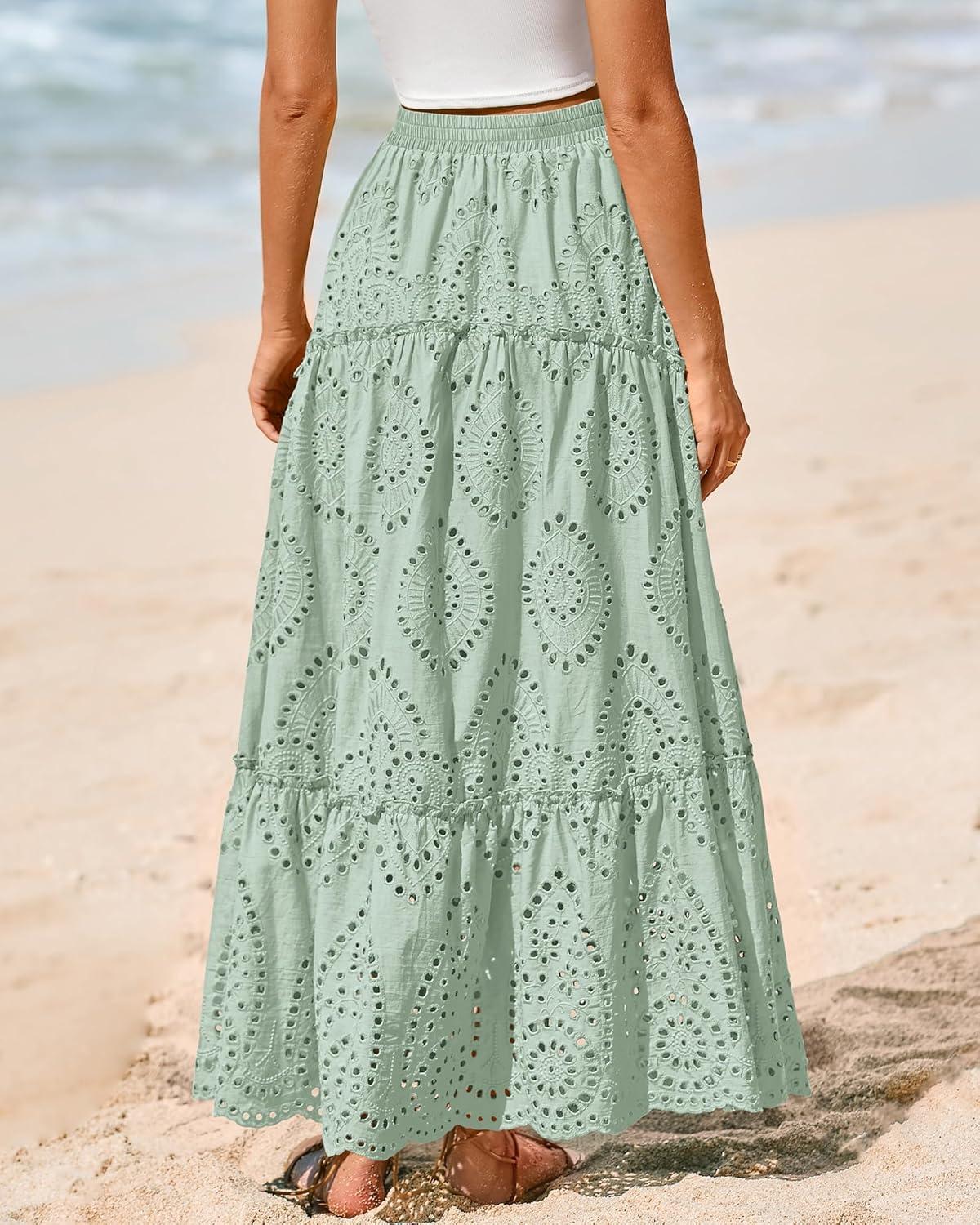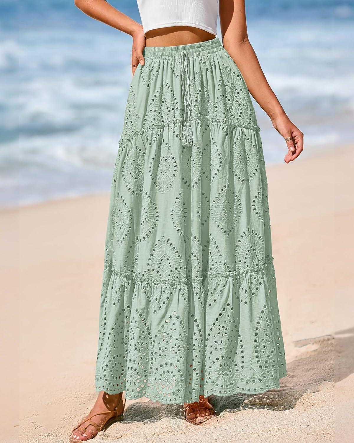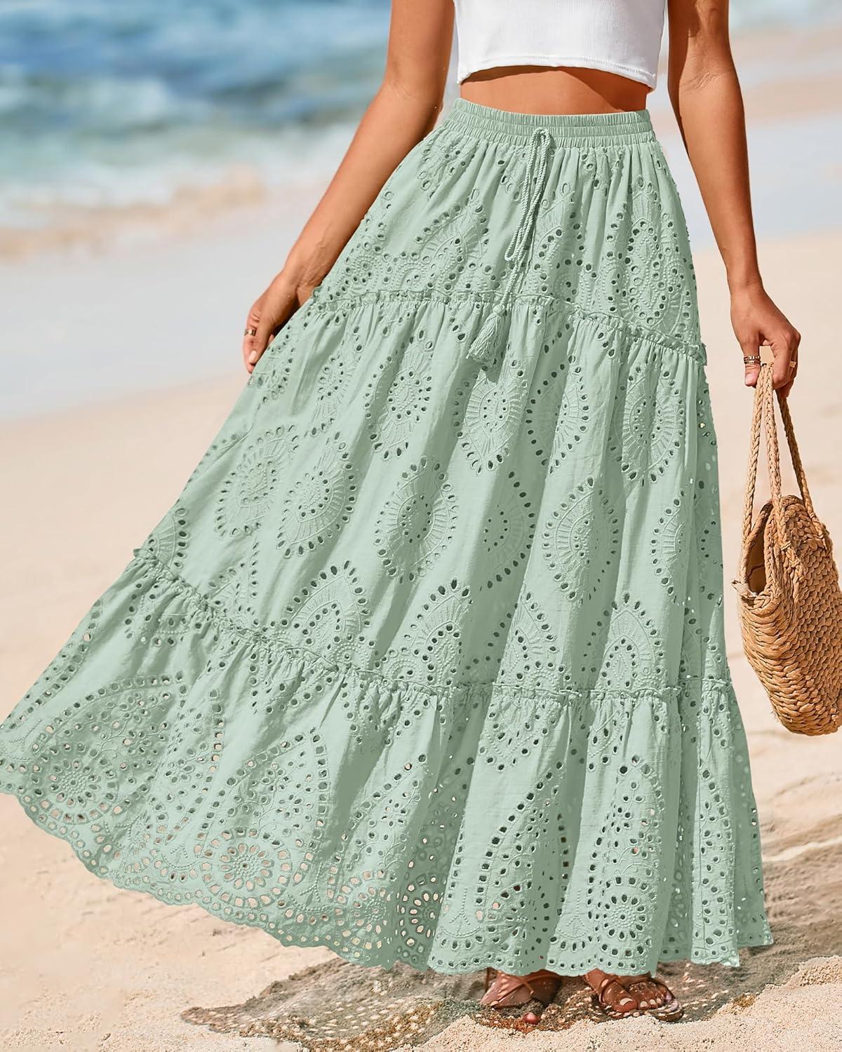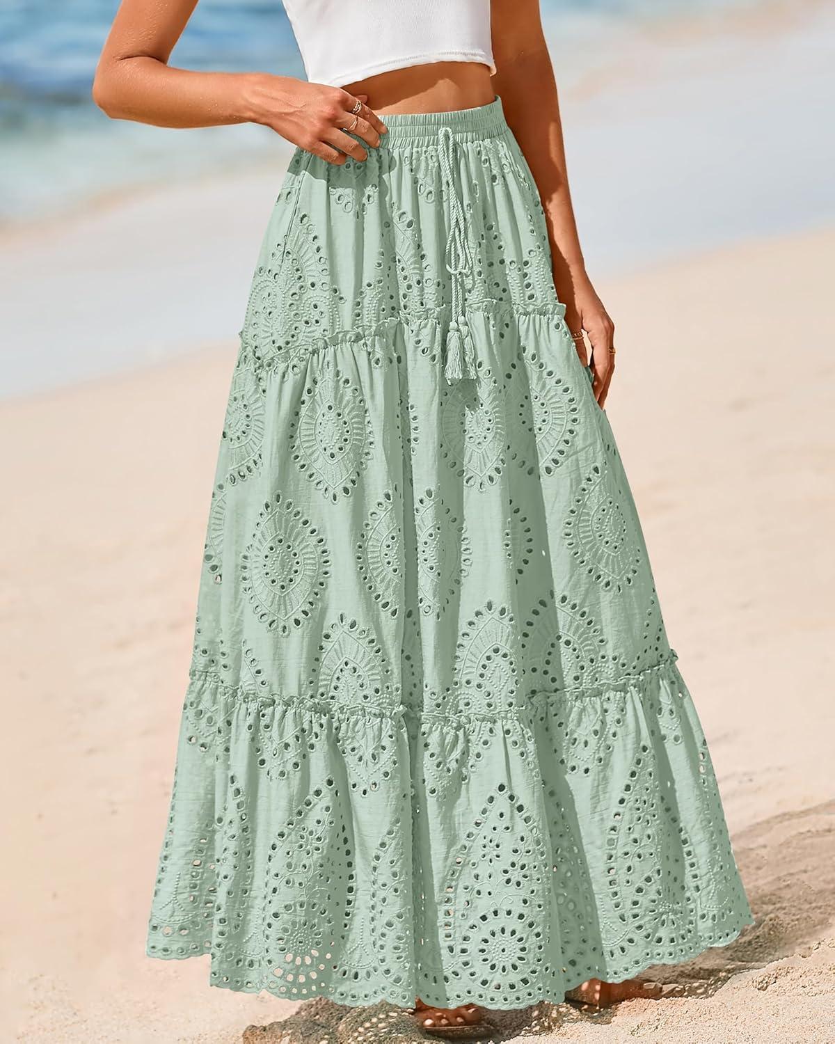 BTFBM Boho Long Skirts for Women Spring Summer 2026 Lace Embroidery High Waist Flowy Tiered Maxi Skirt Beach Vacation(Light Green)