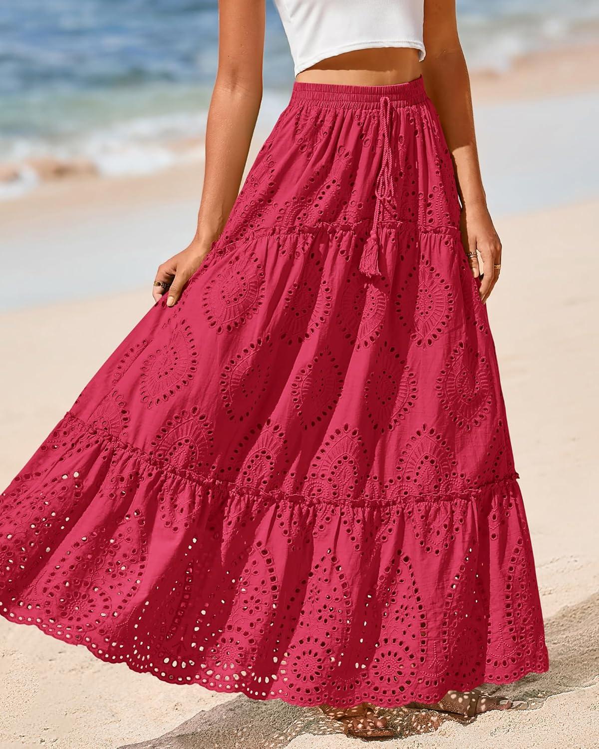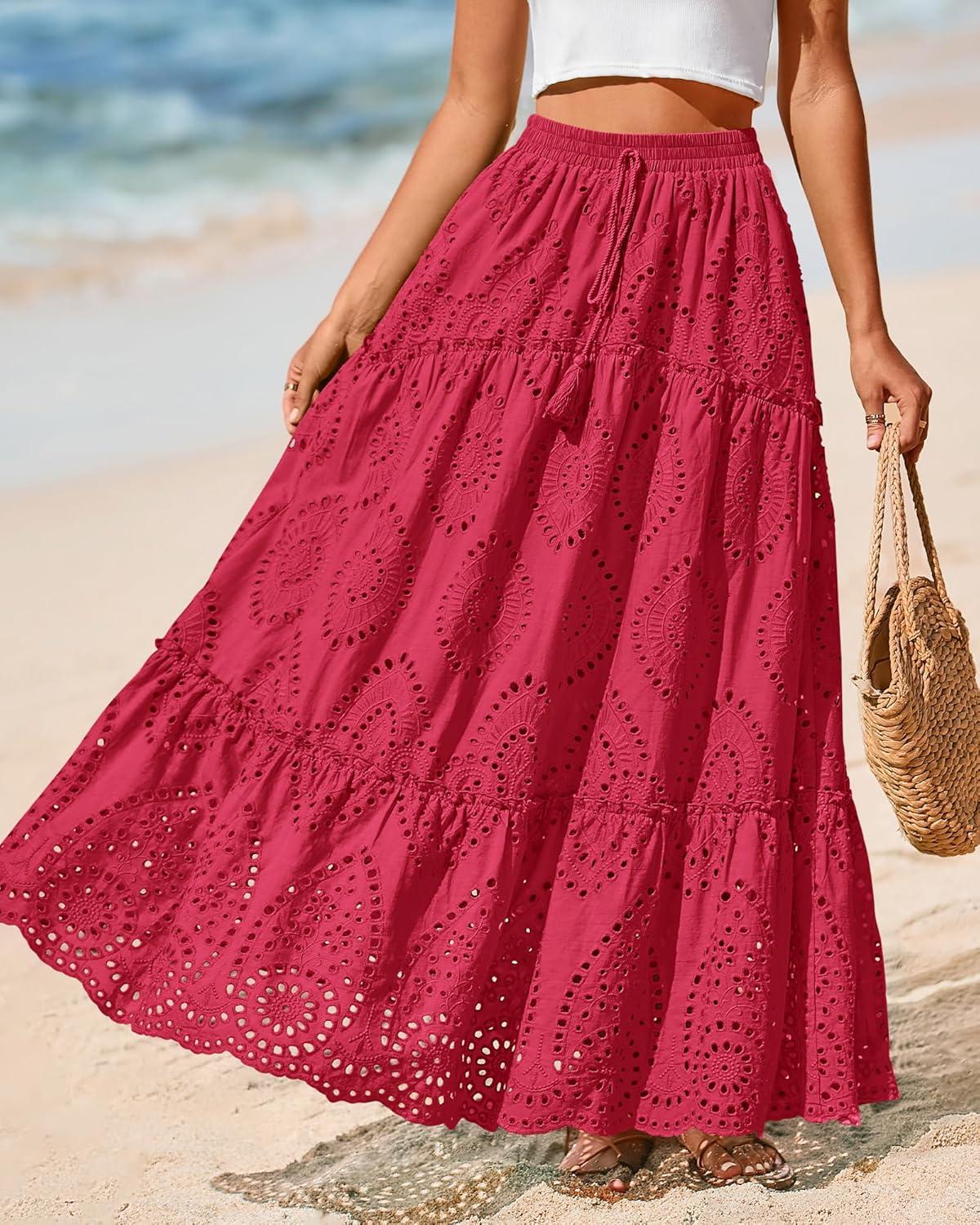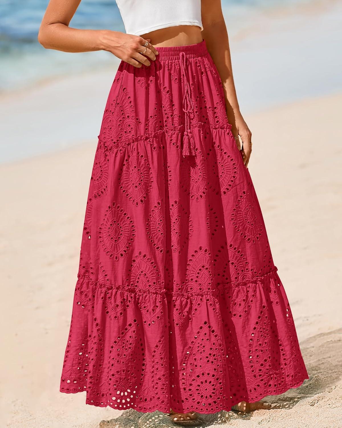 BTFBM Boho Long Skirts for Women Spring Summer 2026 Lace Embroidery High Waist Flowy Tiered Maxi Skirt Beach Vacation(Red)