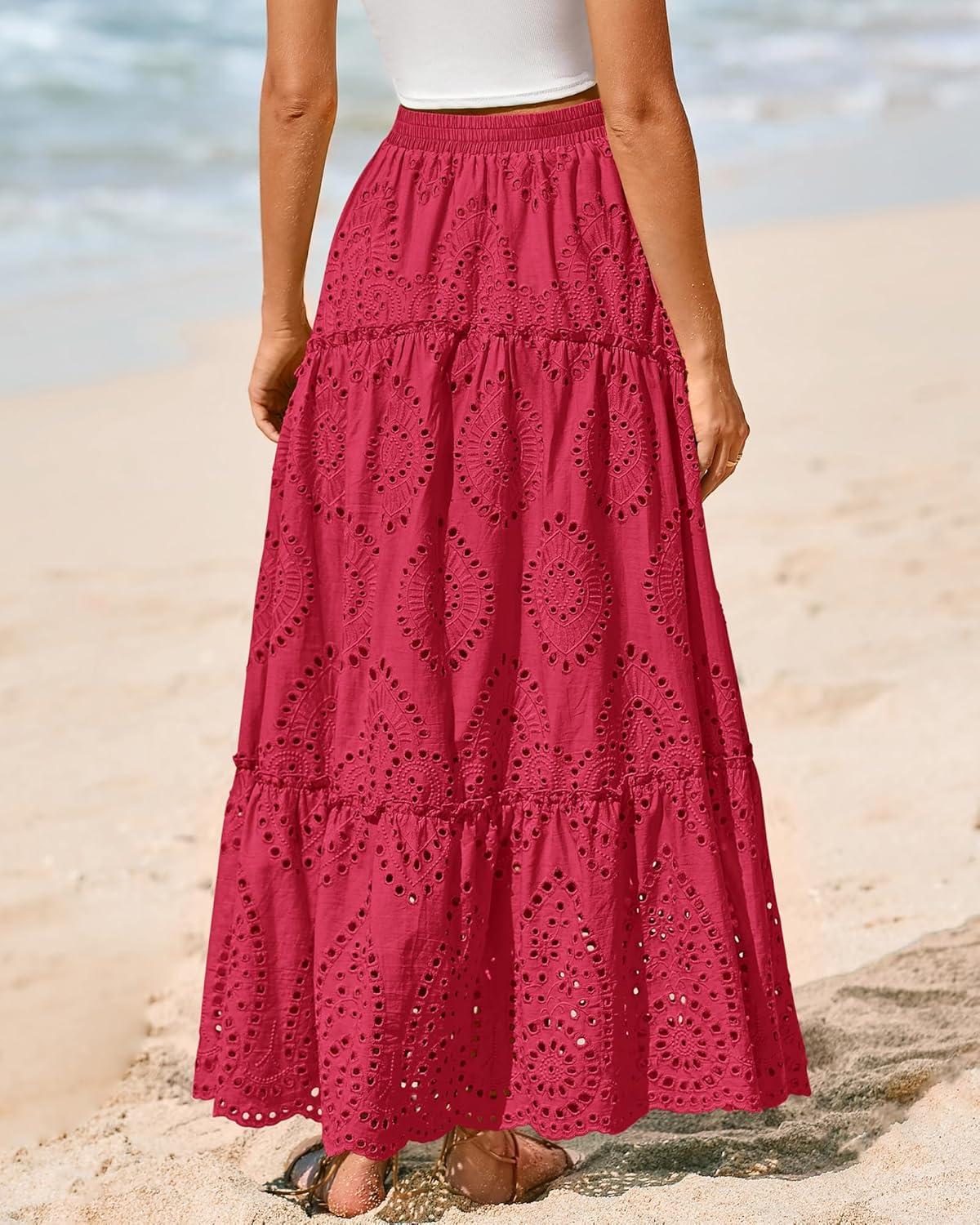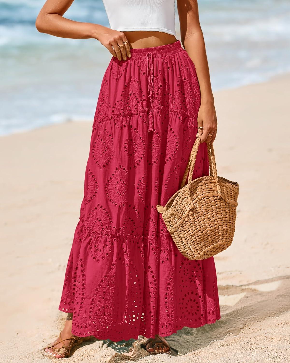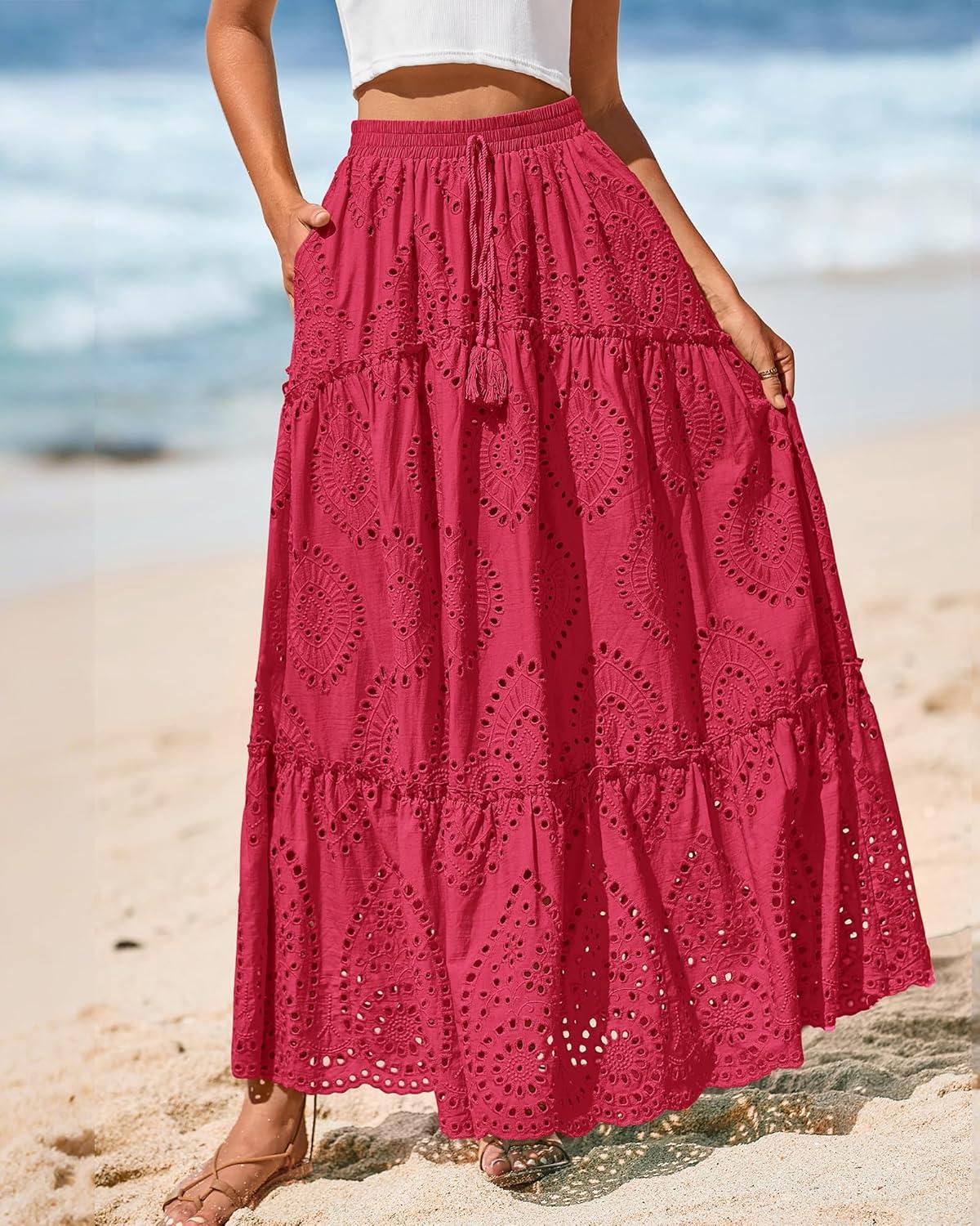 BTFBM Boho Long Skirts for Women Spring Summer 2026 Lace Embroidery High Waist Flowy Tiered Maxi Skirt Beach Vacation(Red)