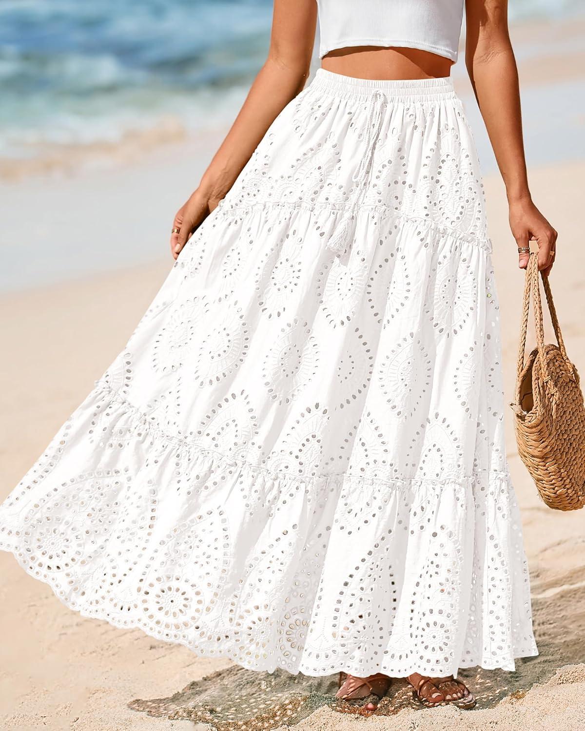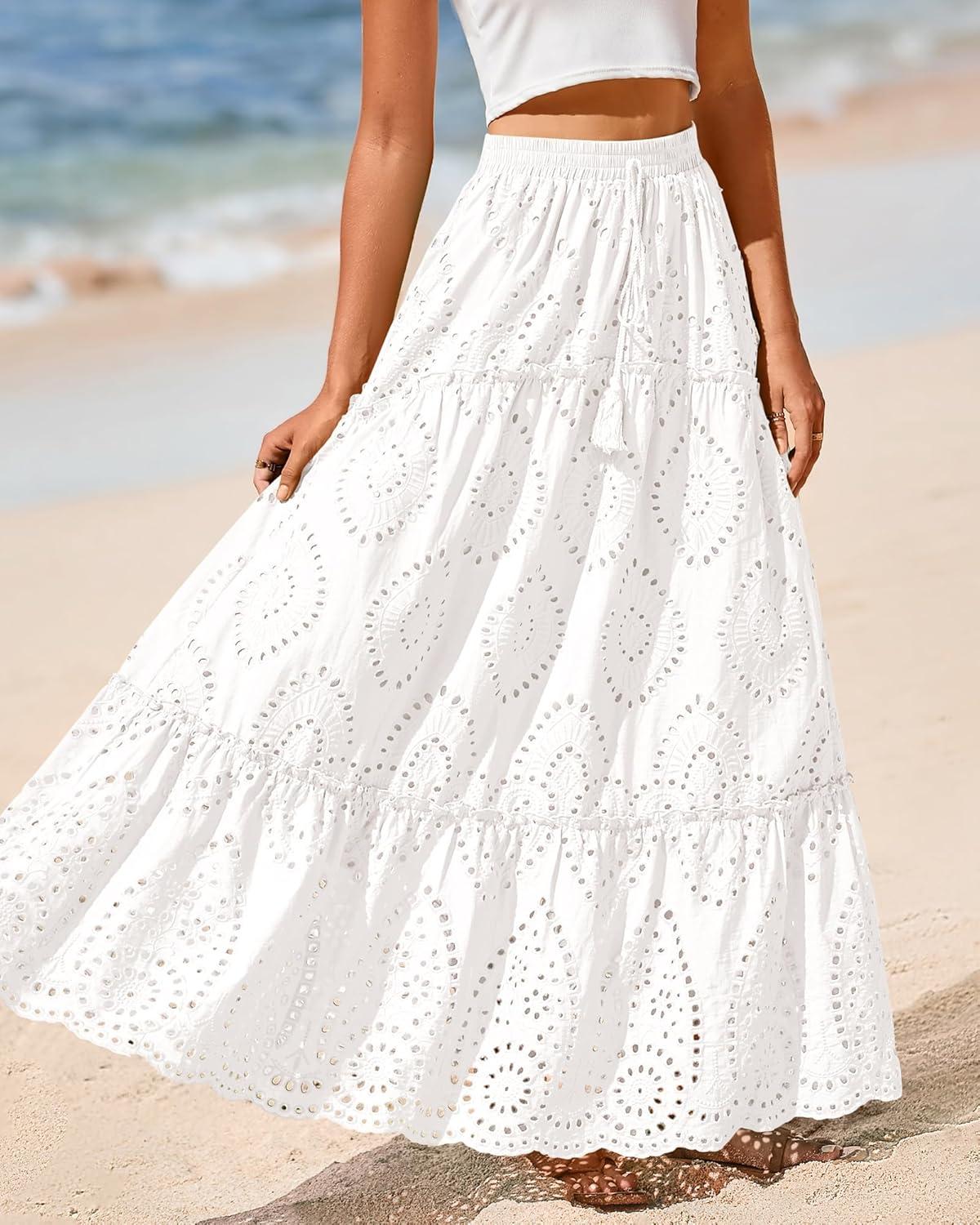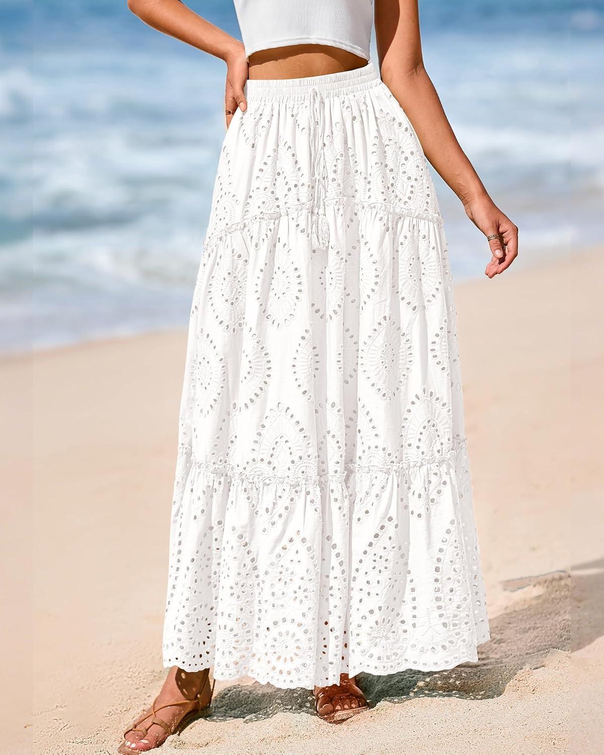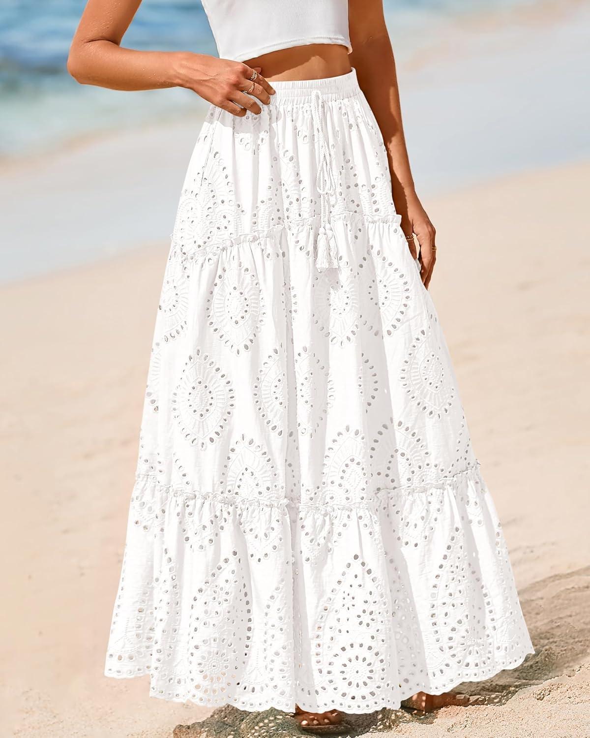 BTFBM Boho Long Skirts for Women Spring Summer 2026 Lace Embroidery High Waist Flowy Tiered Maxi Skirt Beach Vacation(White)