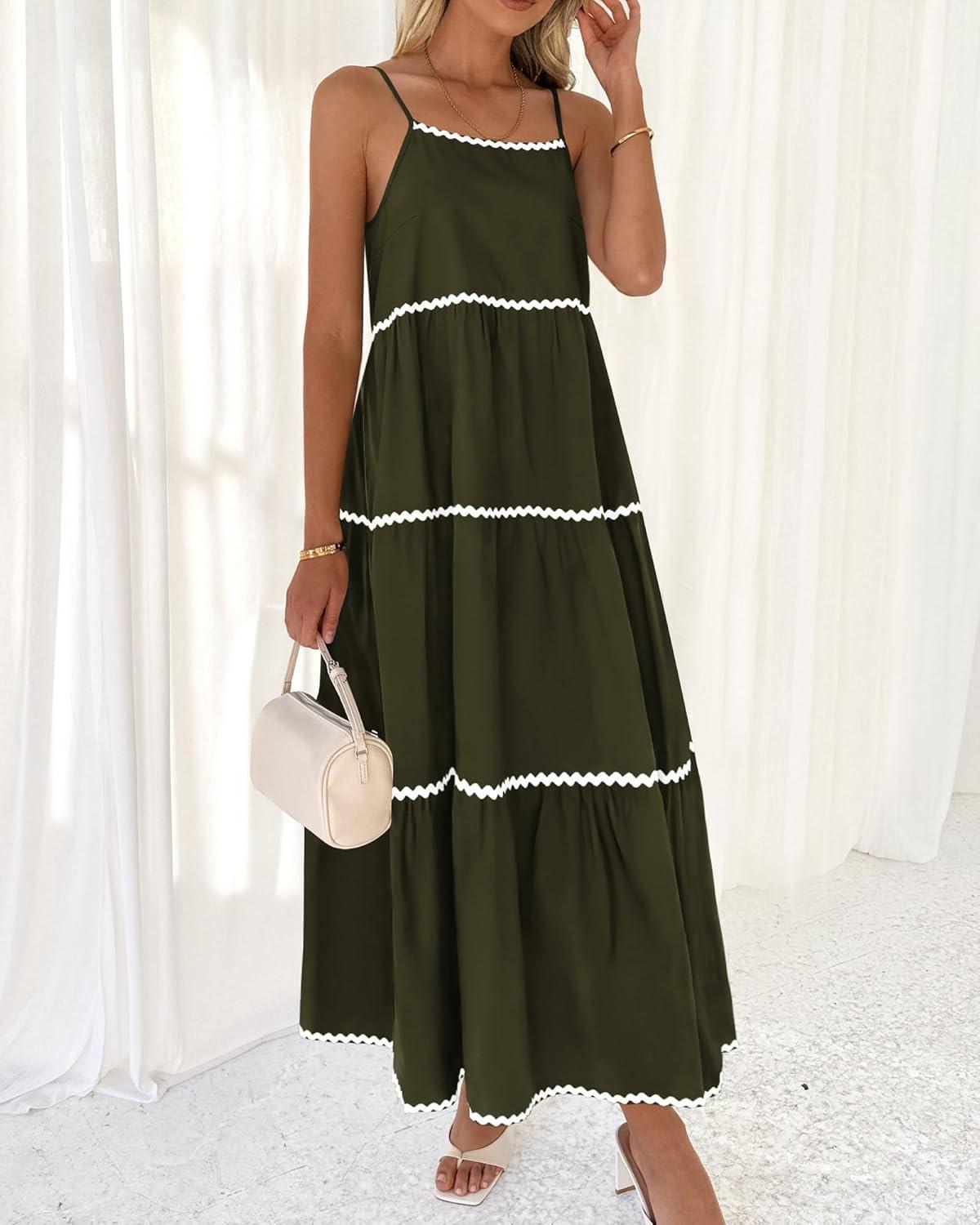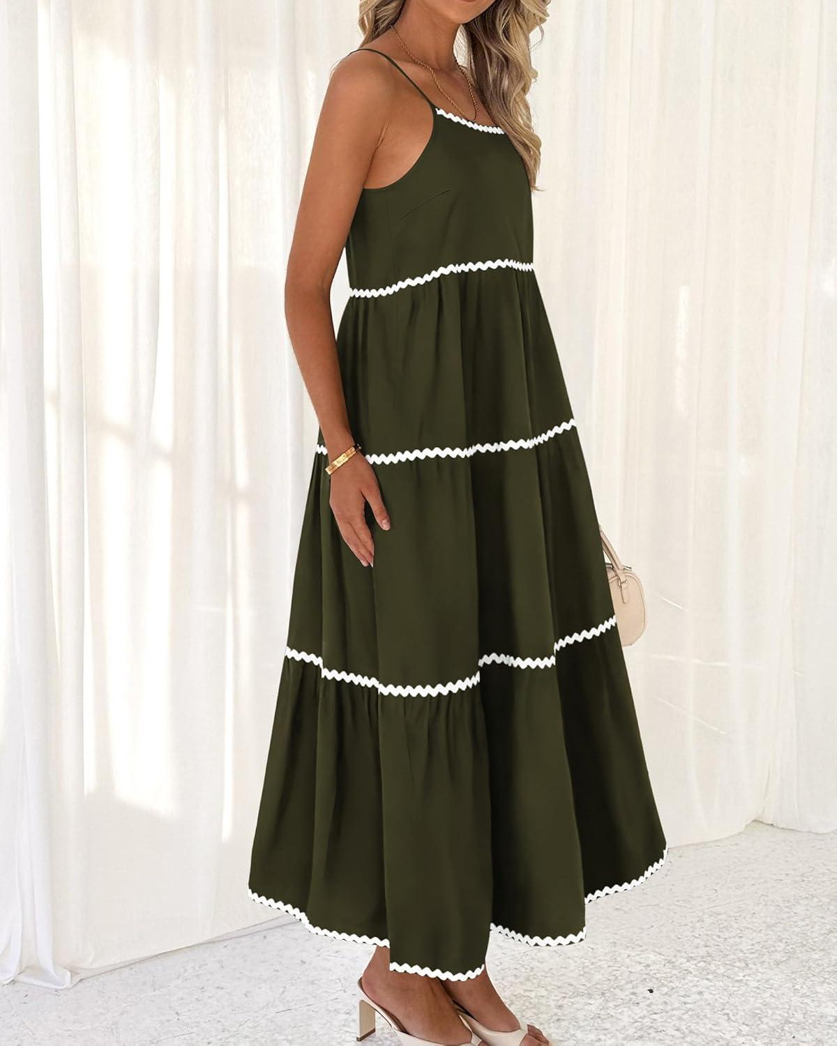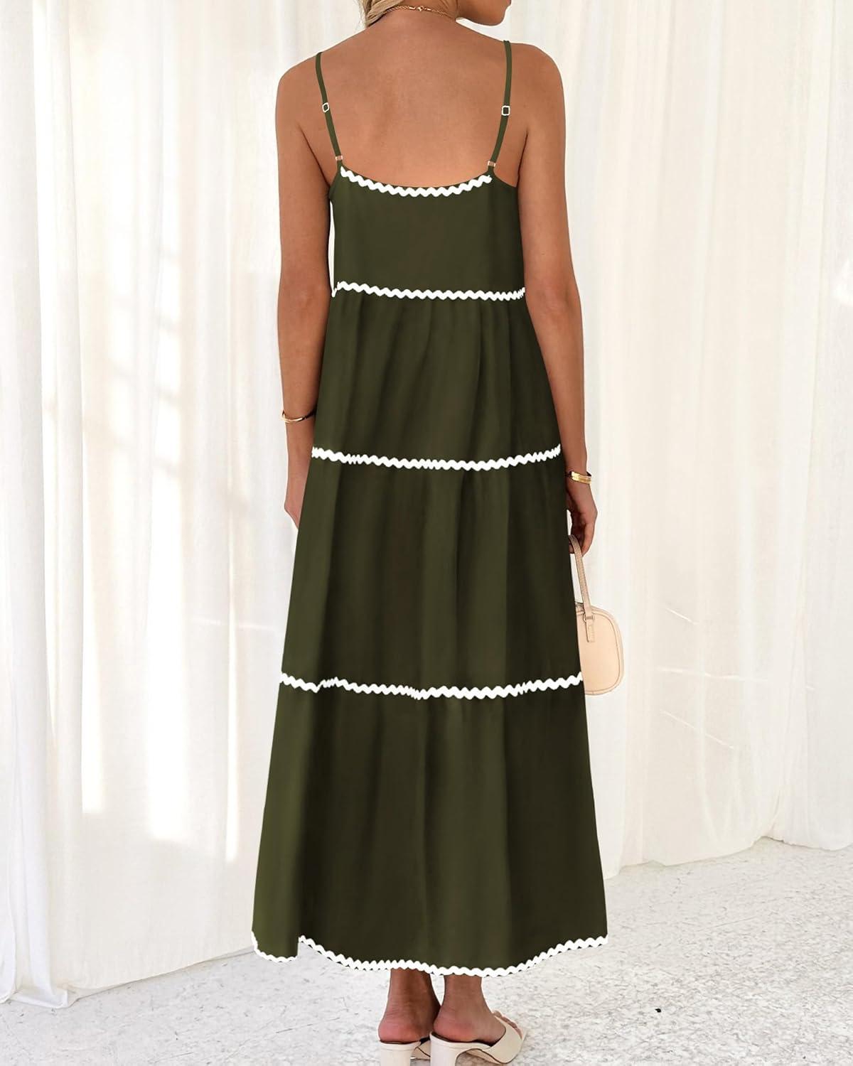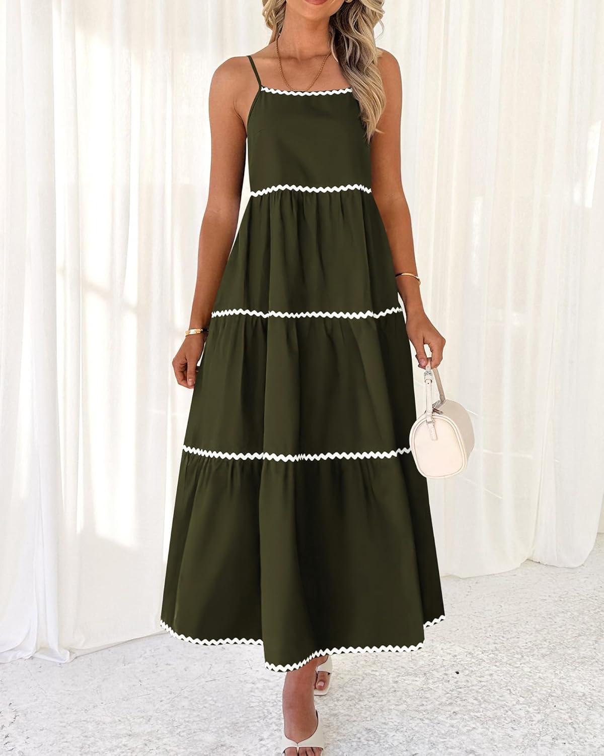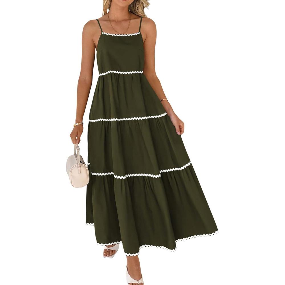 BTFBM Boho Summer Dresses 2025 Spaghetti Strap Backless Sundress RIC Rac Trim Tiered A-Line Long Casual Vacation Dress(Army Green)