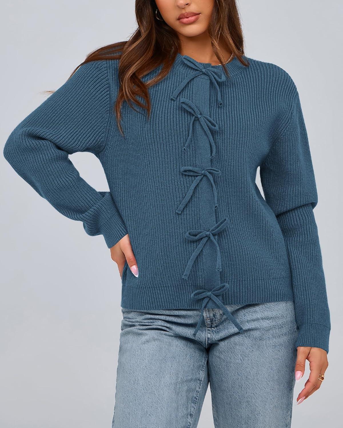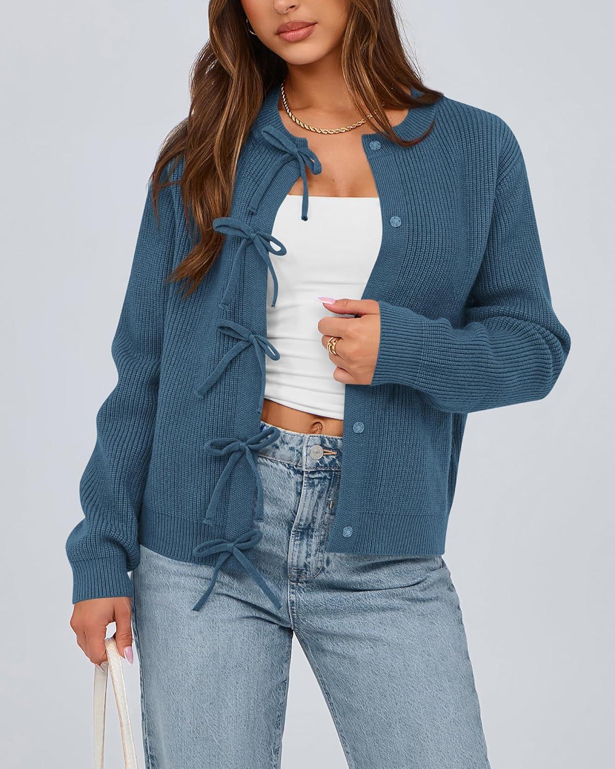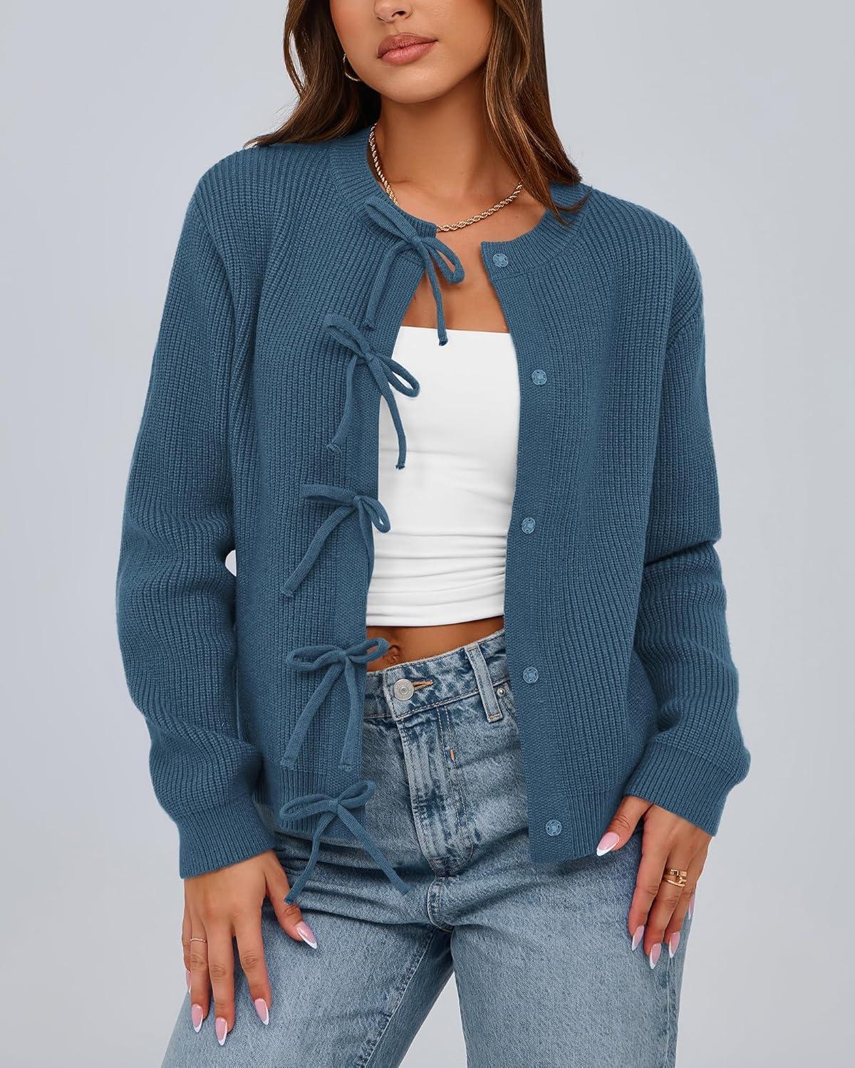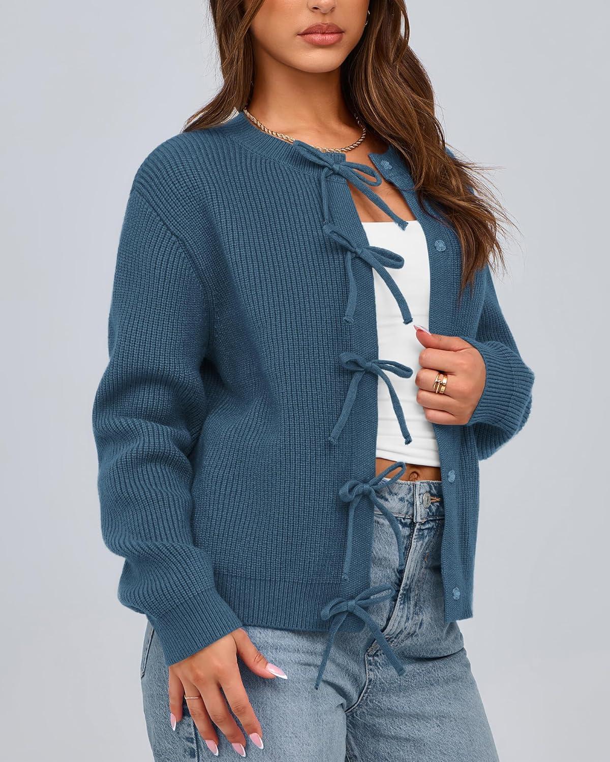 BTFBM Bow Cardigan Sweaters for Women Trendy 2025 Fall Winter Open Front Long Sleeve Button Down Cropped Lady Jacket(Blue)