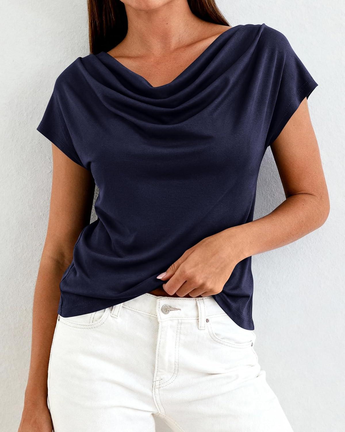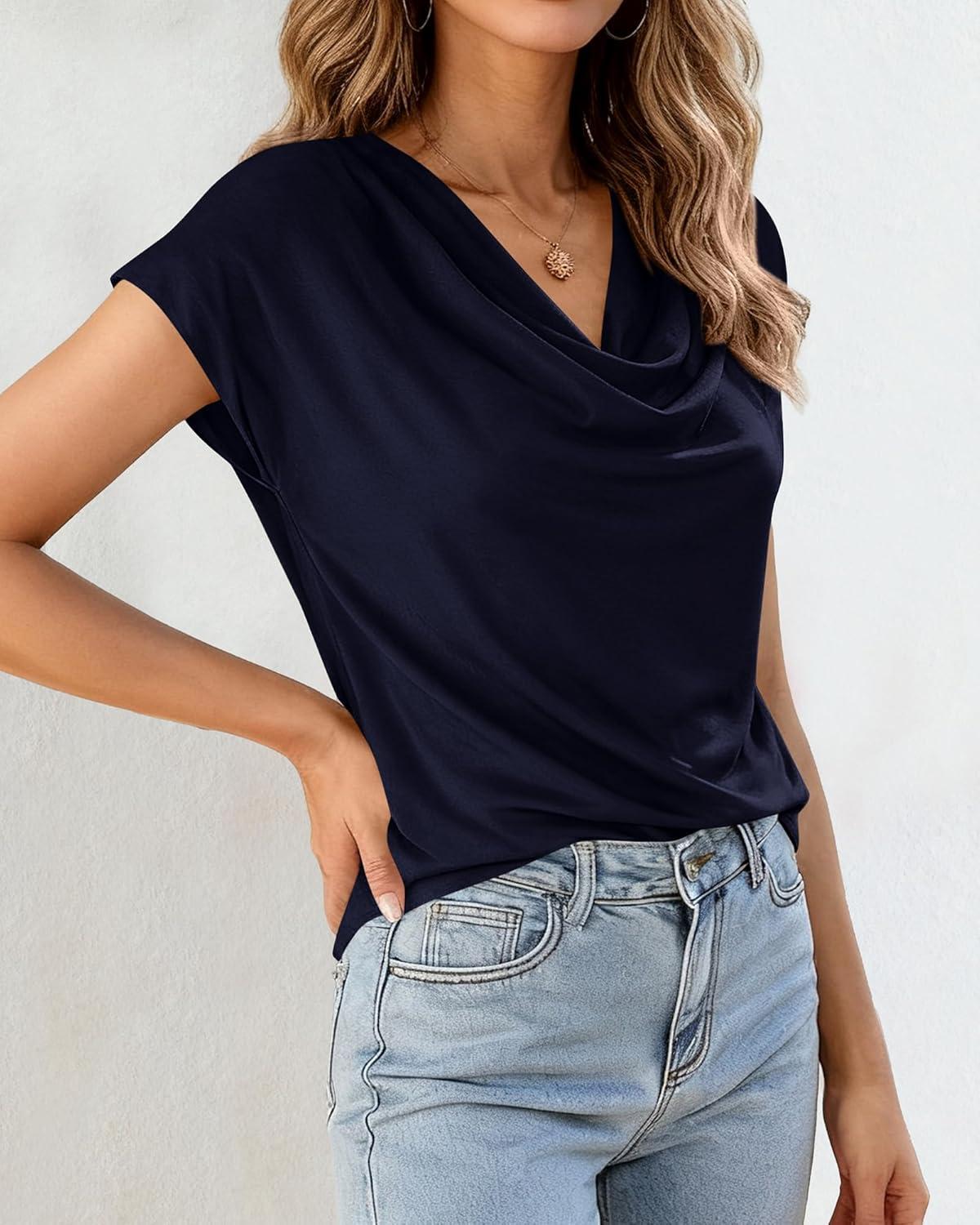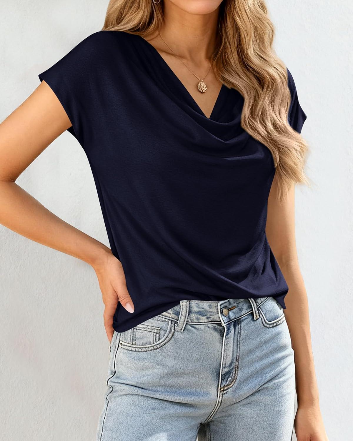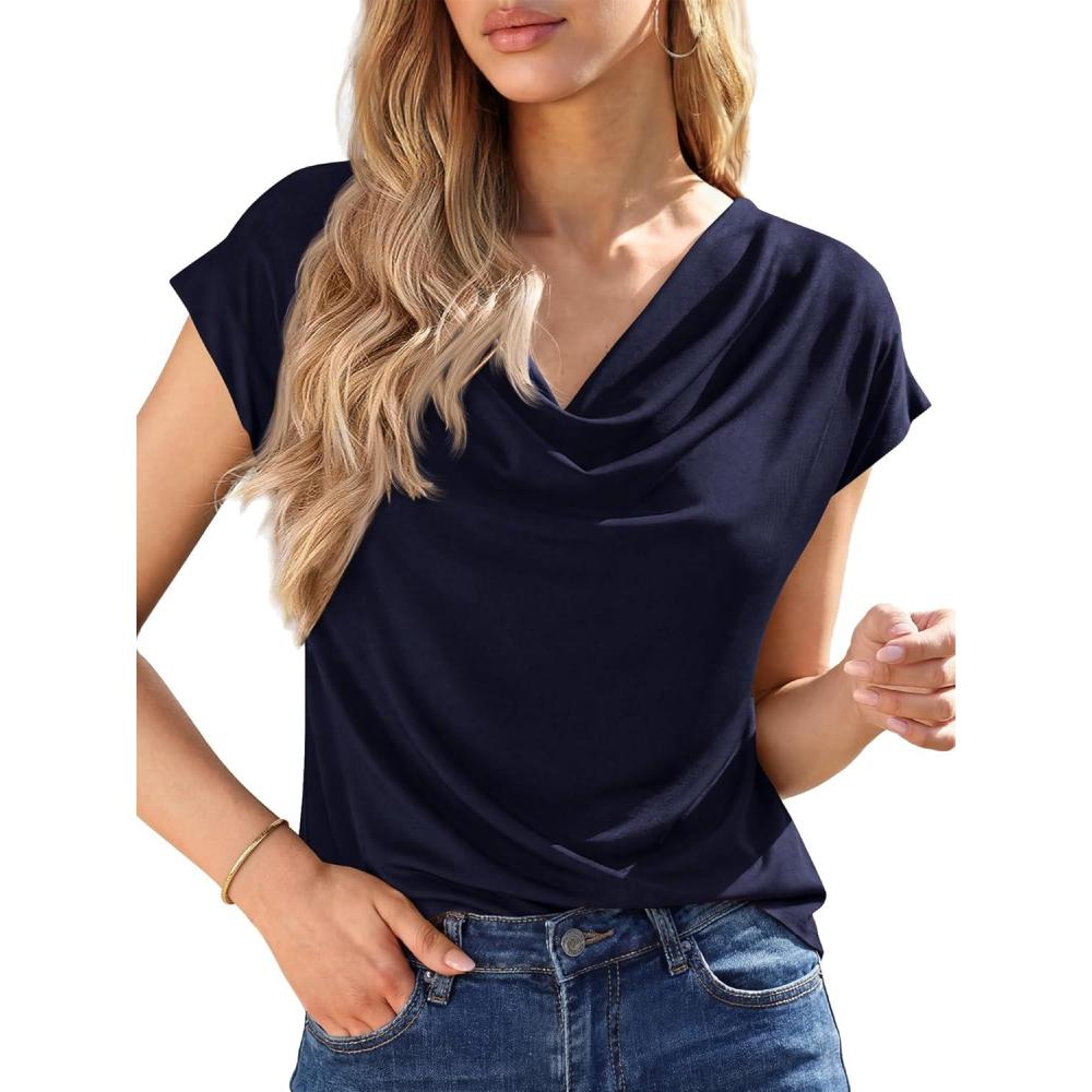 BTFBM Cowl Neck Tops for Women 2026 Spring Womens Tops Dressy Casual Business Blouses Short Sleeve Shirts Summer Outfits(Navy Blue)