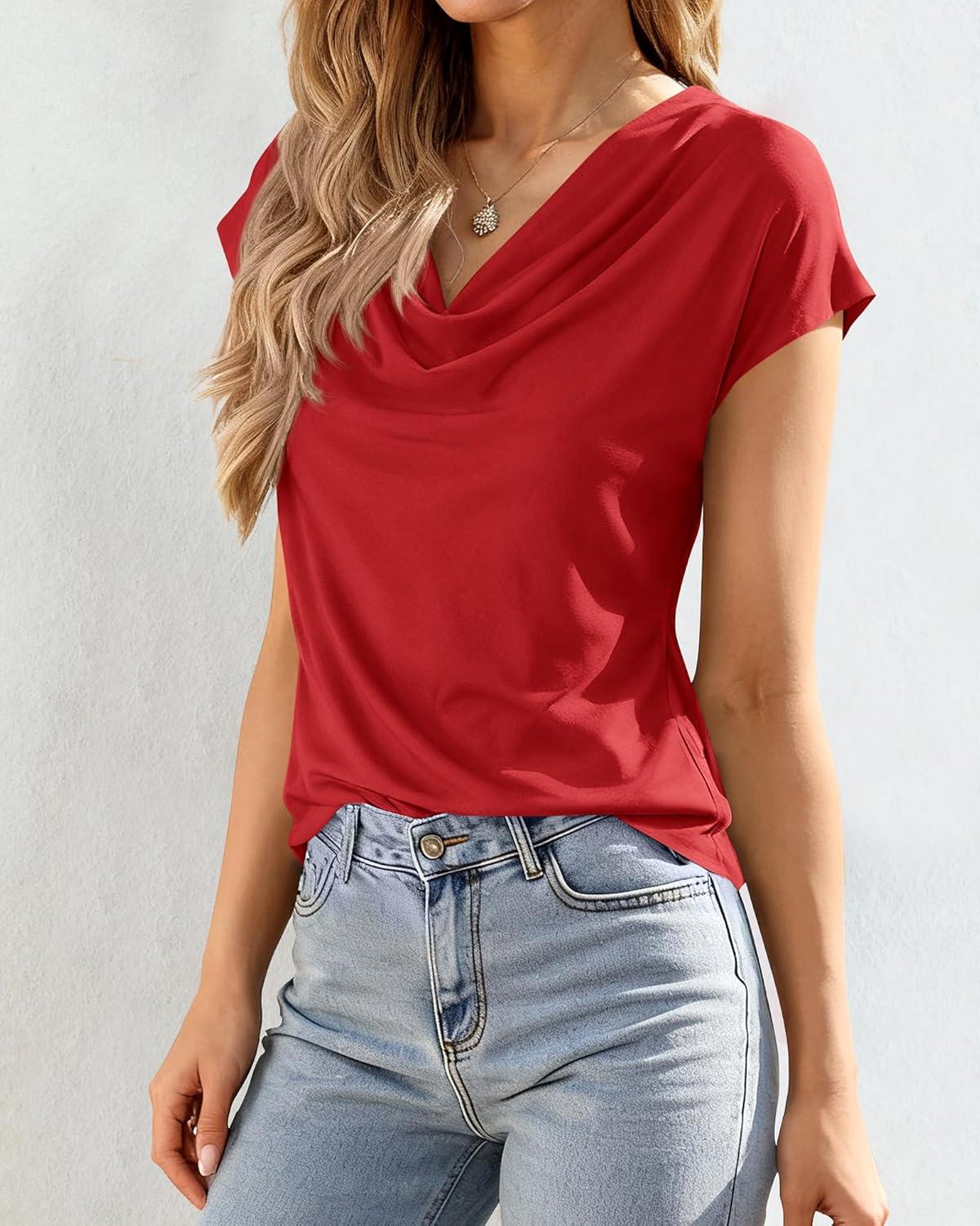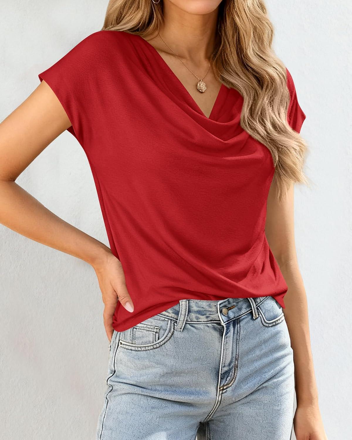 BTFBM Cowl Neck Tops for Women 2026 Spring Womens Tops Dressy Casual Business Blouses Short Sleeve Shirts Summer Outfits(Red)