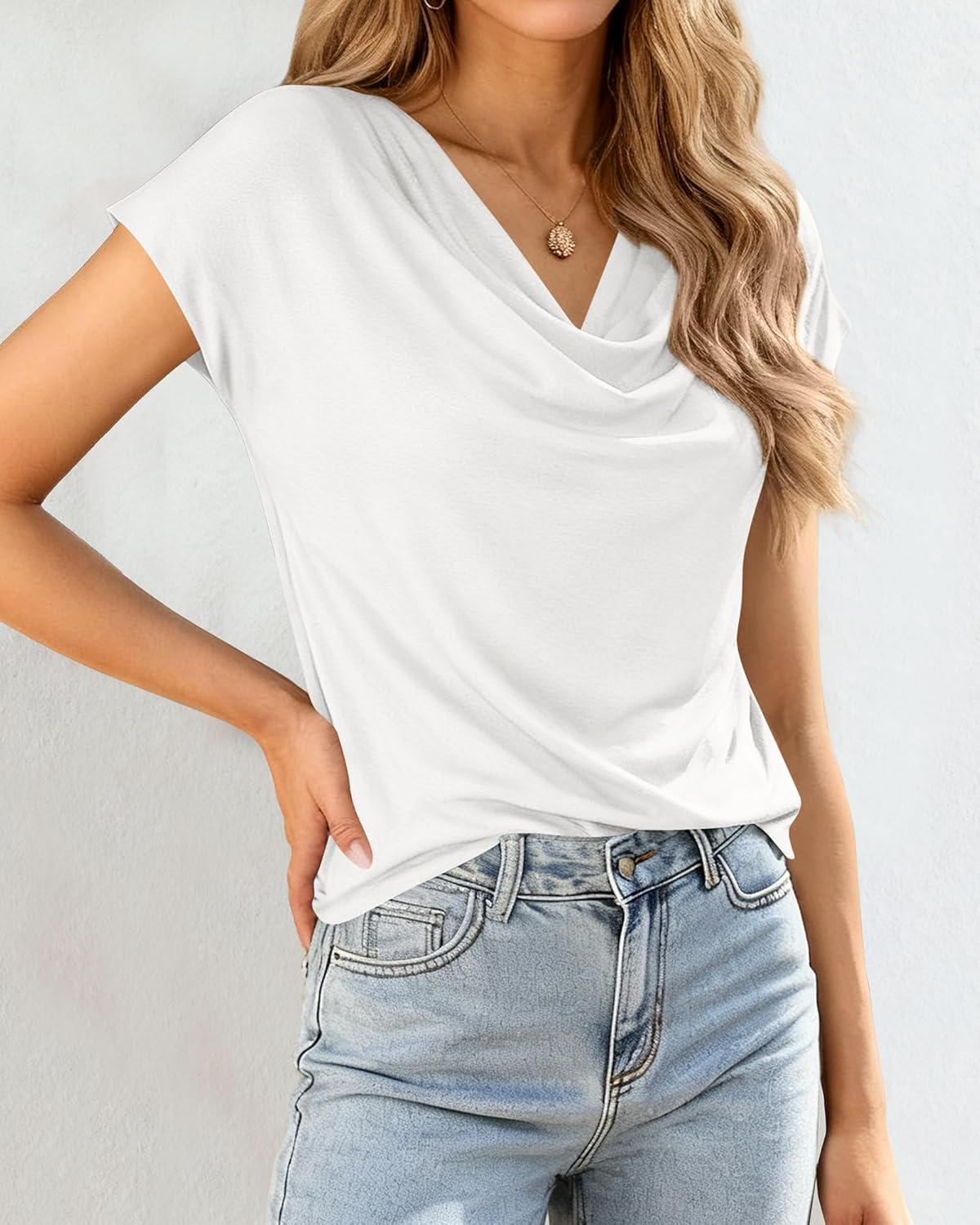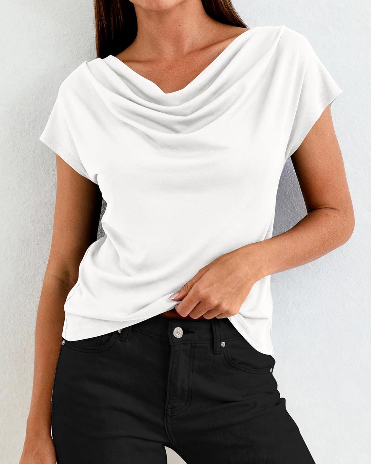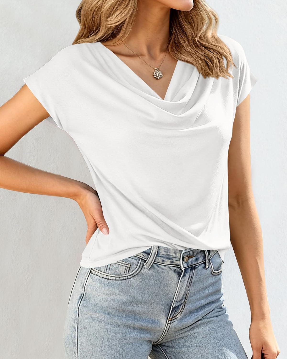 BTFBM Cowl Neck Tops for Women 2026 Spring Womens Tops Dressy Casual Business Blouses Short Sleeve Shirts Summer Outfits(White)