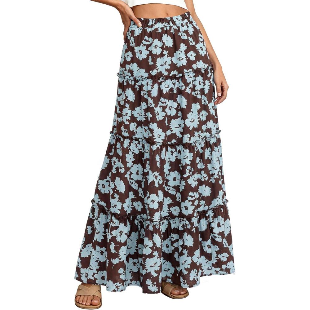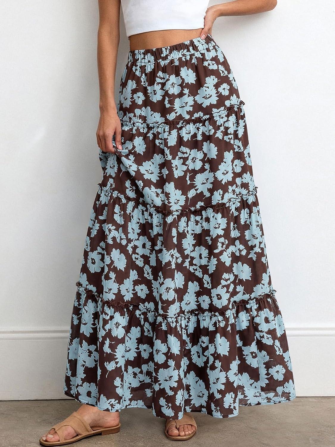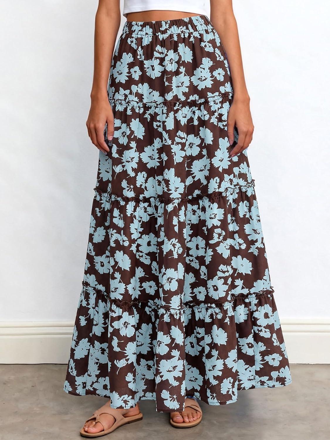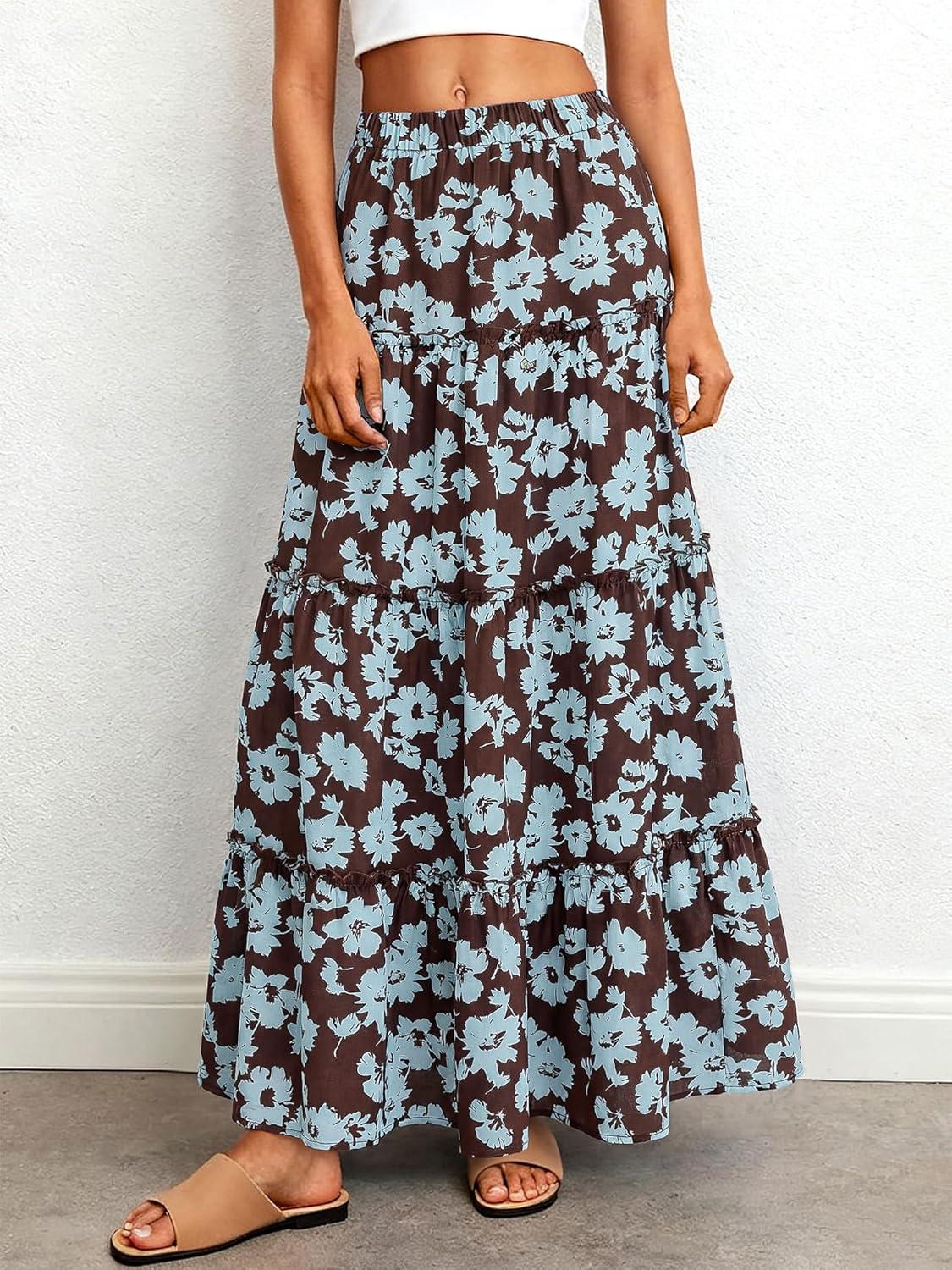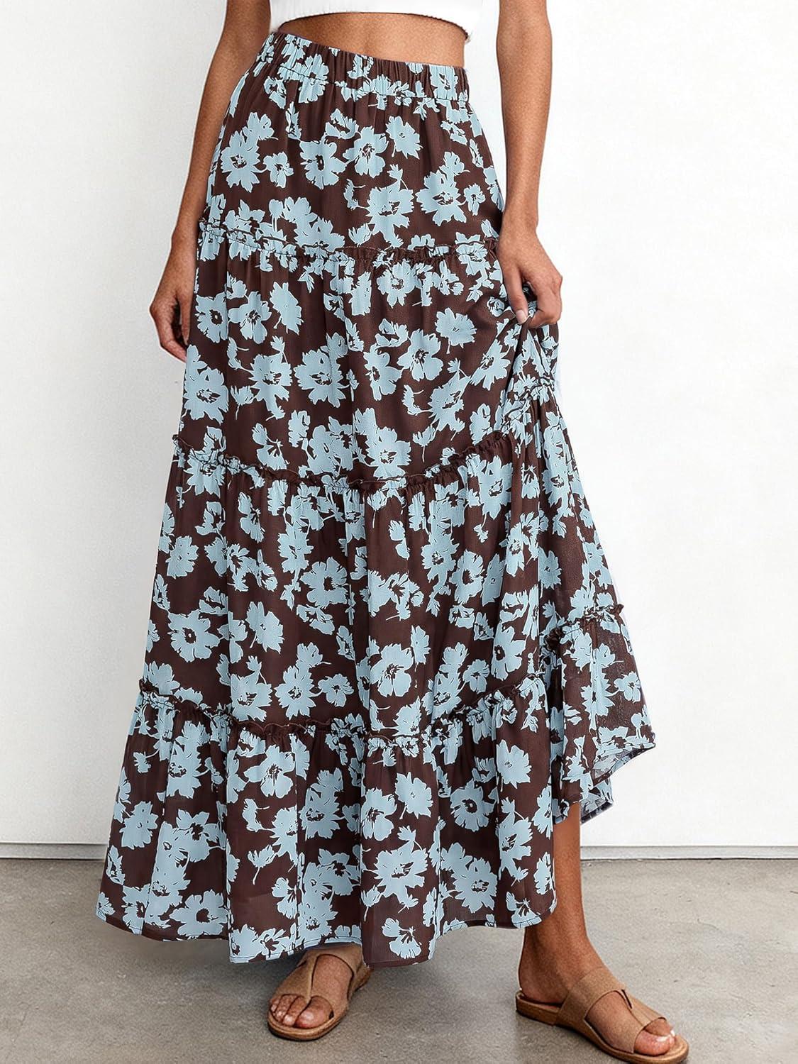 BTFBM Floral Maxi Skirts for Women Summer Spring 2026 Elastic Waist Tiered Flowy Beach Vacation Boho Midi Long Skirt(Floral Brown Light Blue)