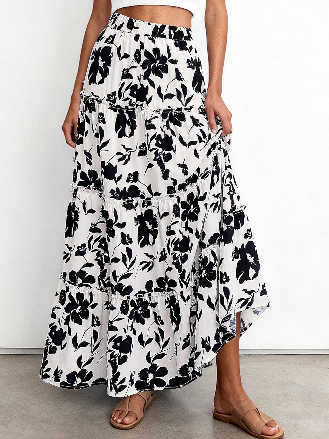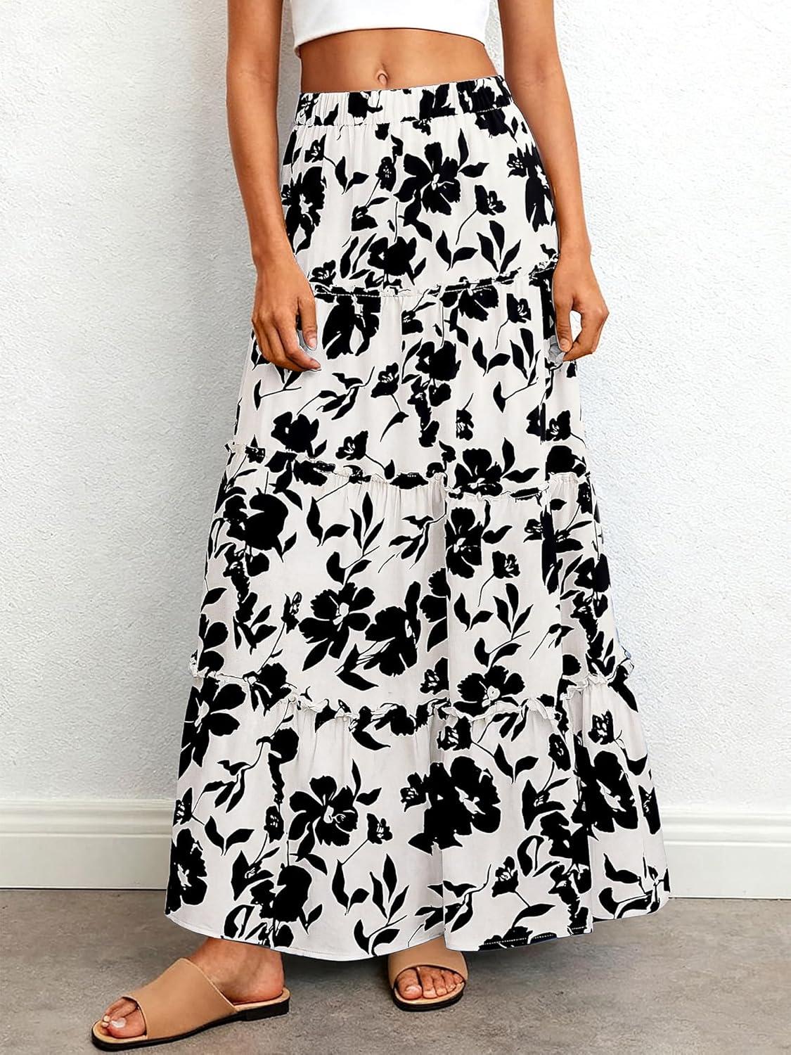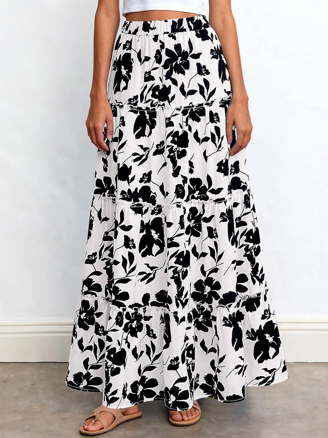 BTFBM Floral Maxi Skirts for Women Summer Spring 2026 Elastic Waist Tiered Flowy Beach Vacation Boho Midi Long Skirt(Floral White Black)