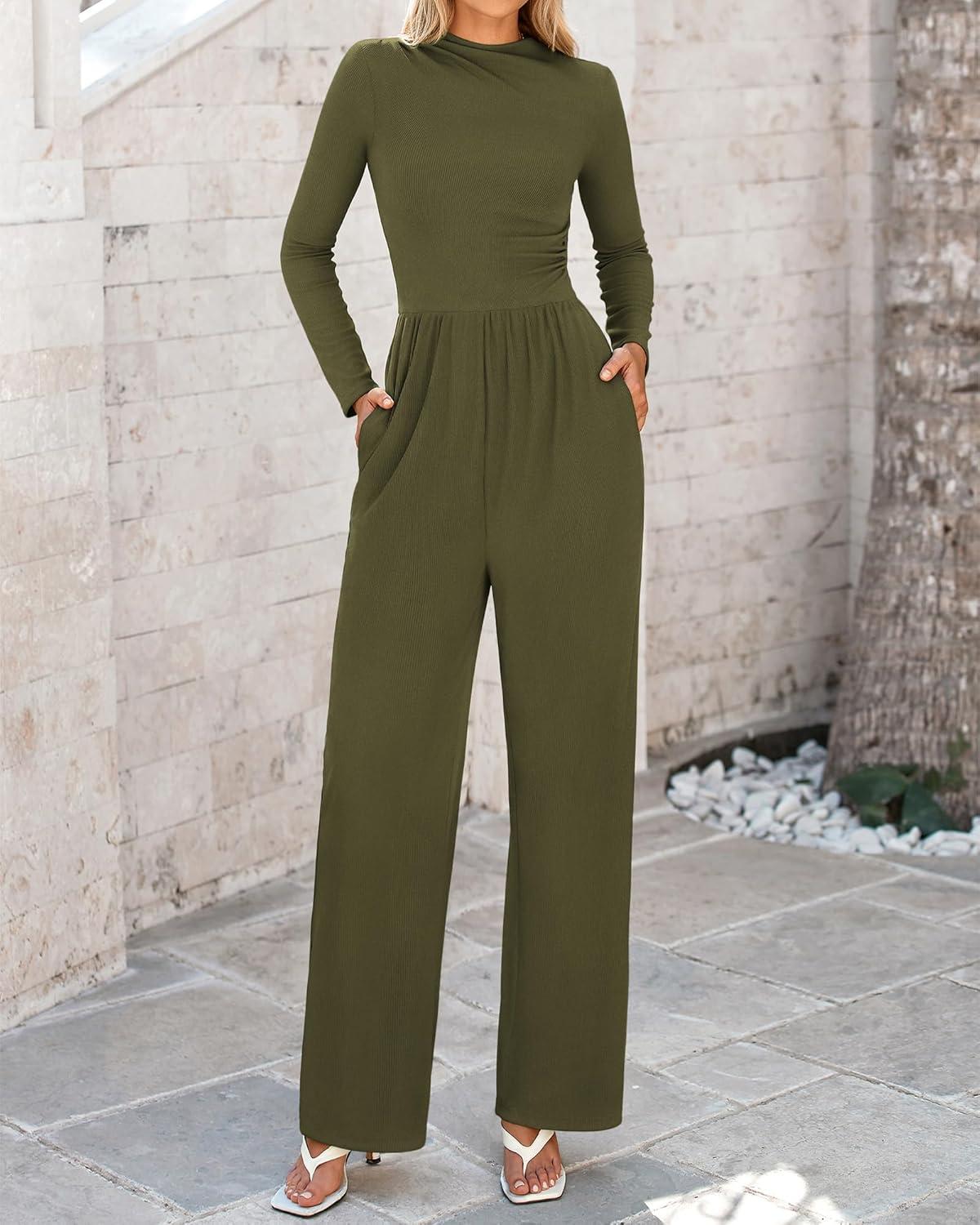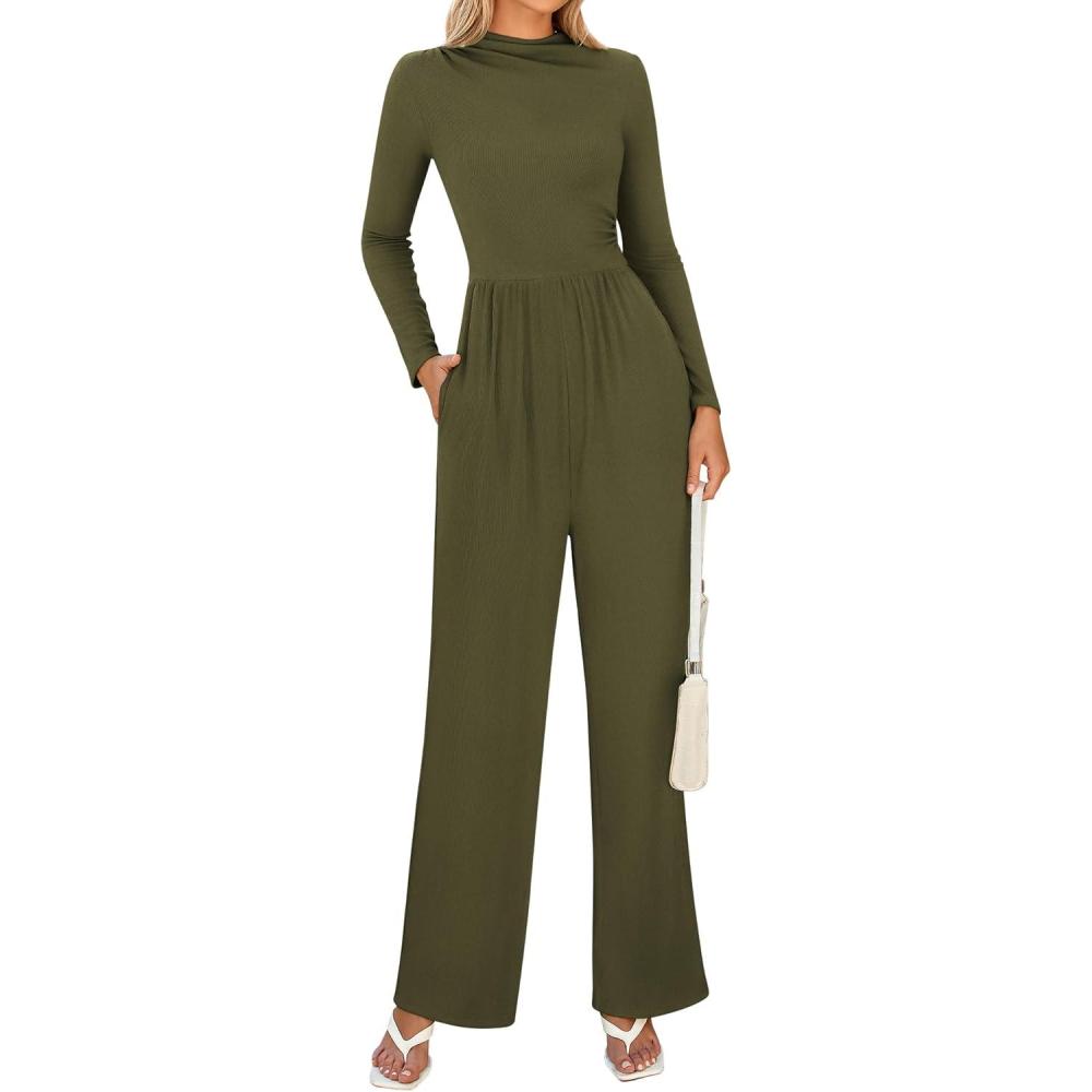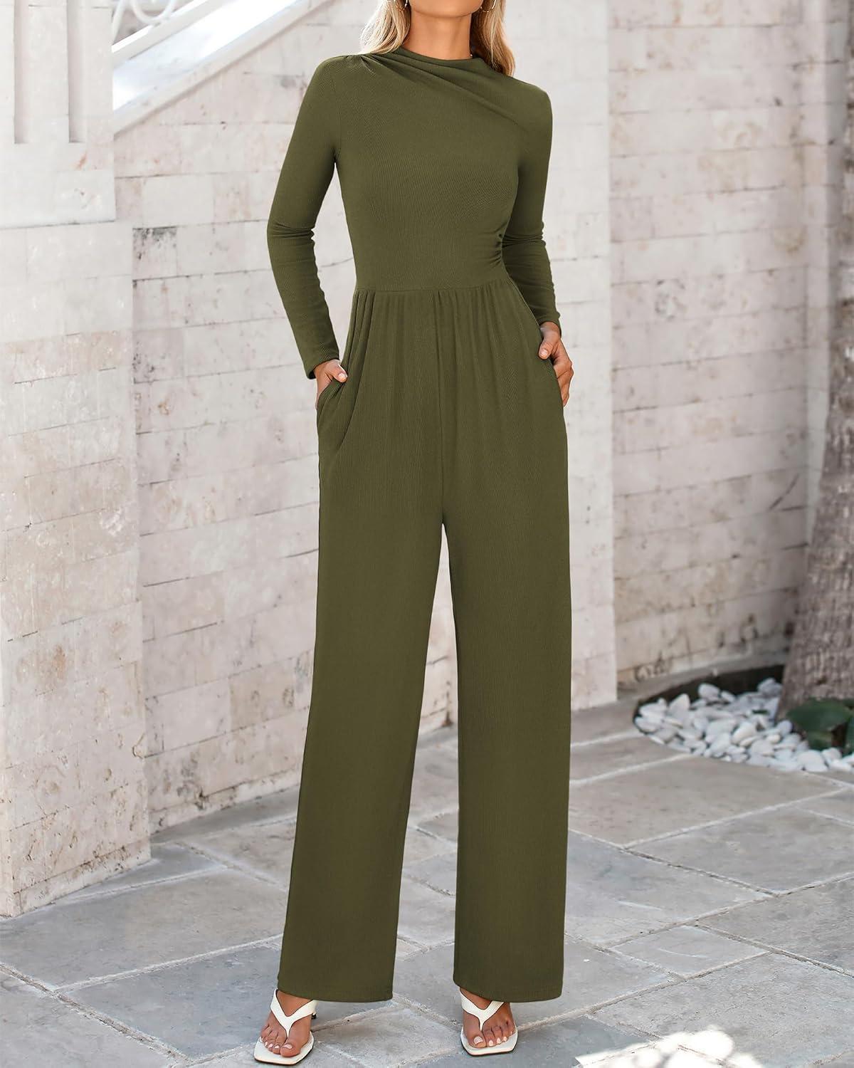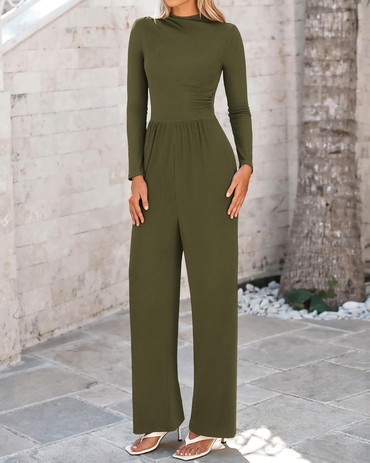 BTFBM Jumpsuits For Women Dressy Long Sleeve Wide Pants Rompers Mock Neck Ruched 2025 Casual Spring One Piece Jumpsuit(Solid Army Green)