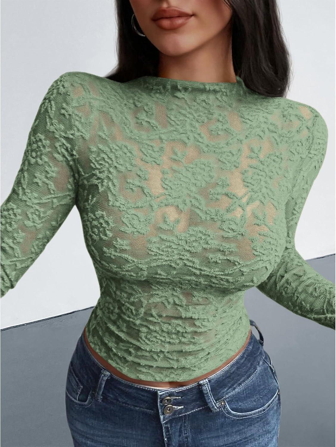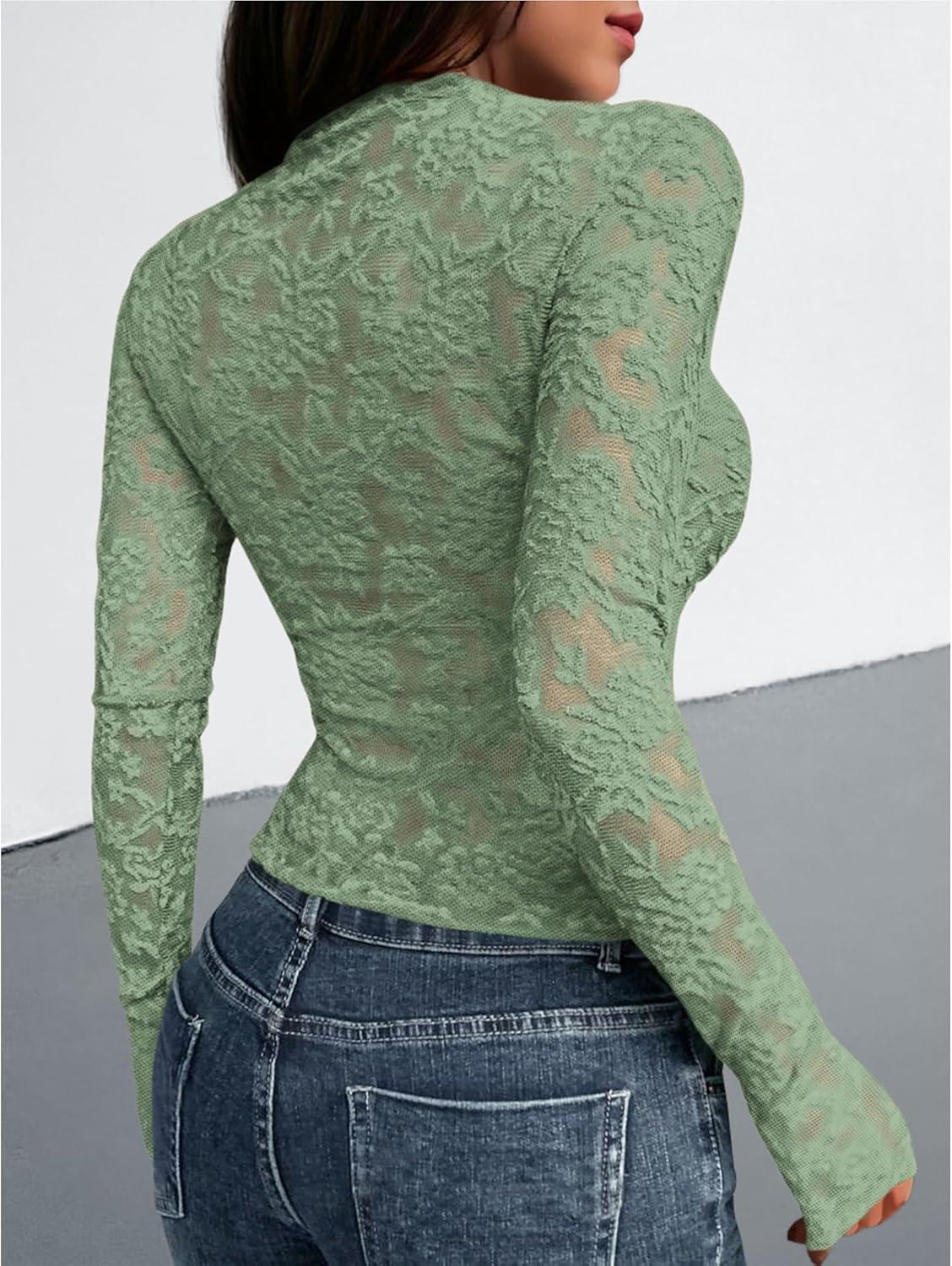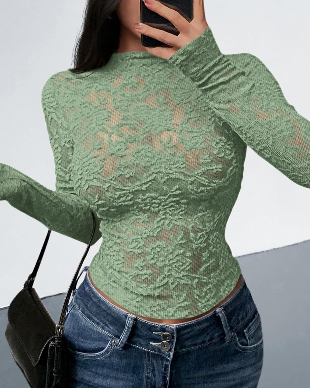 BTFBM Mesh Long Sleeve Tops for Women Lace Sexy Sheer Tight See Through Crew Neck Spring Fall 2026 Party Club Outfits(Light Green)