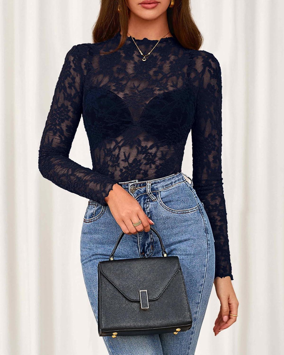 BTFBM Mesh Long Sleeve Tops for Women Lace Sexy Sheer Tight See Through Crew Neck Spring Fall 2026 Party Club Outfits(Navy Blue)