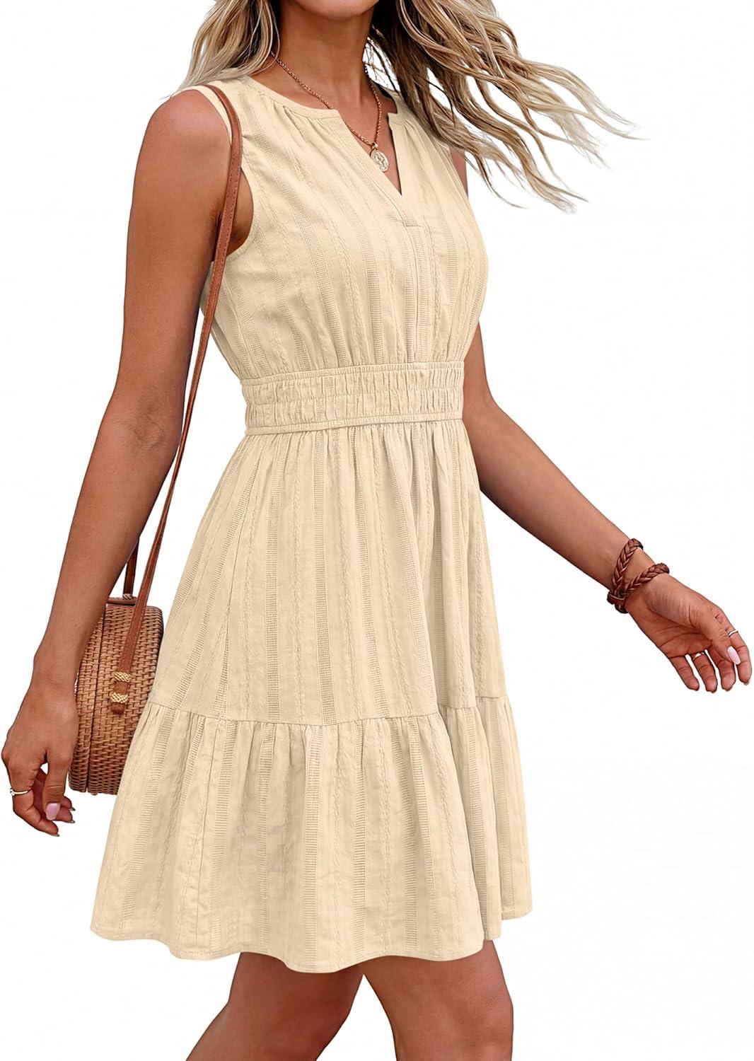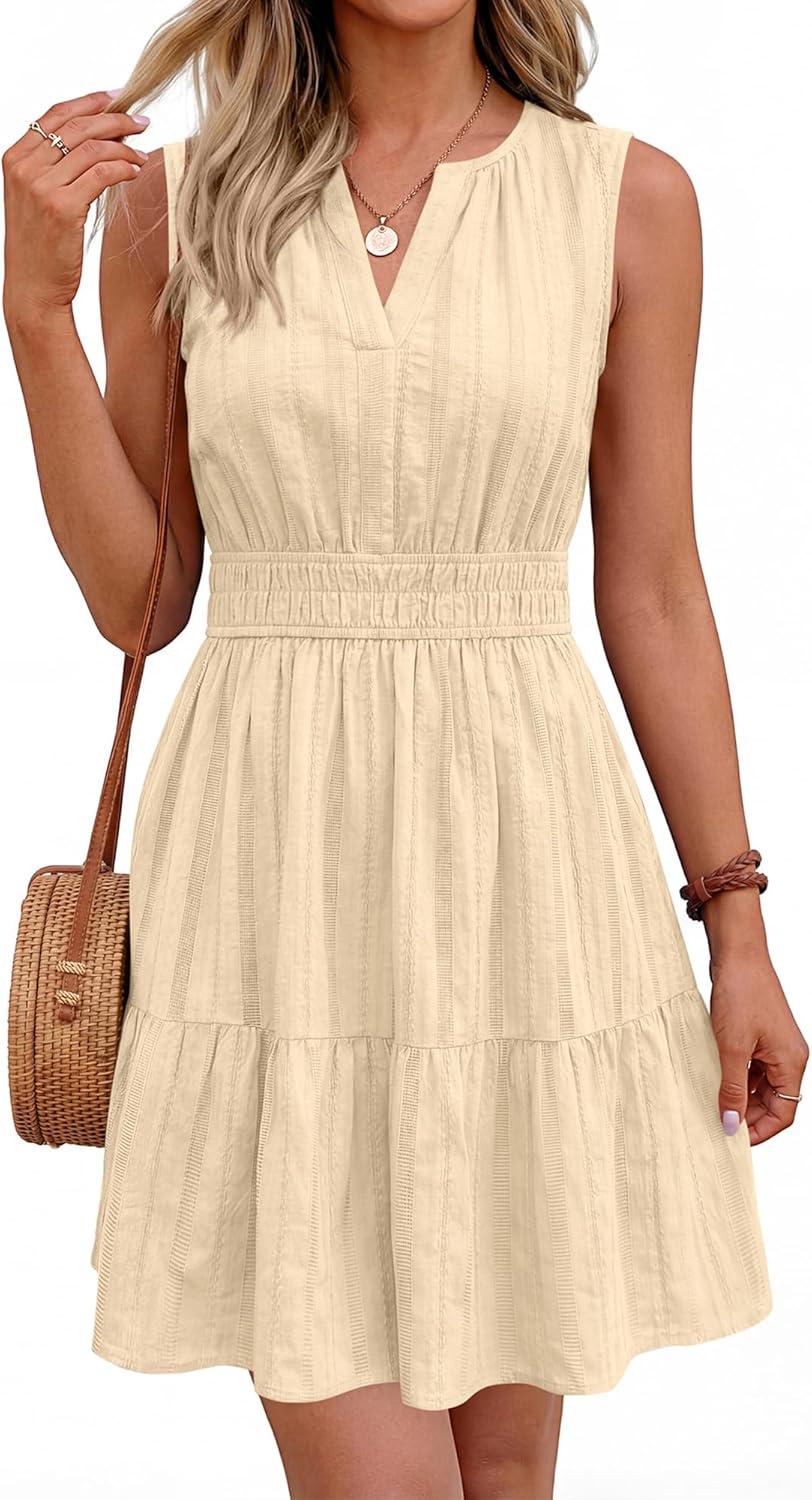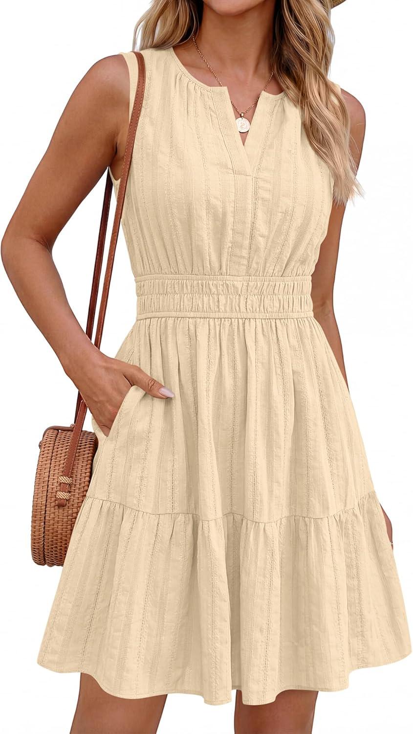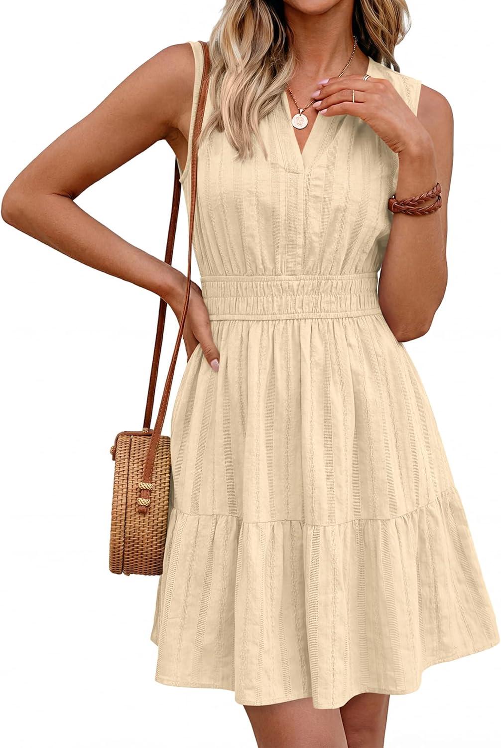 BTFBM Mini Dresses for Women 2026 Summer Sleeveless V Neck Elastic Waist Beach Vacation Sundress Boho Casual Dress Pockets(Beige)