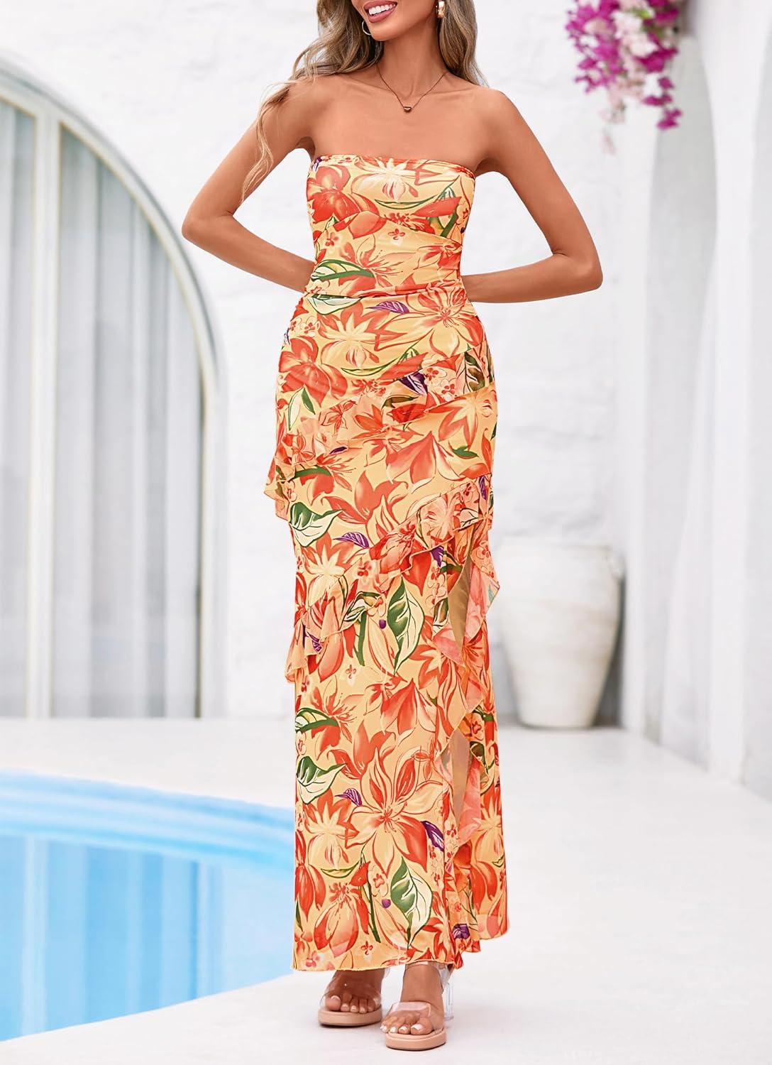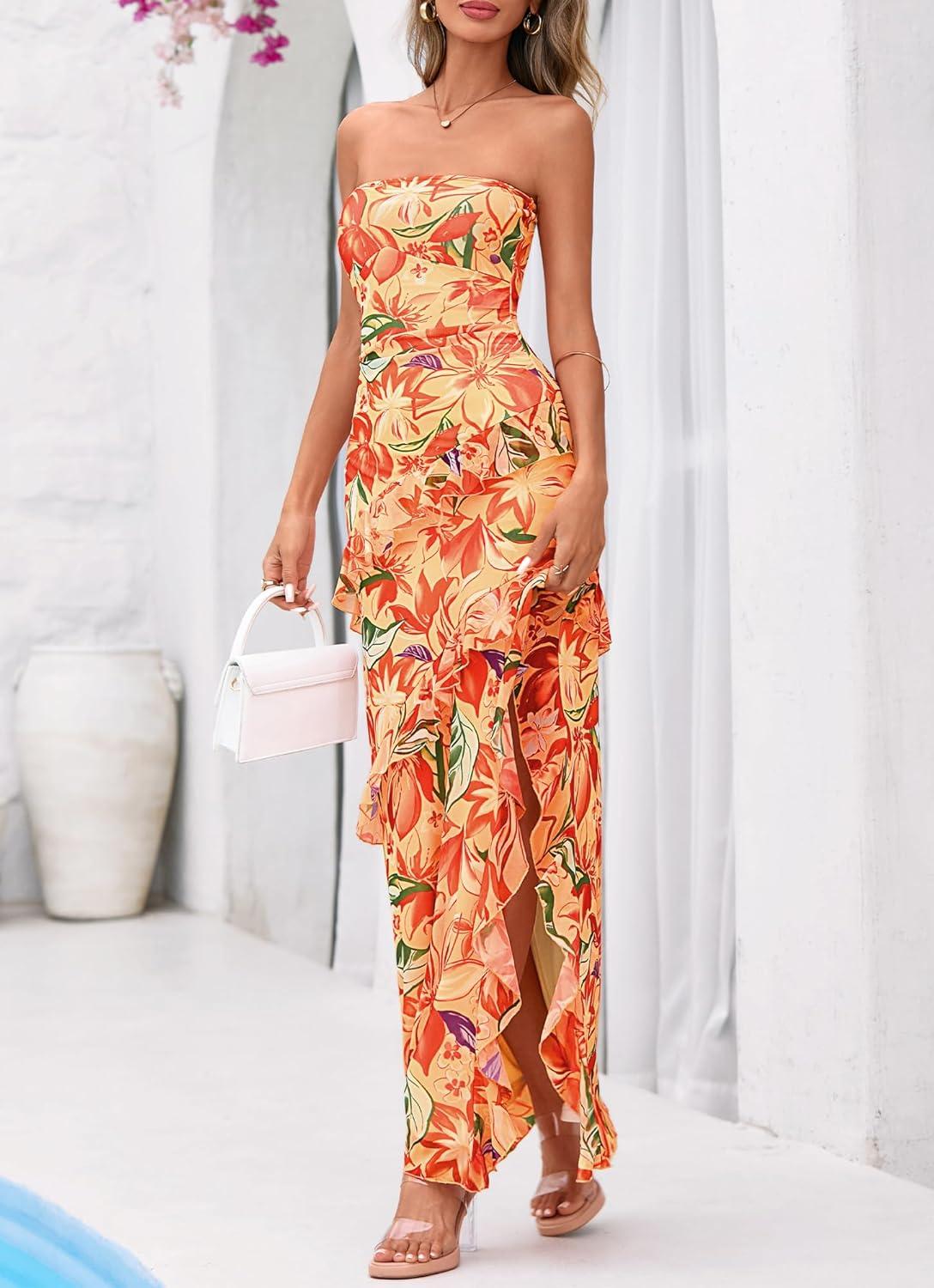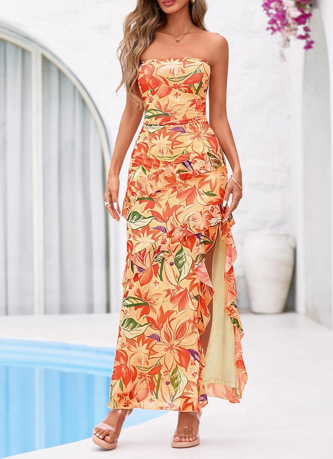 BTFBM Off The Shoulder Dresses for Women Summer 2026 Strapless Ruffle Sundress Slit Formal Cocktail Wedding Guest Dress(Floral Orange Red)