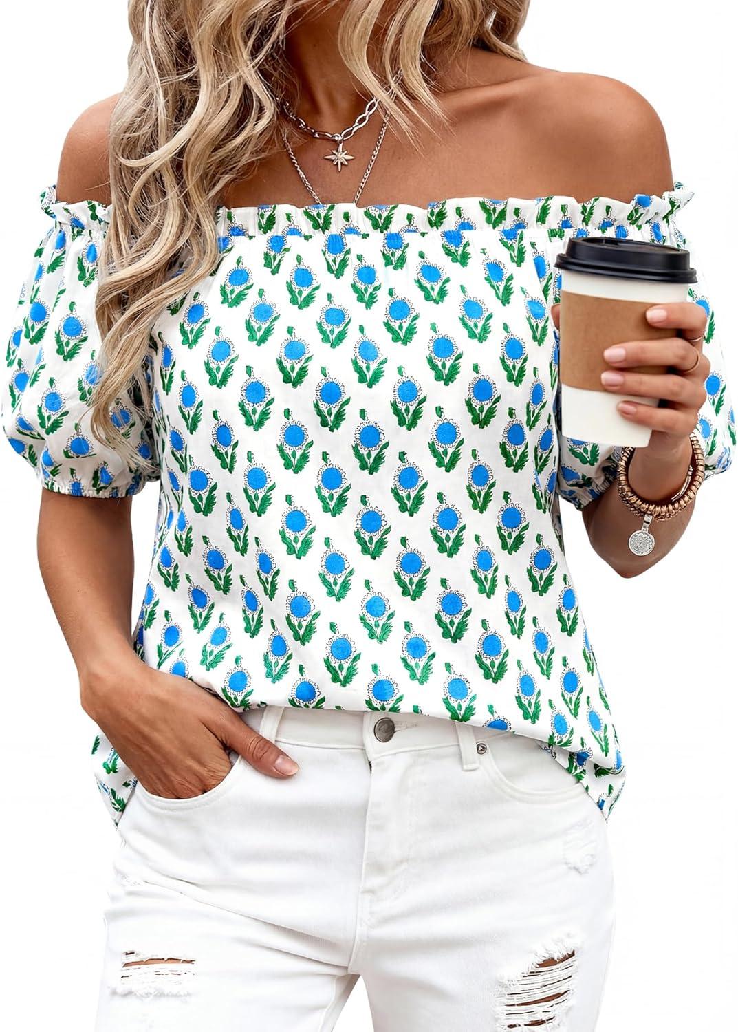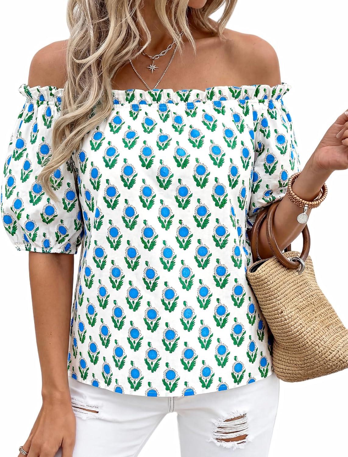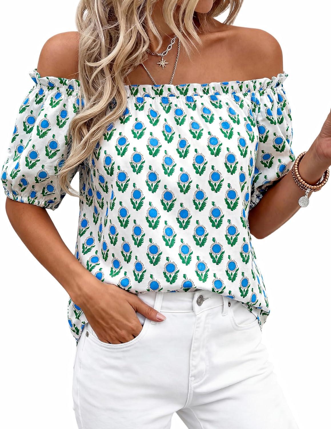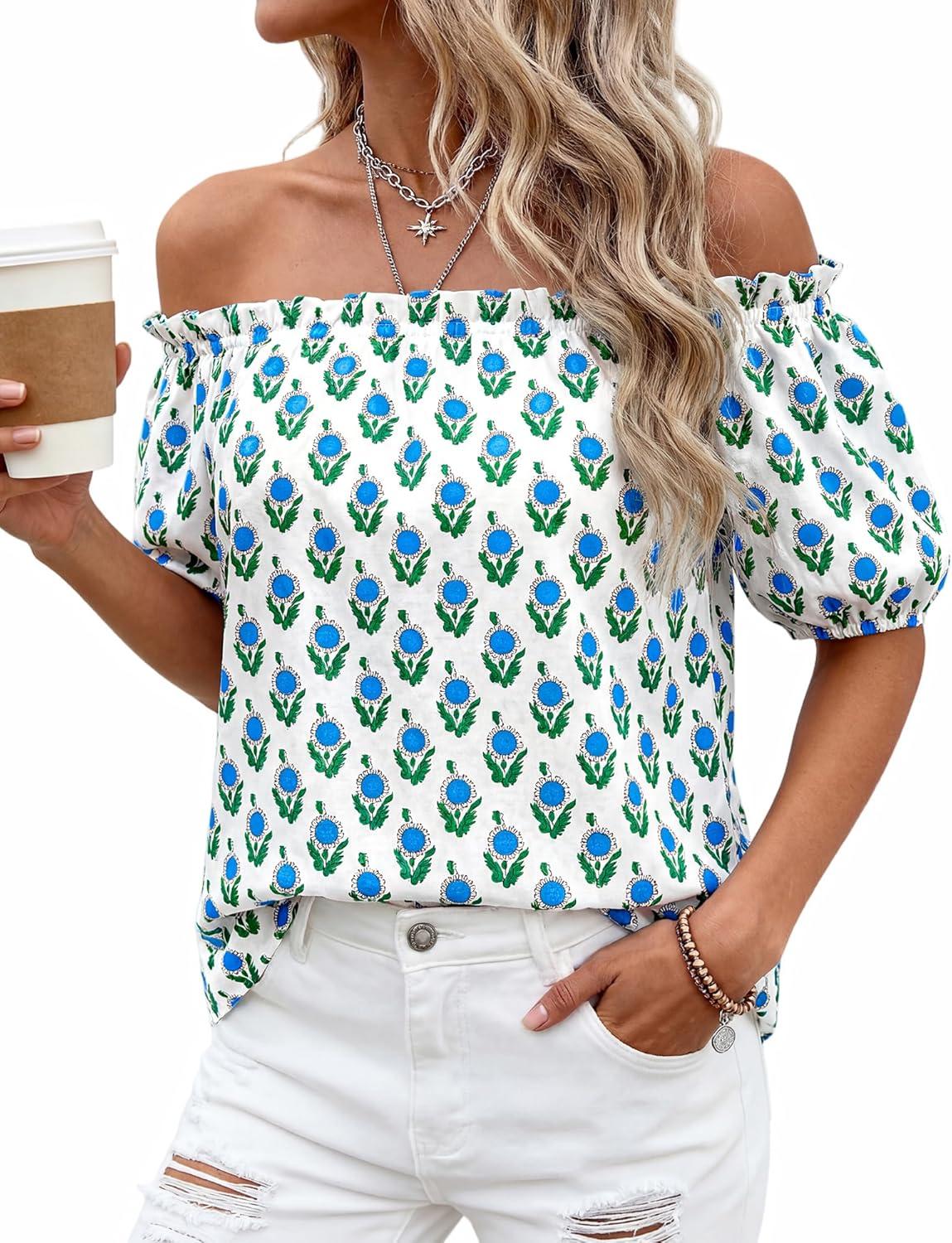 BTFBM Off The Shoulder Spring Tops for Women Summer Blouses Boho Floral Short Sleeve Shirts Dressy Casual Outfits 2026(Floral White Blue Green)