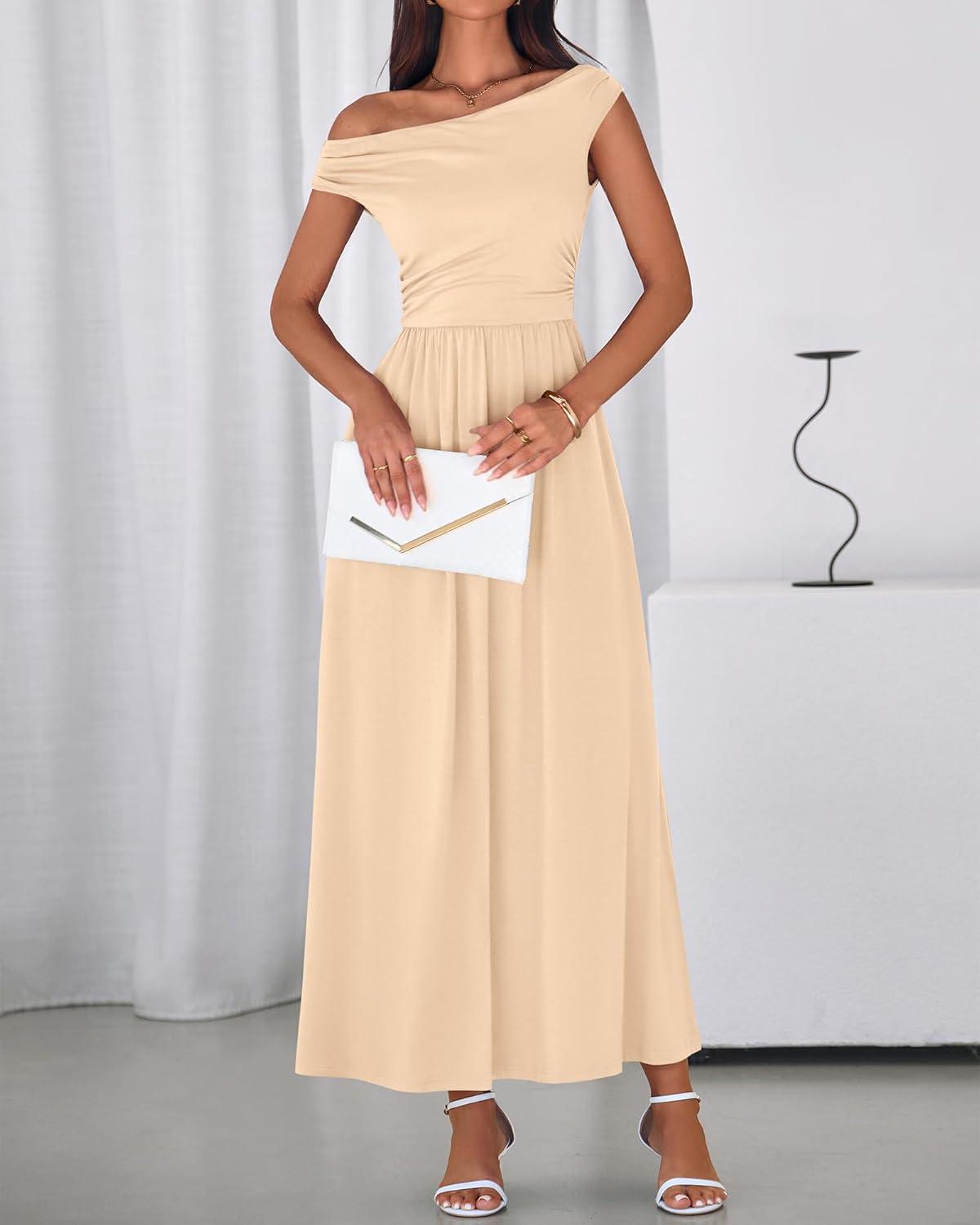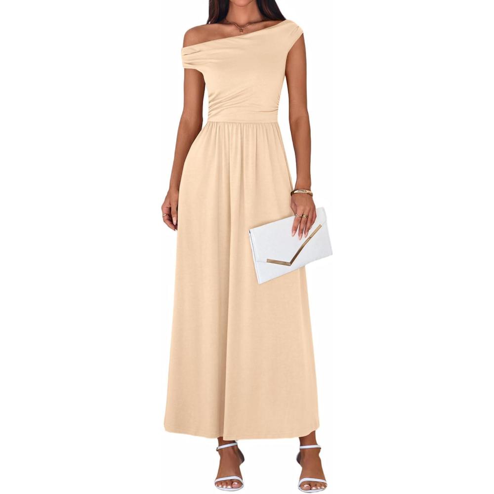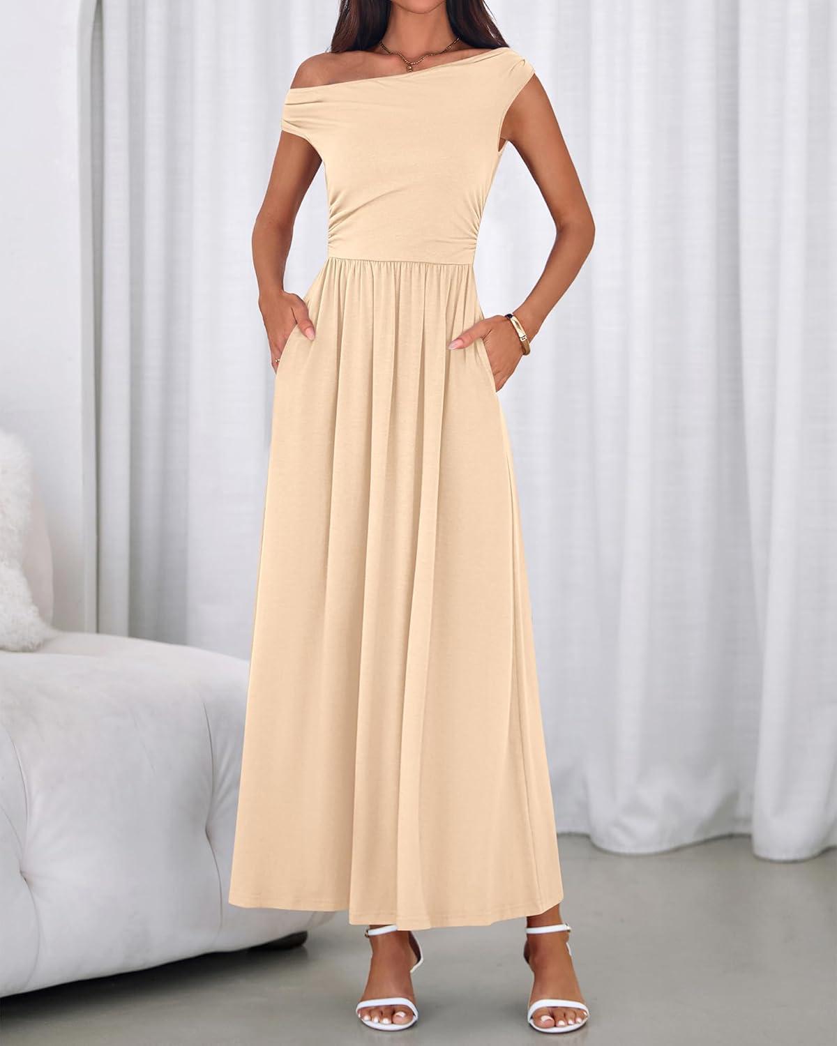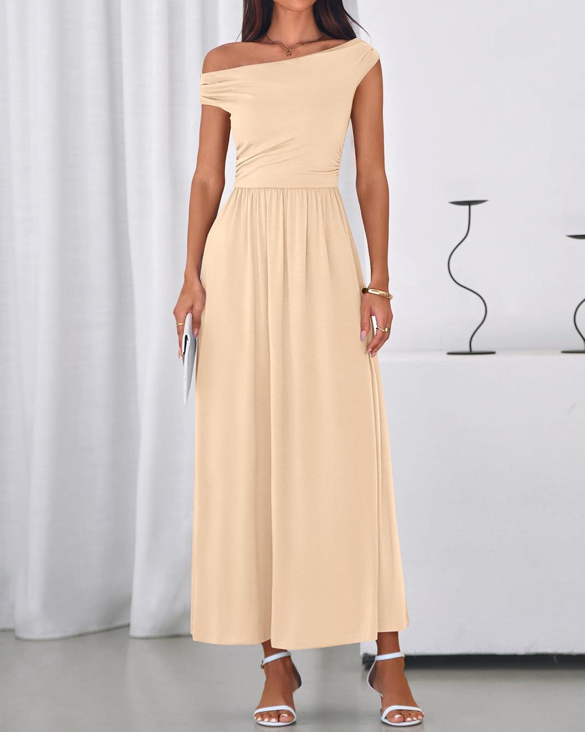 BTFBM One Shoulder Dresses for Women Spring 2026 Sleeveless Casual Flowy Pleated Cocktail Party Maxi Sundress Pockets(Beige)