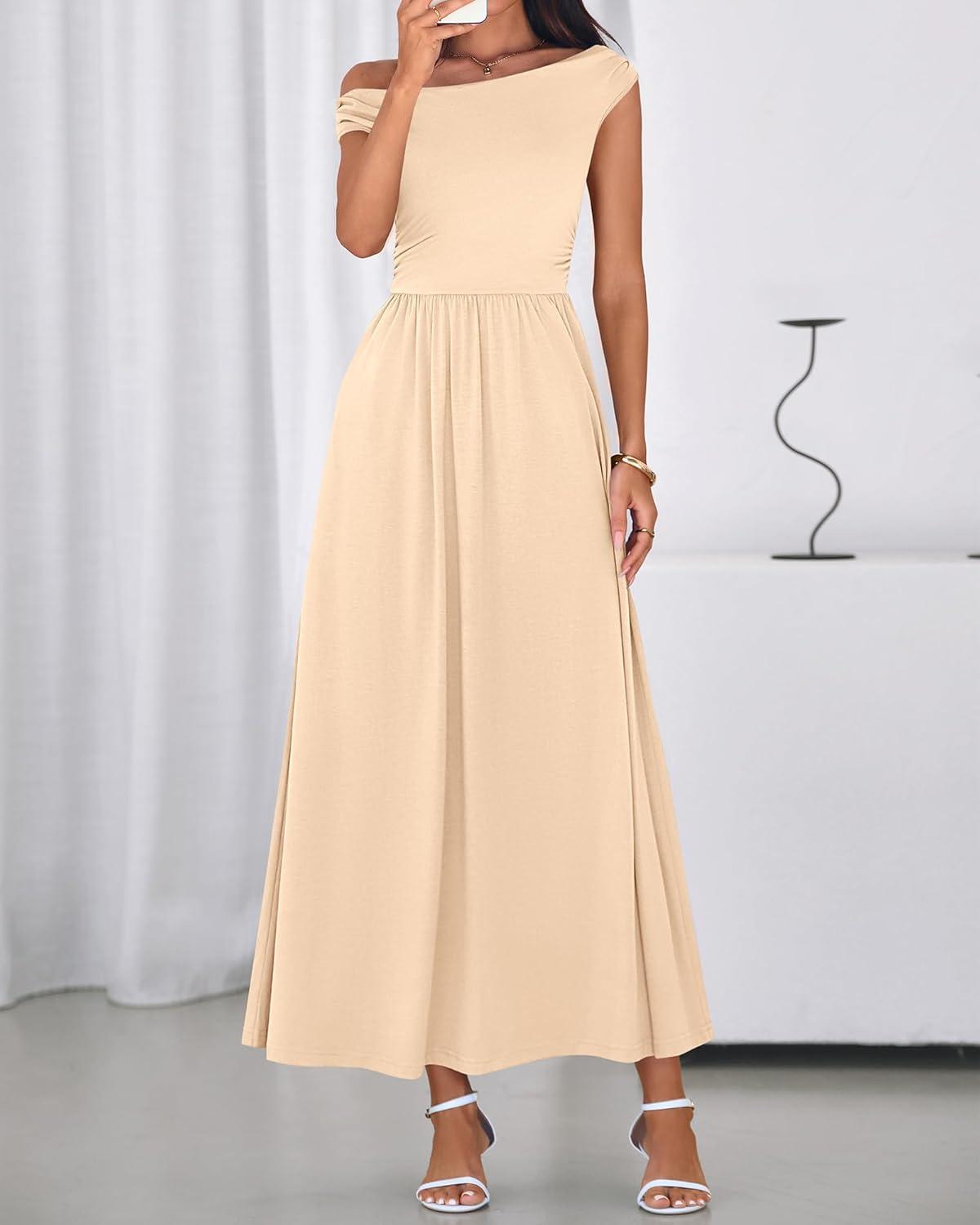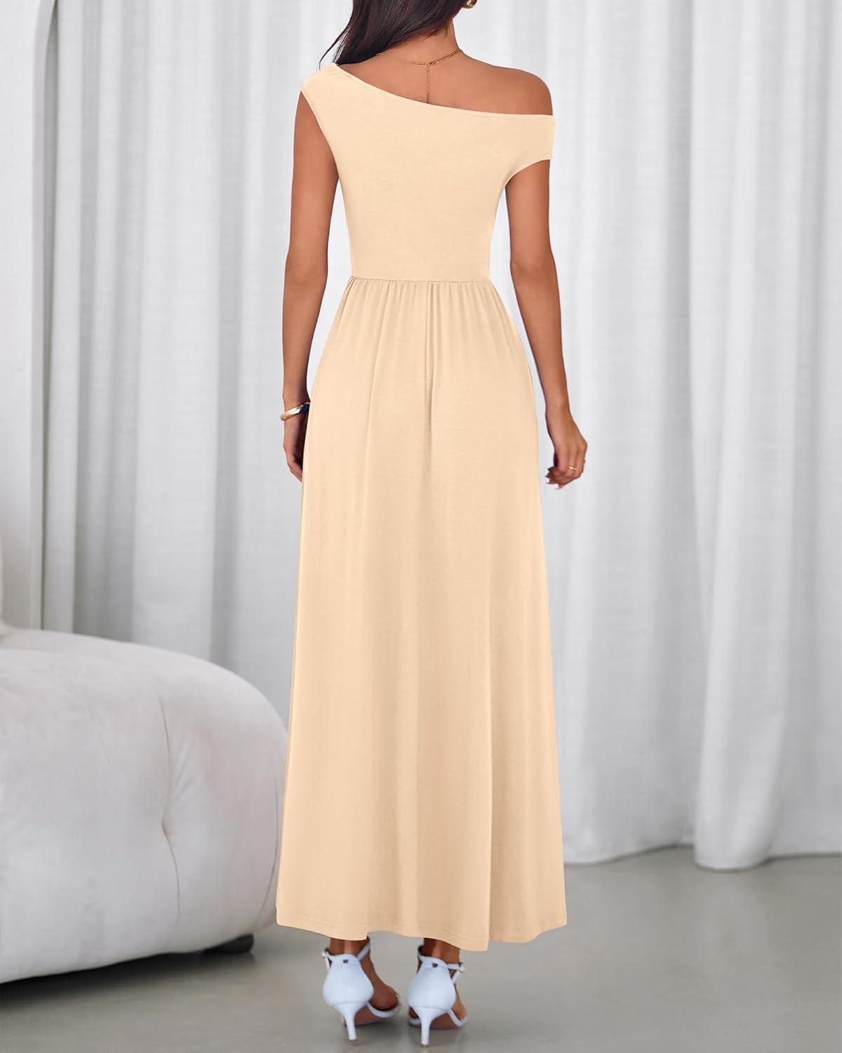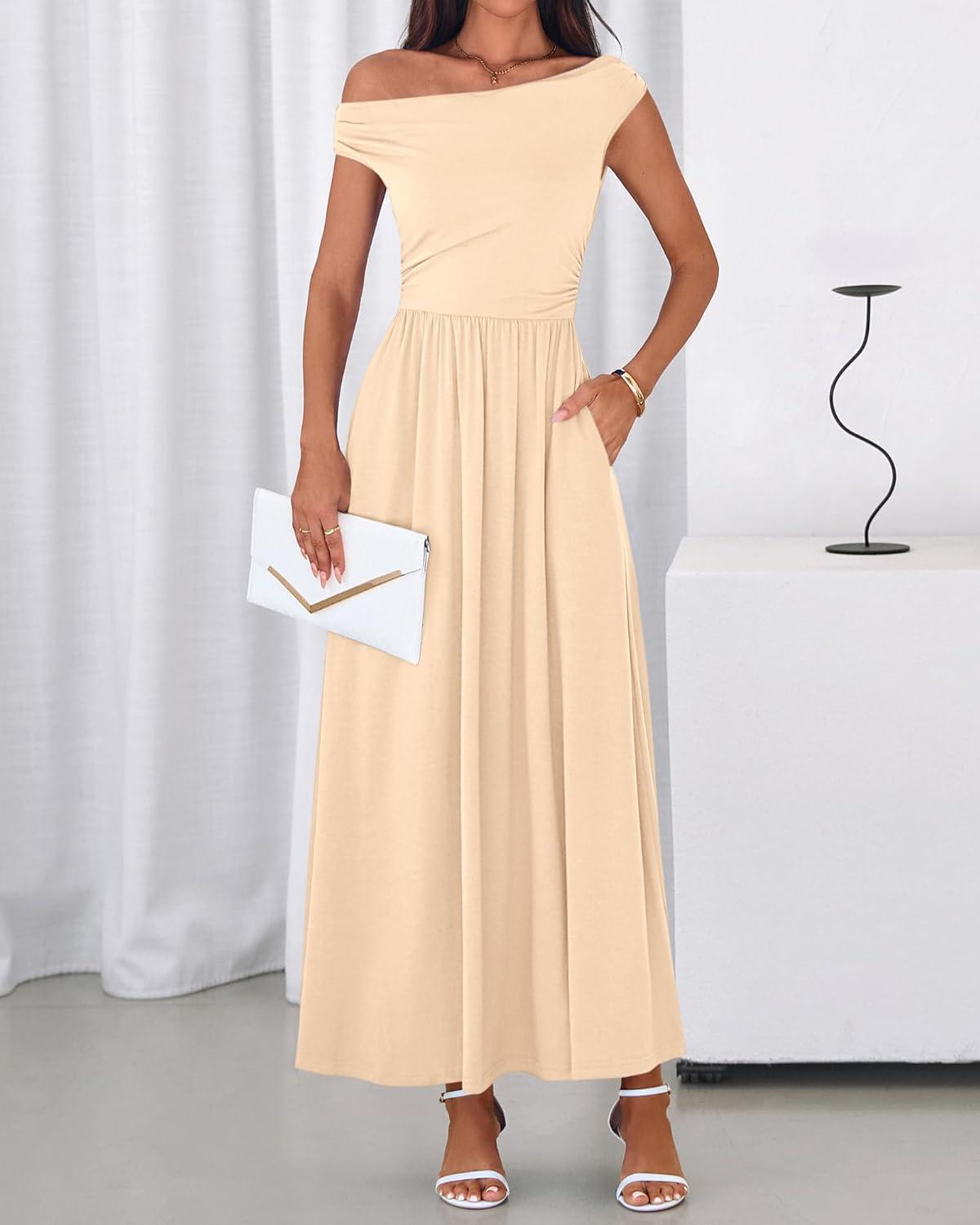 BTFBM One Shoulder Dresses for Women Spring 2026 Sleeveless Casual Flowy Pleated Cocktail Party Maxi Sundress Pockets(Beige)