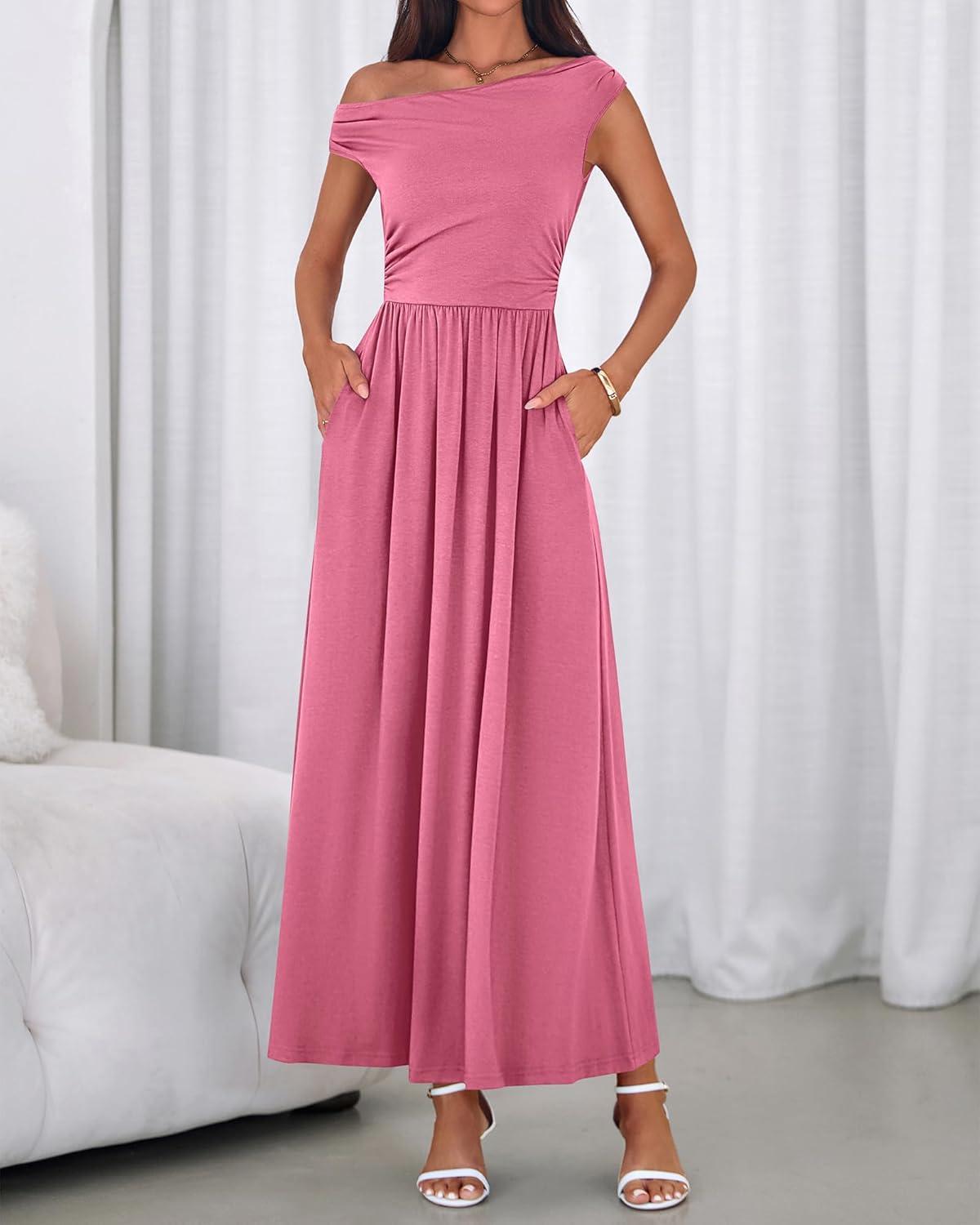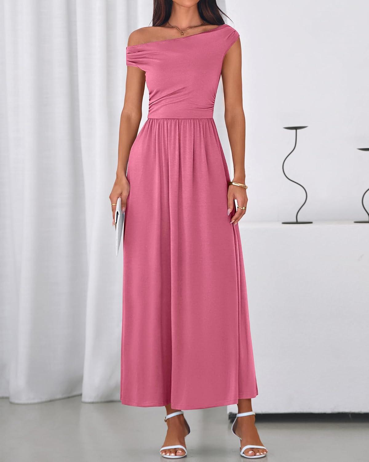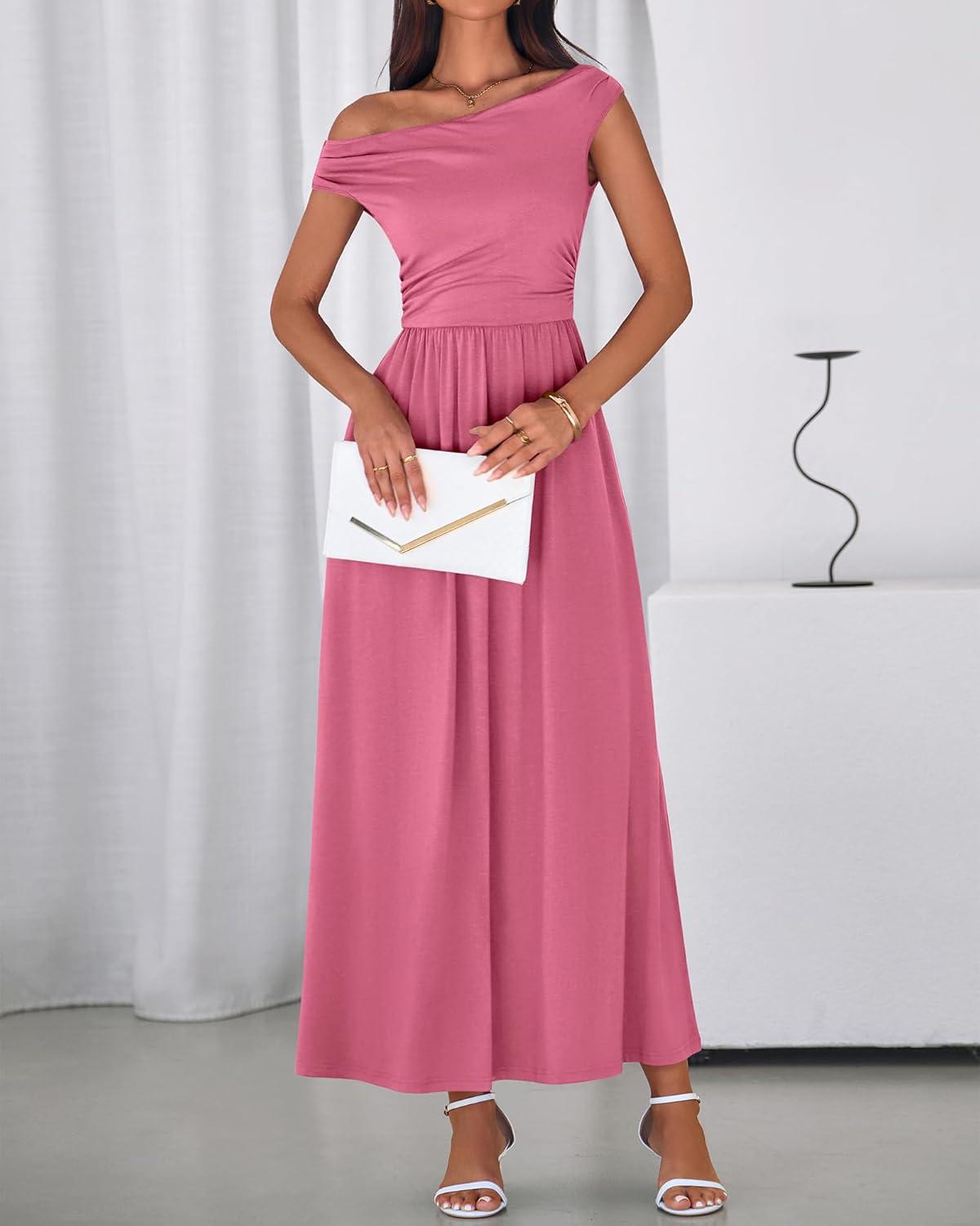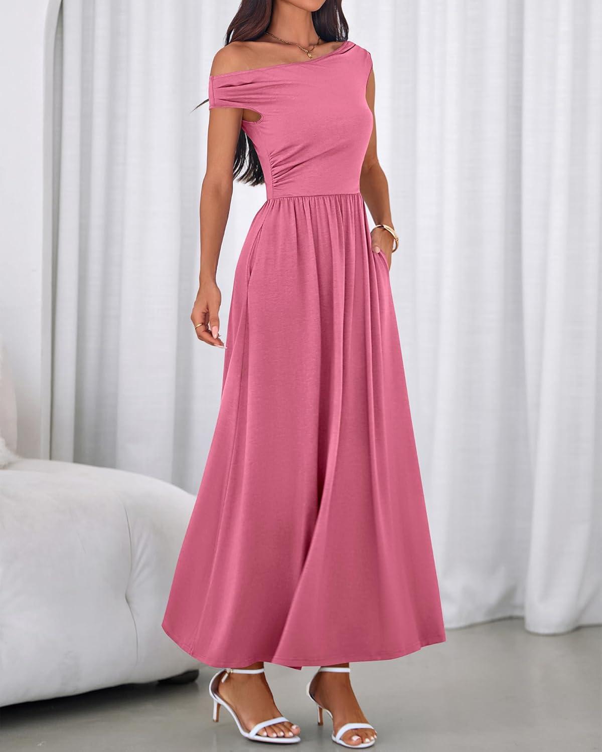 BTFBM One Shoulder Dresses for Women Spring 2026 Sleeveless Casual Flowy Pleated Cocktail Party Maxi Sundress Pockets(Pink)