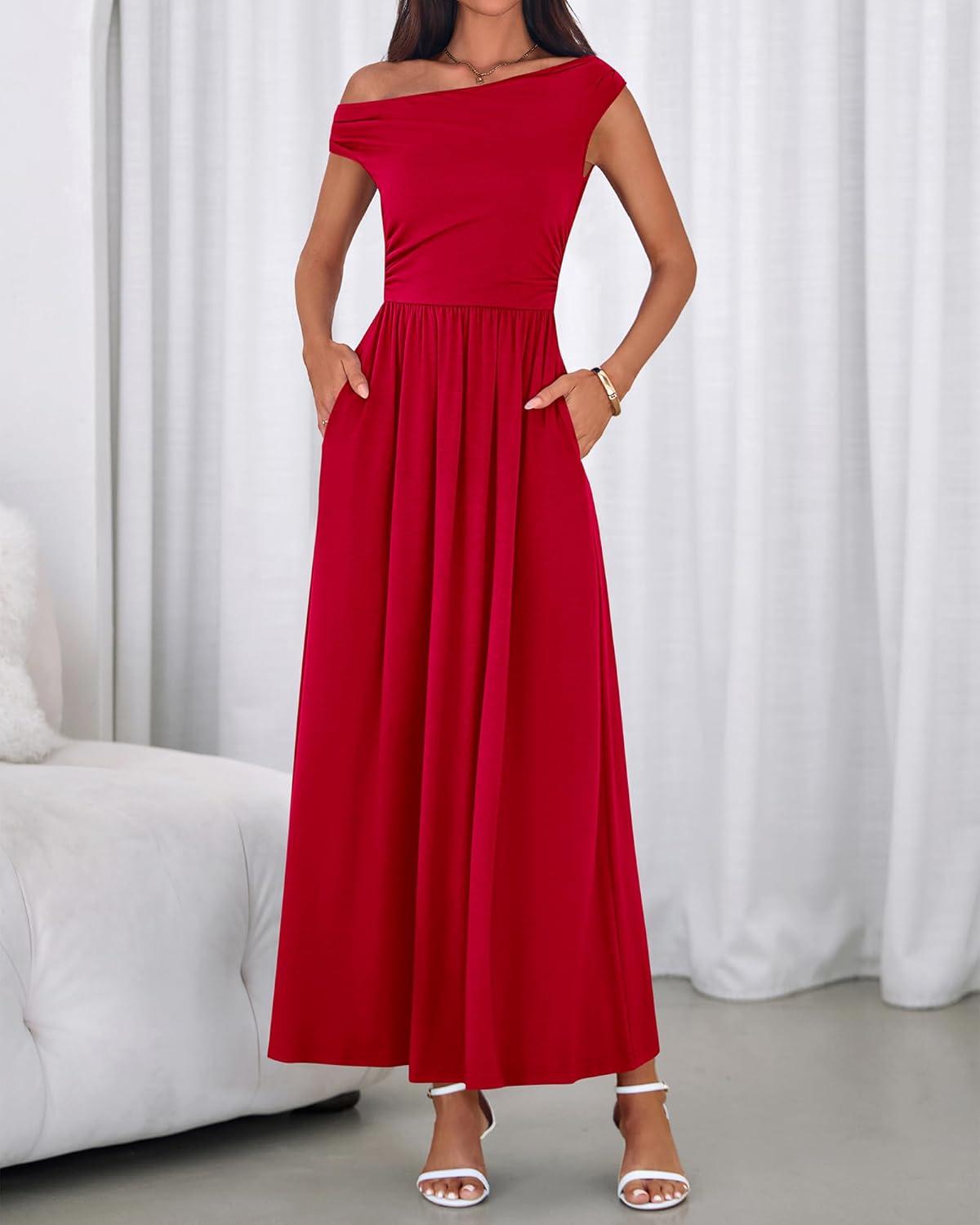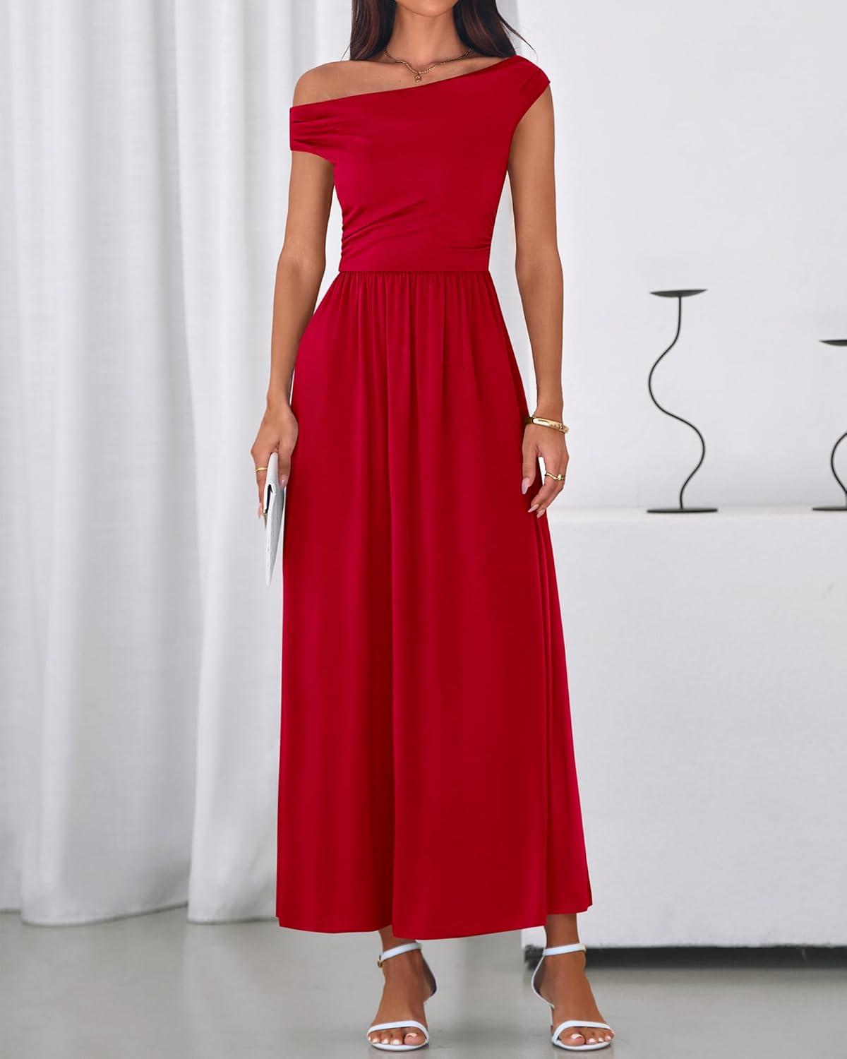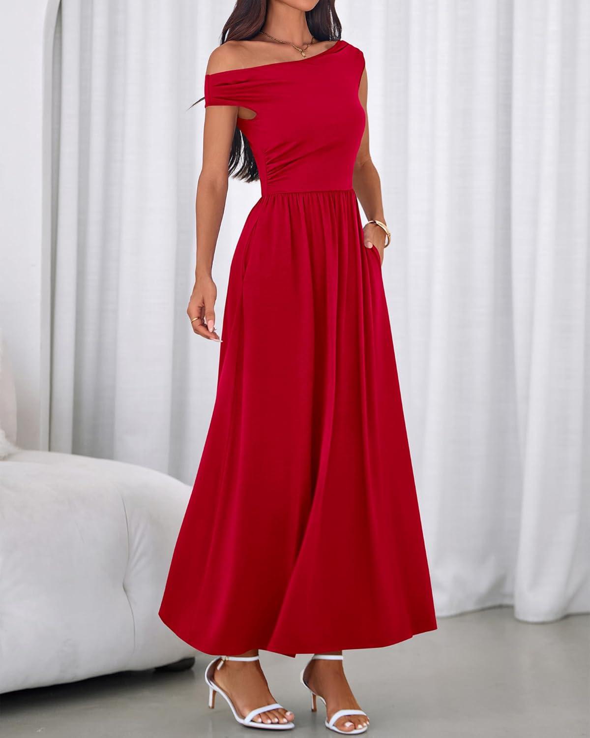 BTFBM One Shoulder Dresses for Women Spring 2026 Sleeveless Casual Flowy Pleated Cocktail Party Maxi Sundress Pockets(Red)