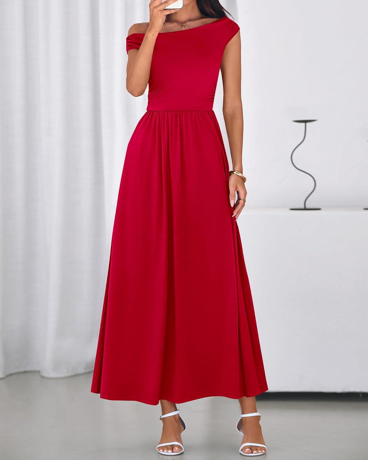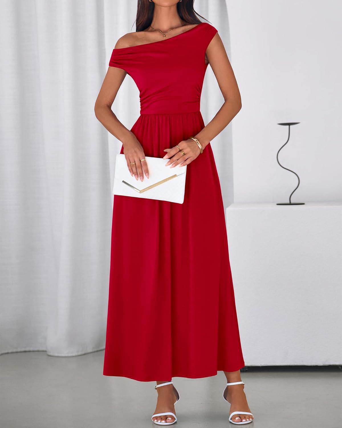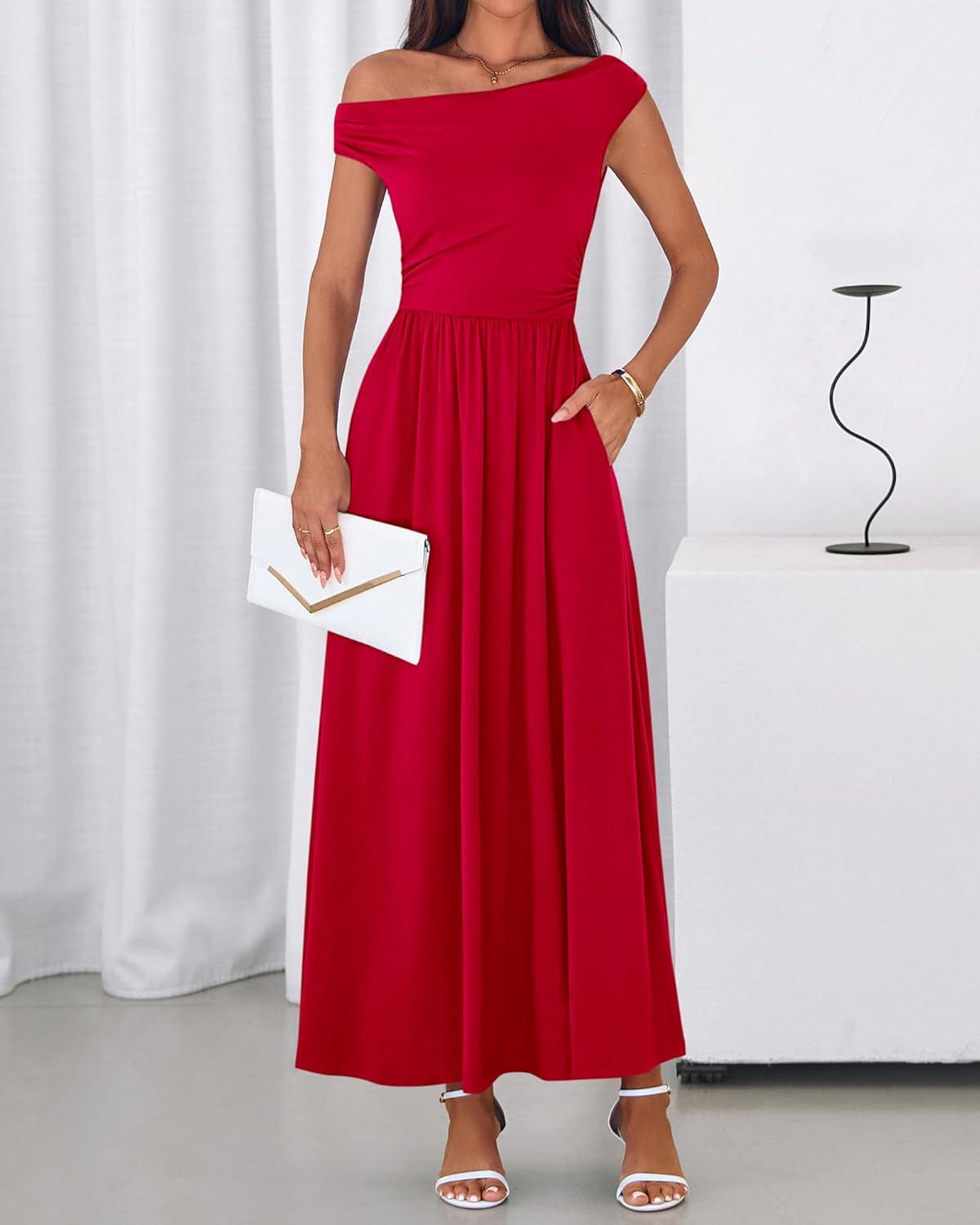 BTFBM One Shoulder Dresses for Women Spring 2026 Sleeveless Casual Flowy Pleated Cocktail Party Maxi Sundress Pockets(Red)