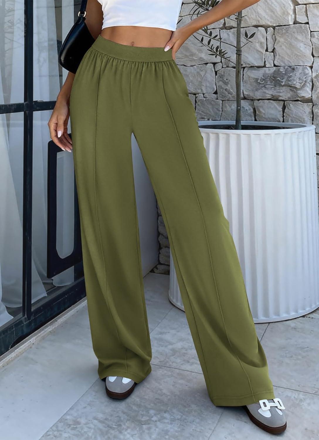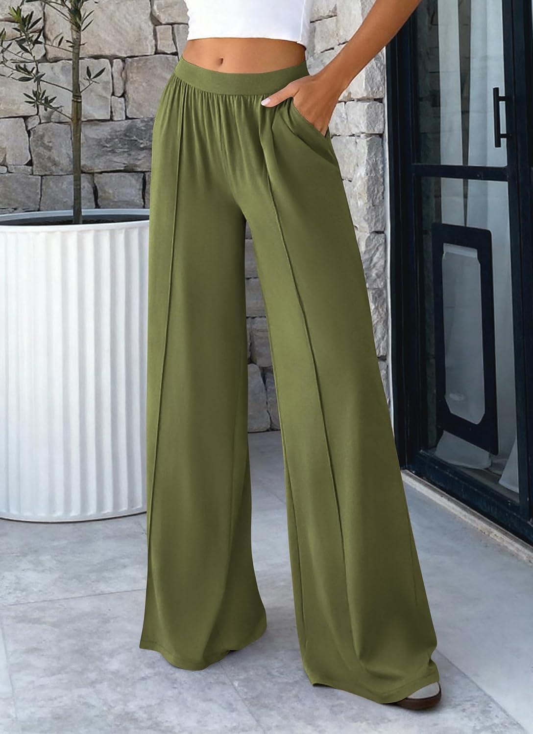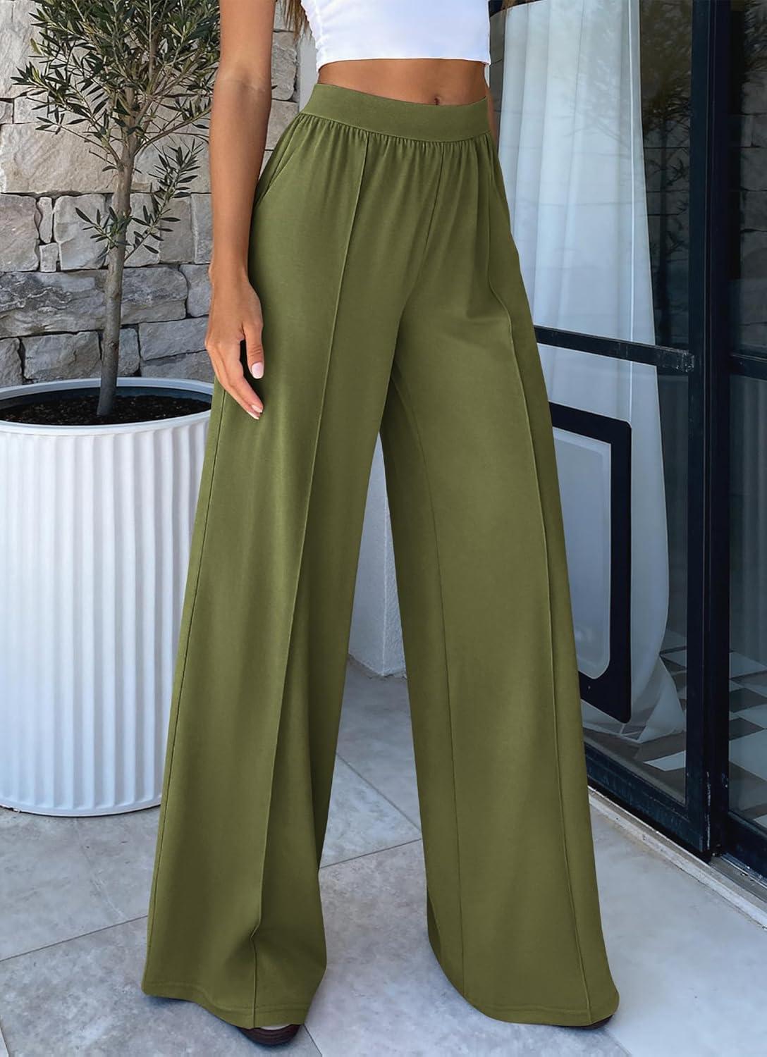 BTFBM Palazzo Pants for Women 2026 Spring Summer Casual Lounge Pants High Waist Flowy Trousers Baggy Wide Leg Pants(Bean Green)