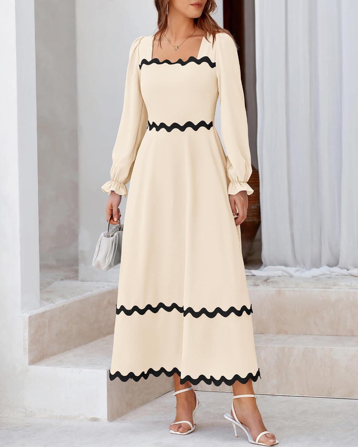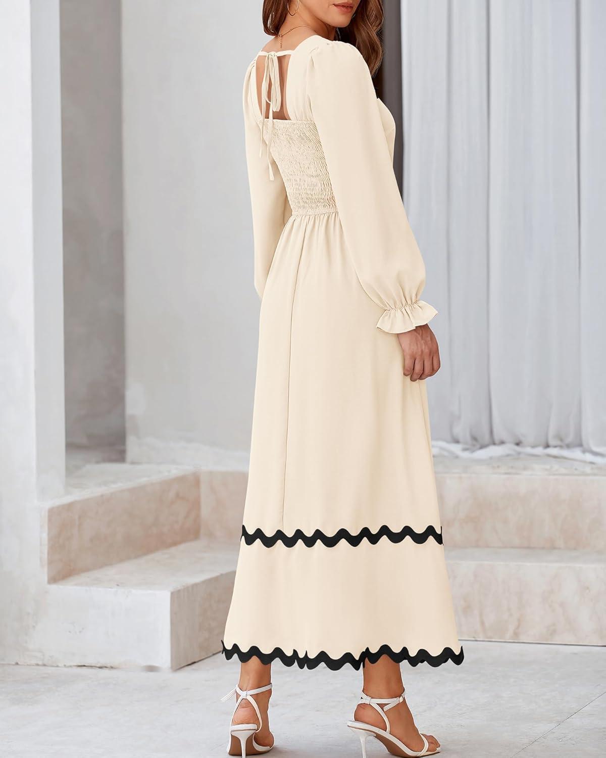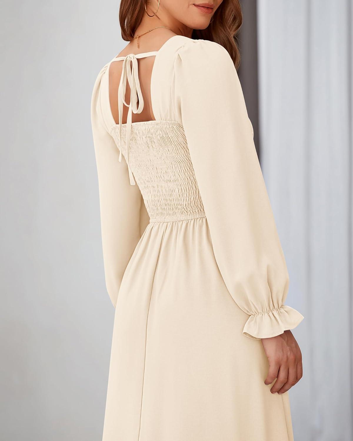 BTFBM RIC Rac Dress Women Maxi Dress Square Neck Long Sleeve Smocked Tie Back A-Line Flowy Fall Wedding Guest Dresses(Solid Beige)