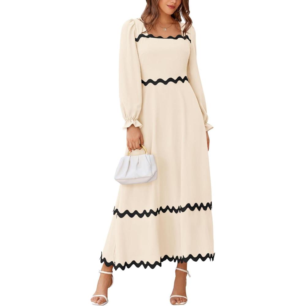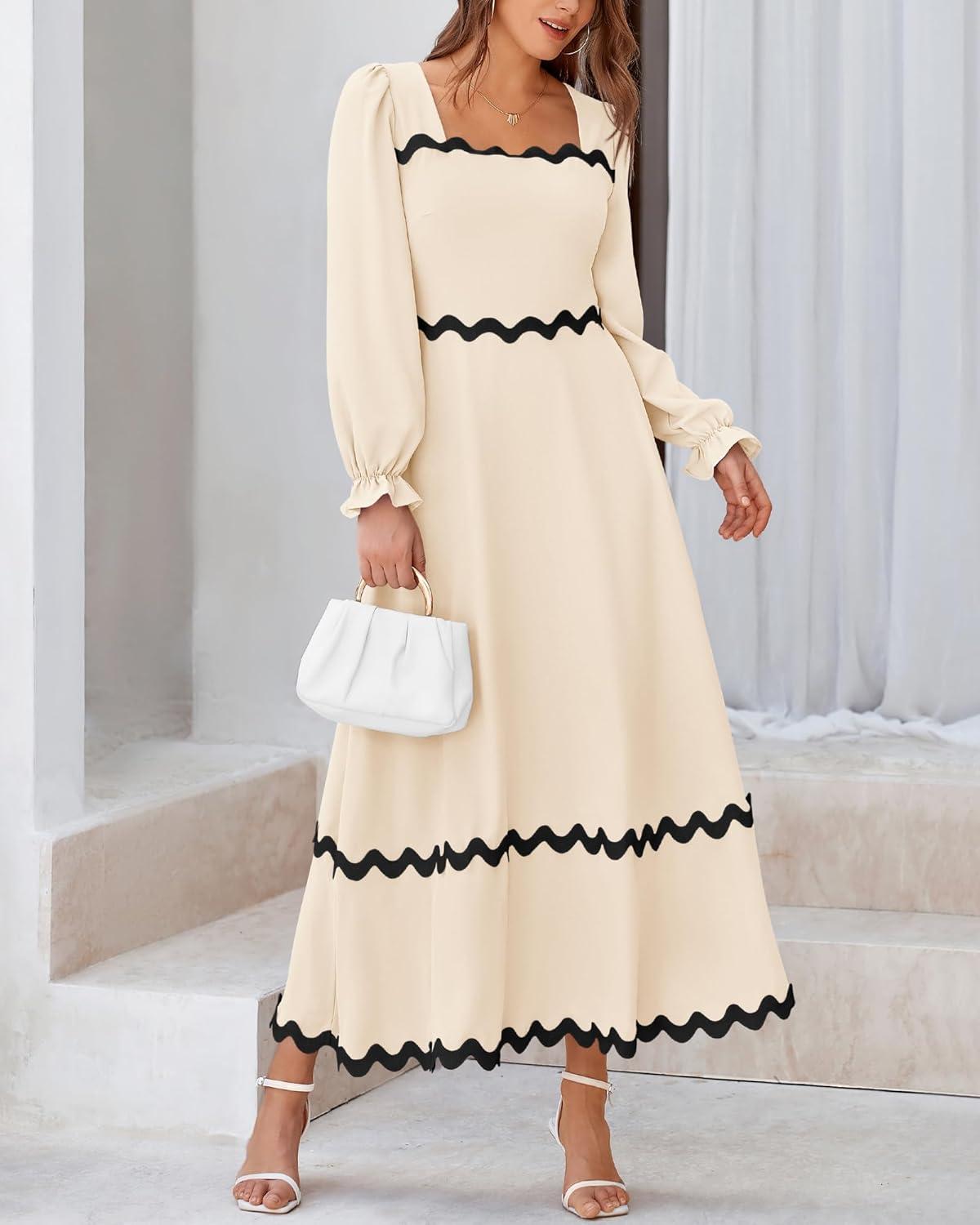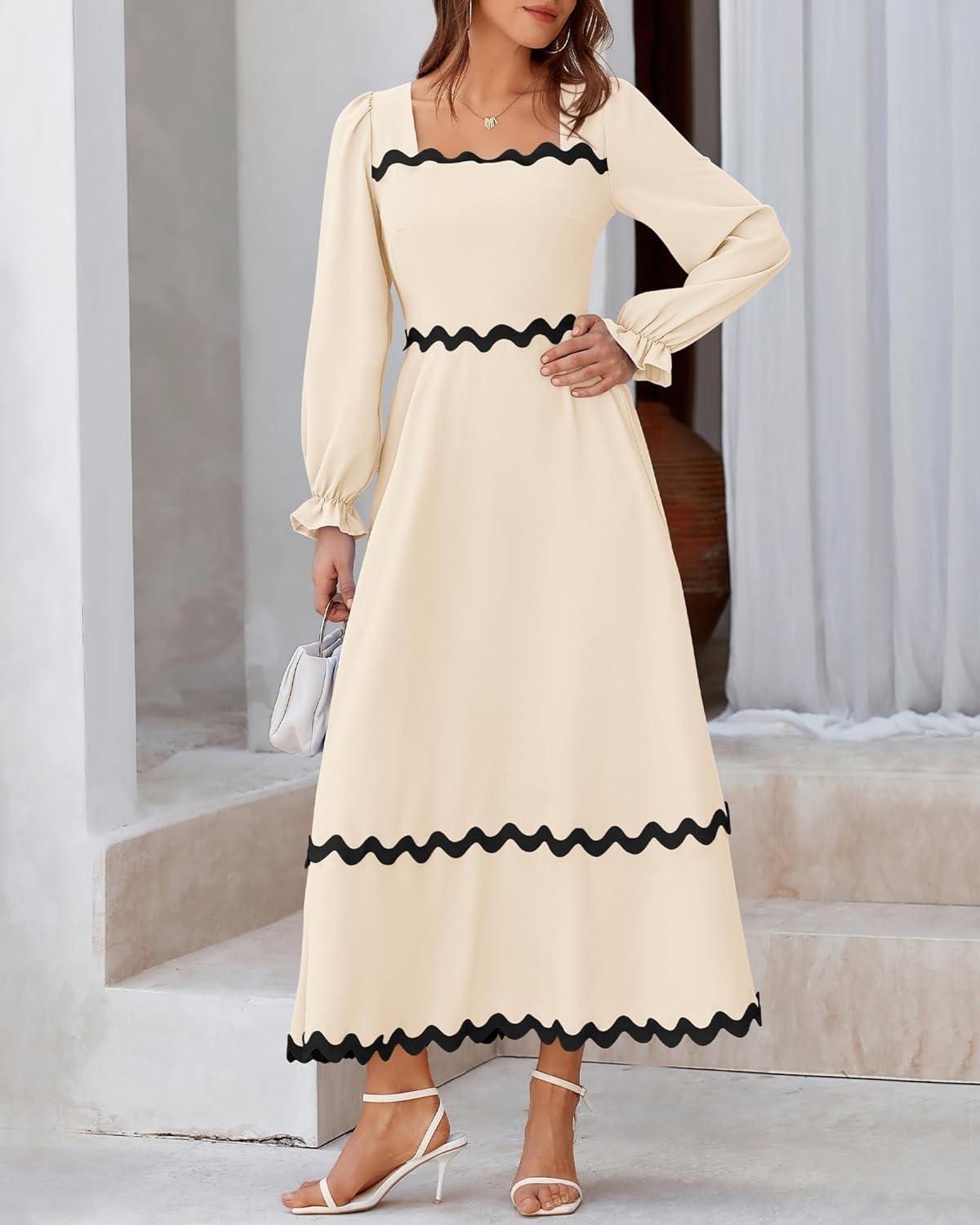 BTFBM RIC Rac Dress Women Maxi Dress Square Neck Long Sleeve Smocked Tie Back A-Line Flowy Fall Wedding Guest Dresses(Solid Beige)