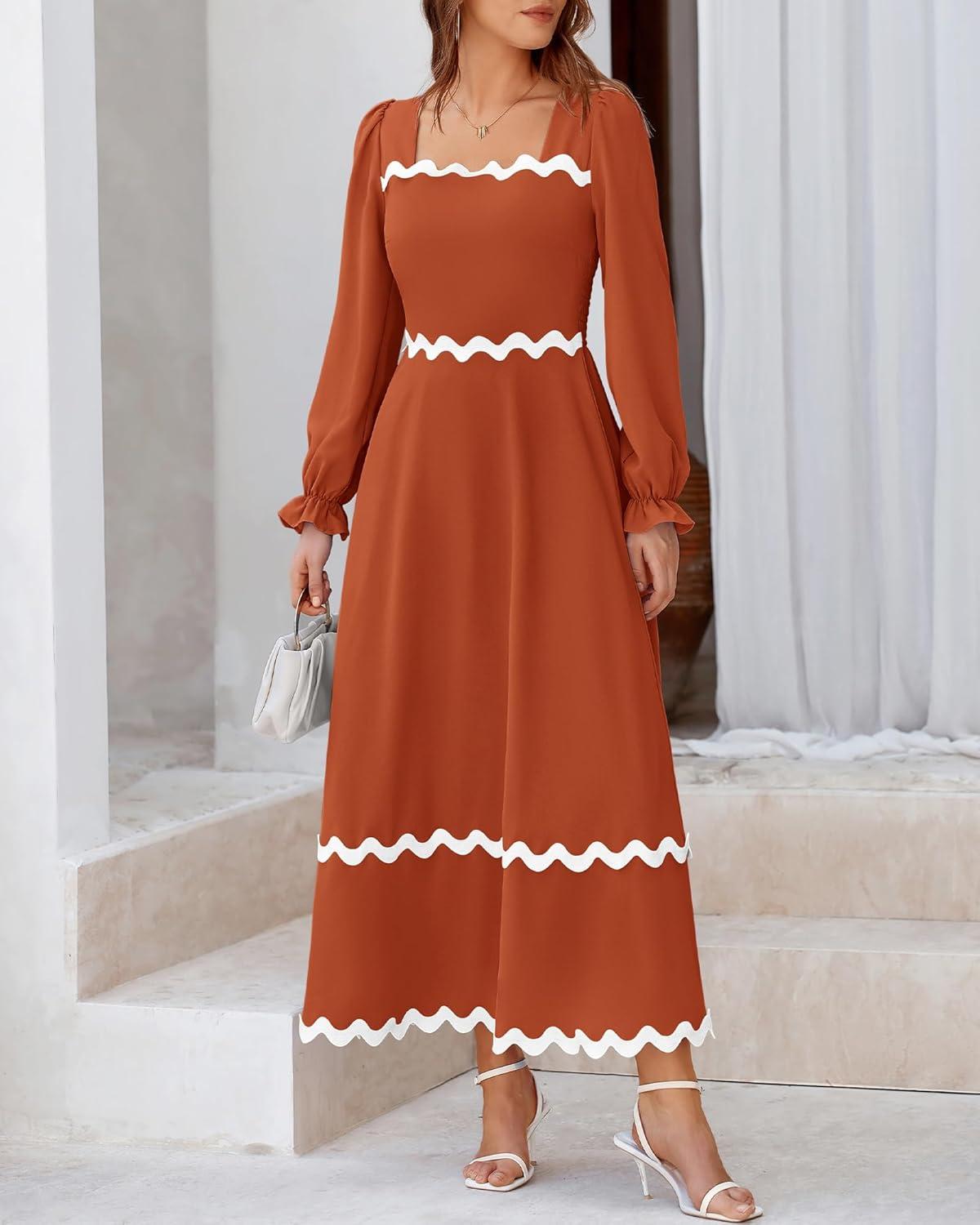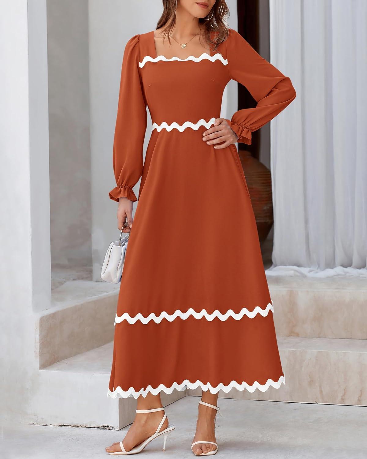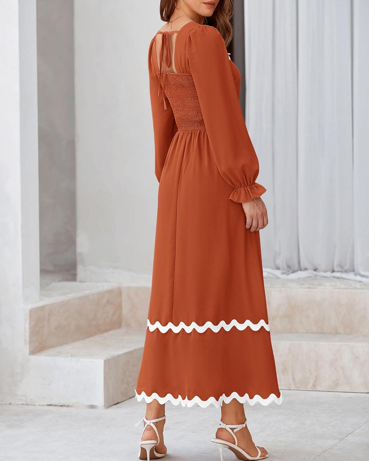 BTFBM RIC Rac Dress Women Maxi Dress Square Neck Long Sleeve Smocked Tie Back A-Line Flowy Fall Wedding Guest Dresses(Solid Brick Red)