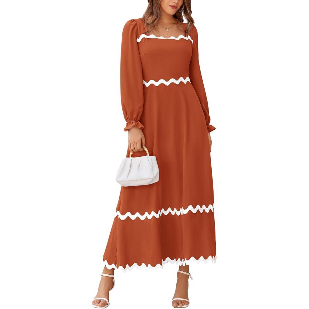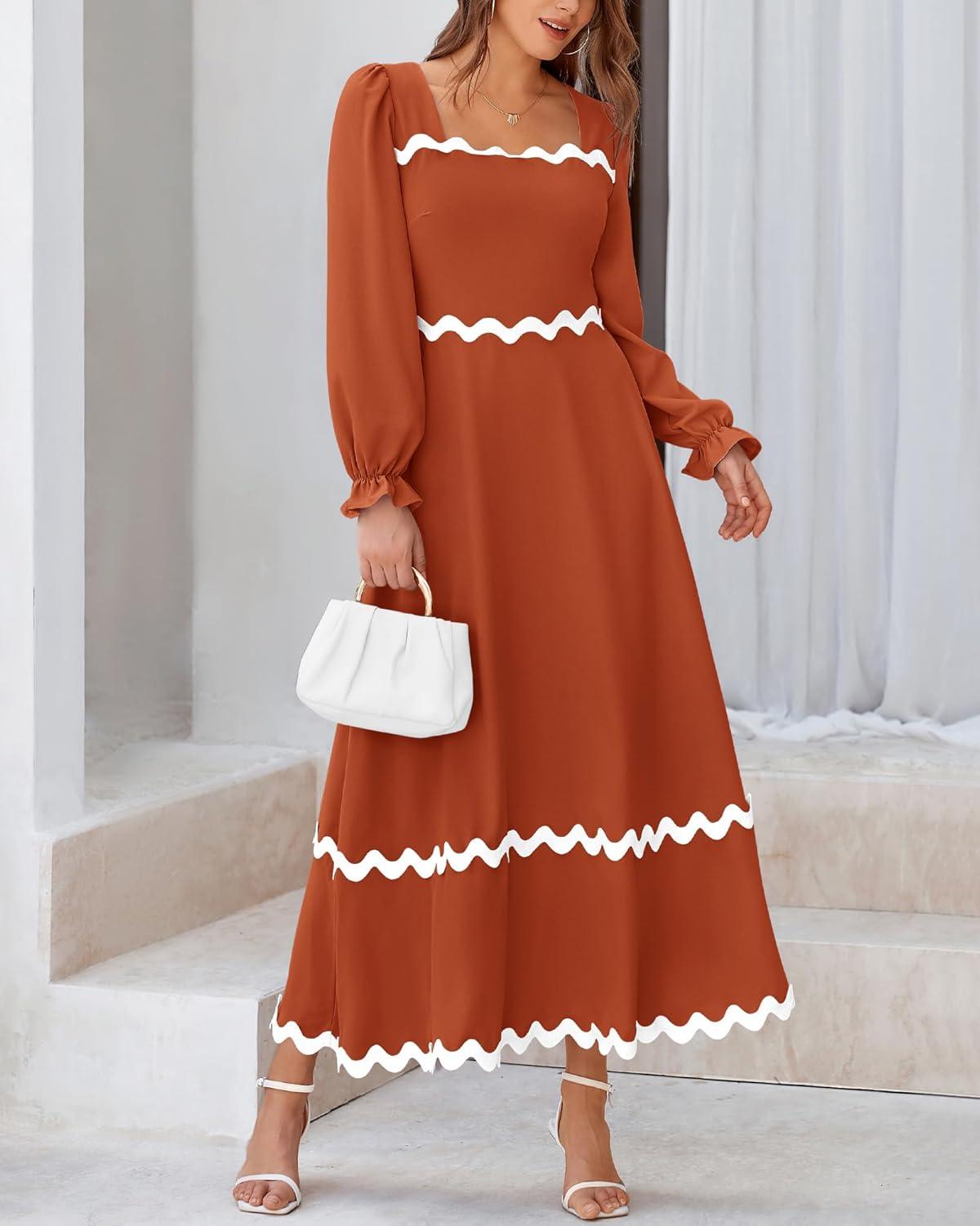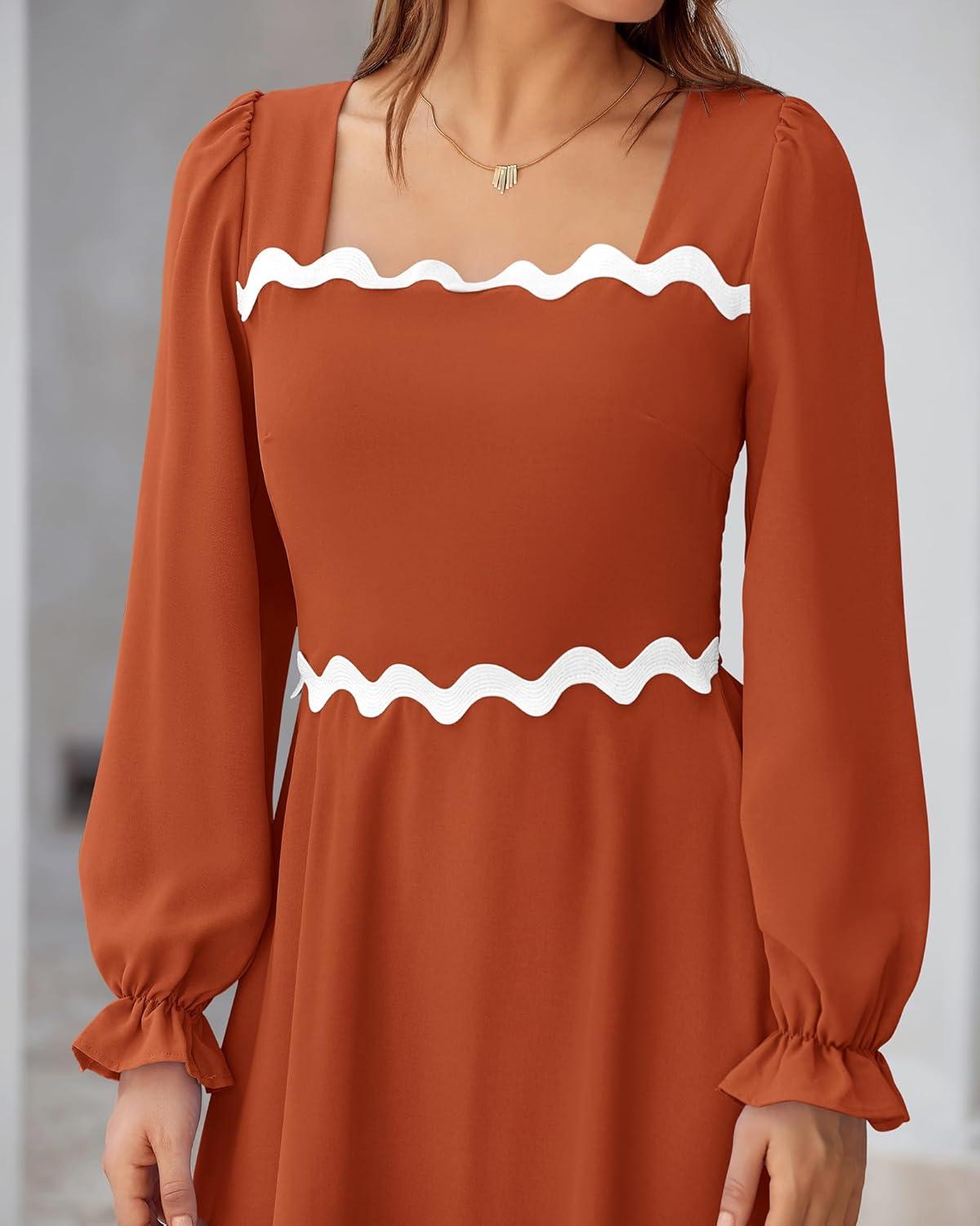 BTFBM RIC Rac Dress Women Maxi Dress Square Neck Long Sleeve Smocked Tie Back A-Line Flowy Fall Wedding Guest Dresses(Solid Brick Red)