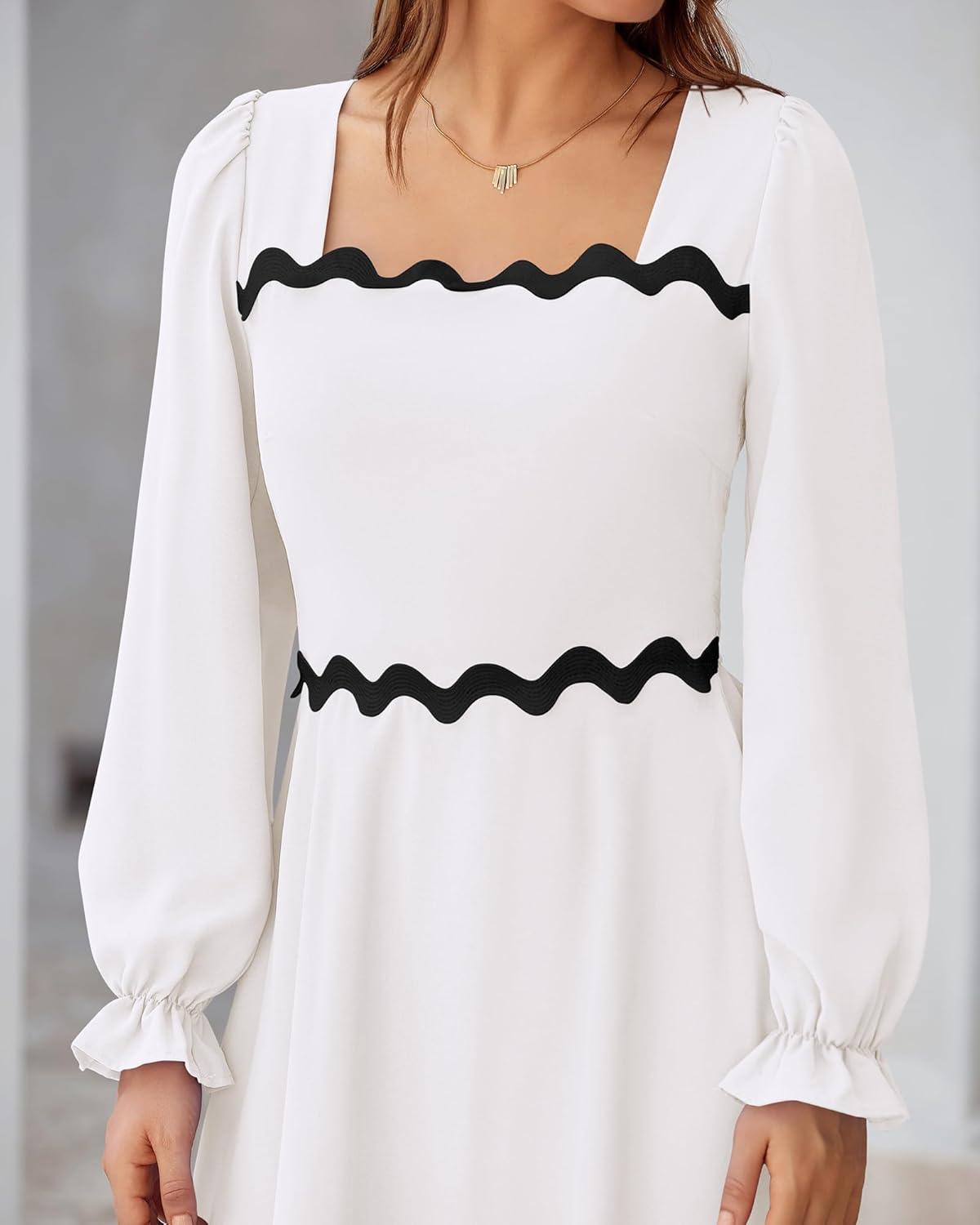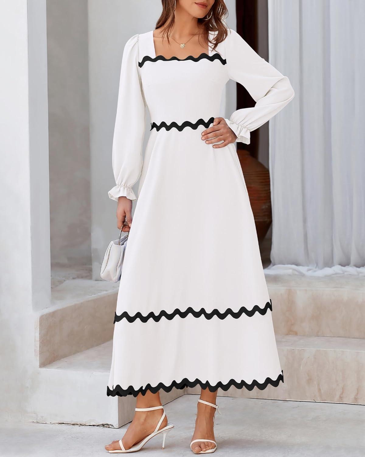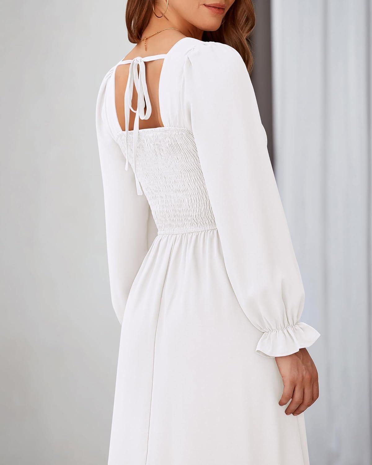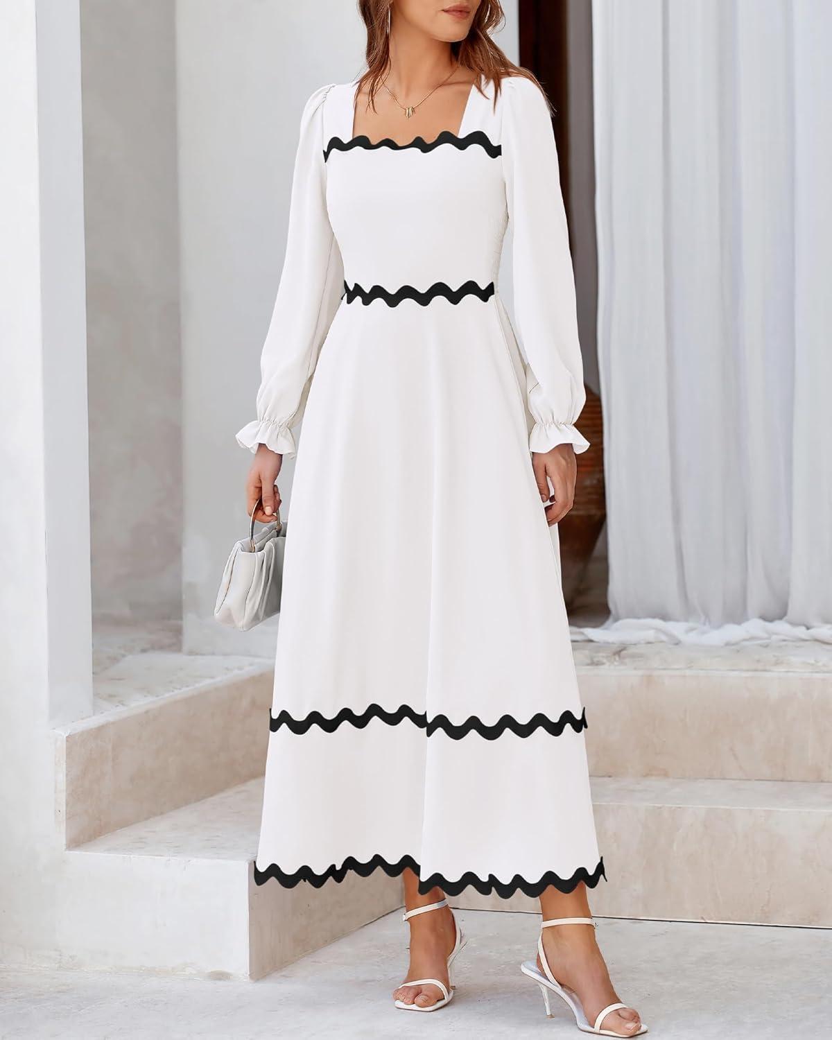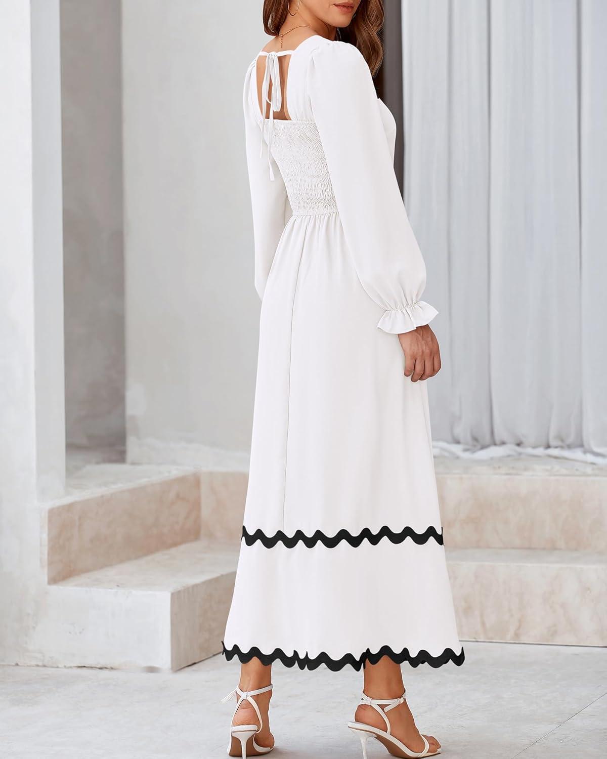 BTFBM RIC Rac Dress Women Maxi Dress Square Neck Long Sleeve Smocked Tie Back A-Line Flowy Fall Wedding Guest Dresses(Solid White Black)