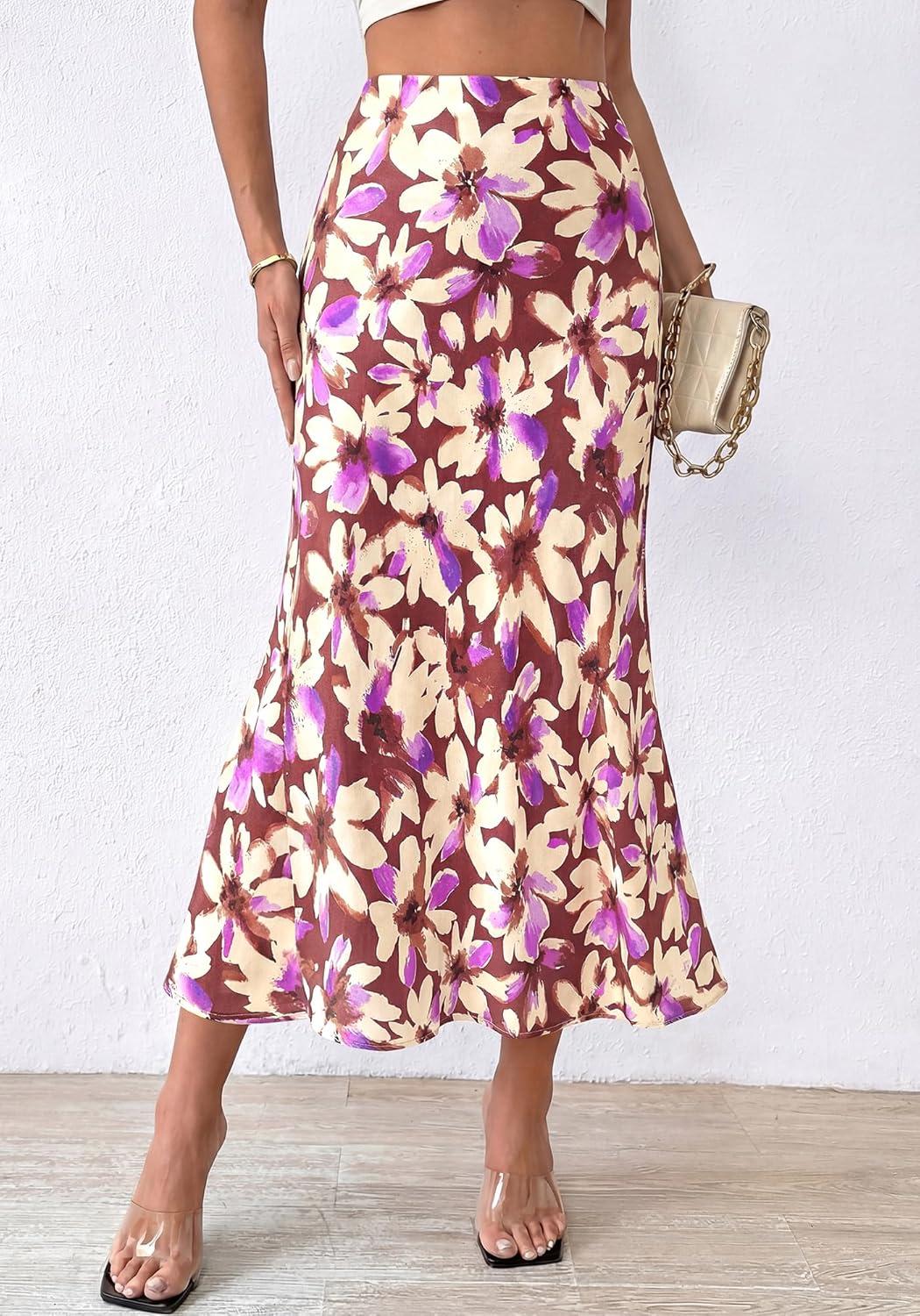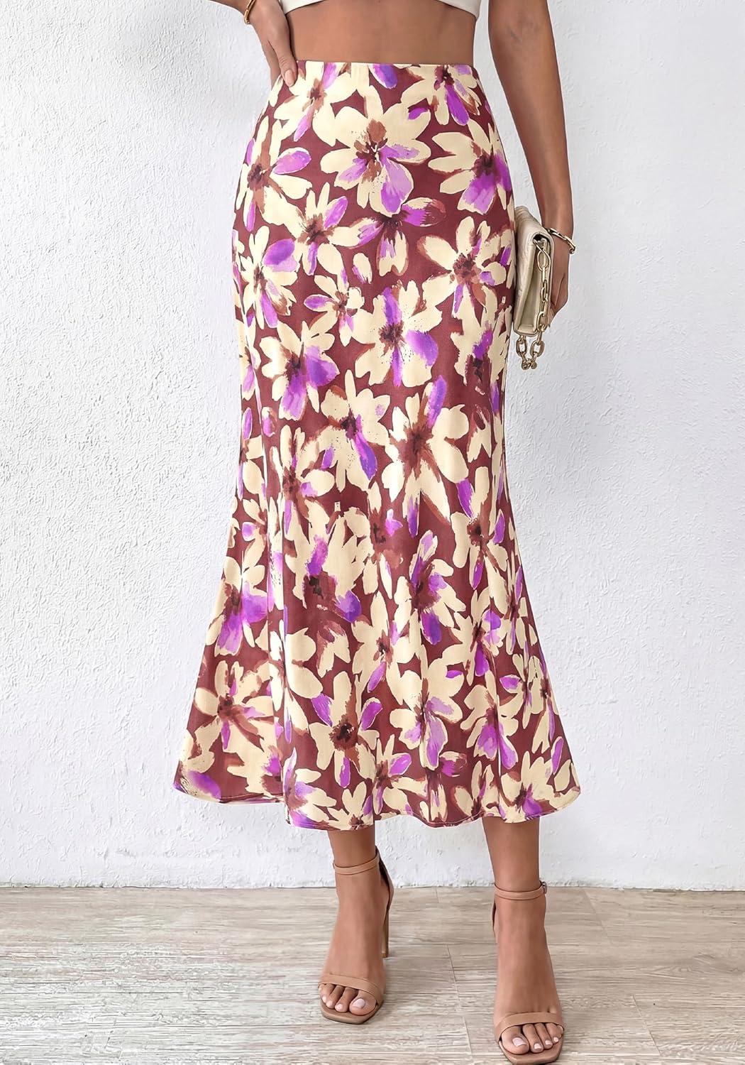 BTFBM Satin Skirts for Women Trendy Spring Summer 2026 High Waisted Leopard Print Cocktail Wedding Long Silk Midi Skirt(Floral Brown Beige)