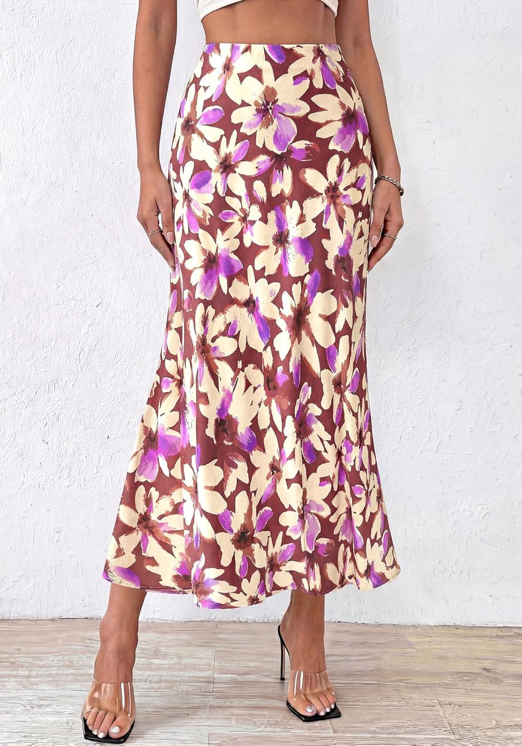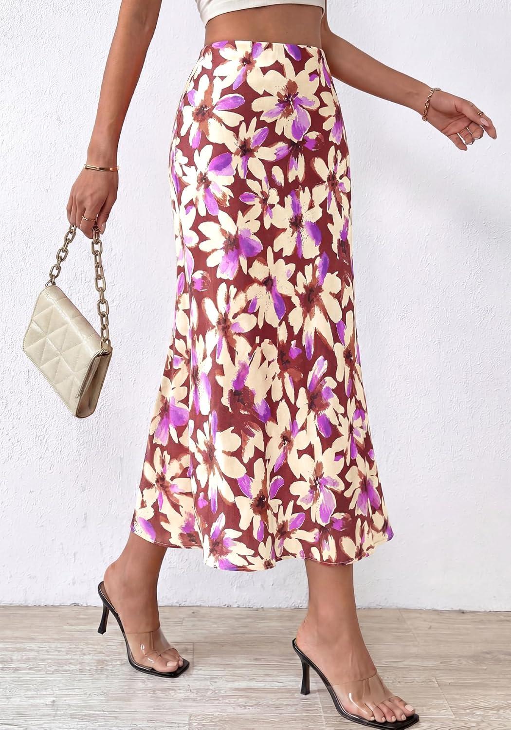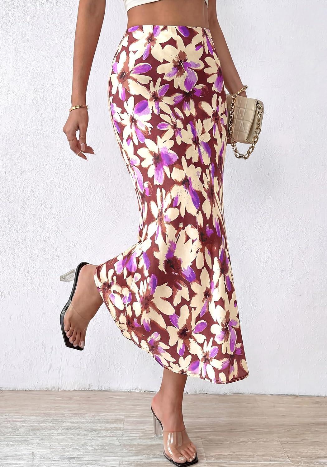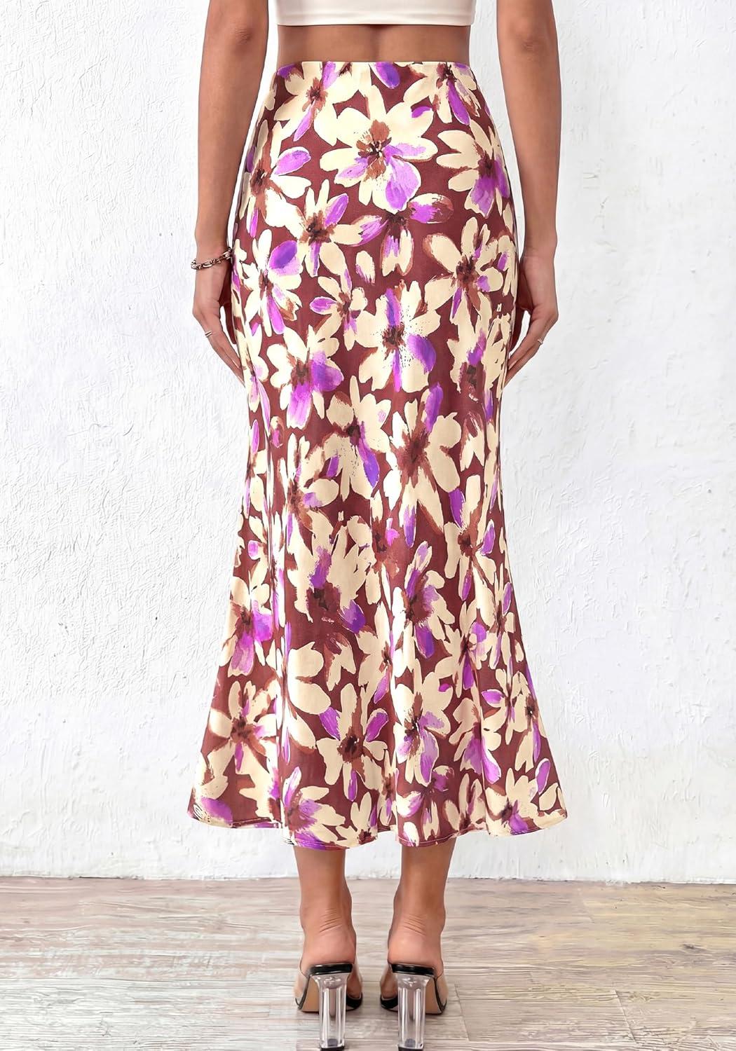 BTFBM Satin Skirts for Women Trendy Spring Summer 2026 High Waisted Leopard Print Cocktail Wedding Long Silk Midi Skirt(Floral Brown Light Green)