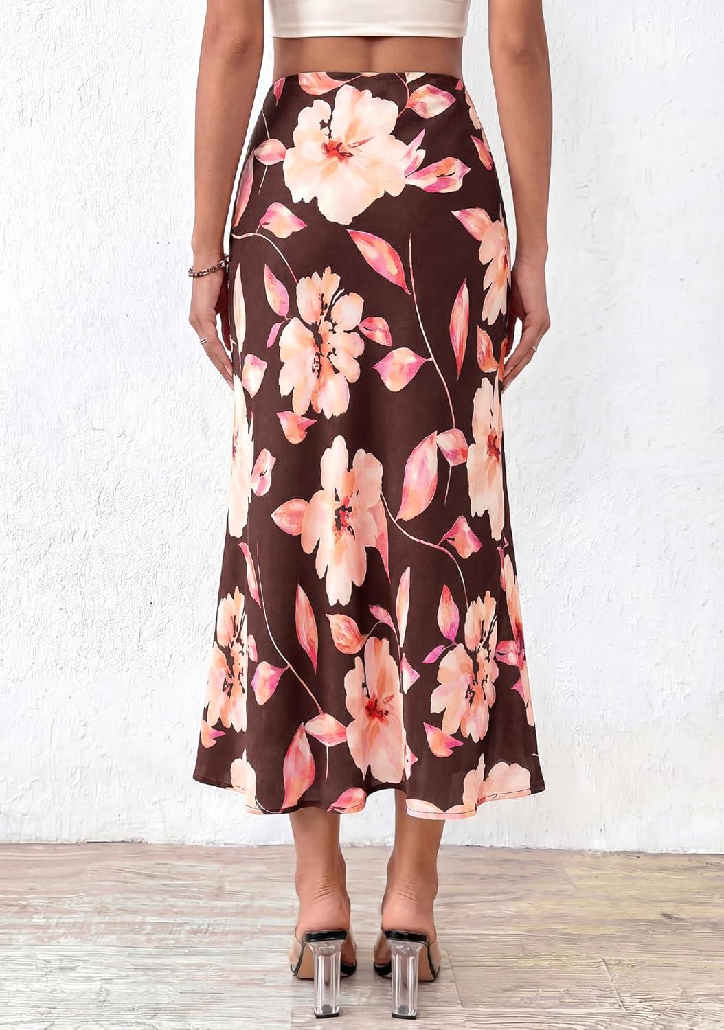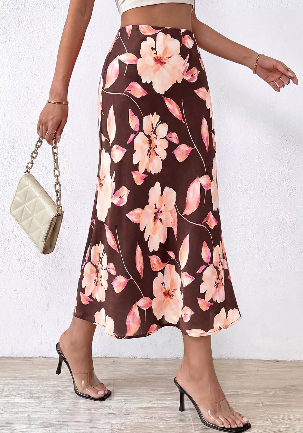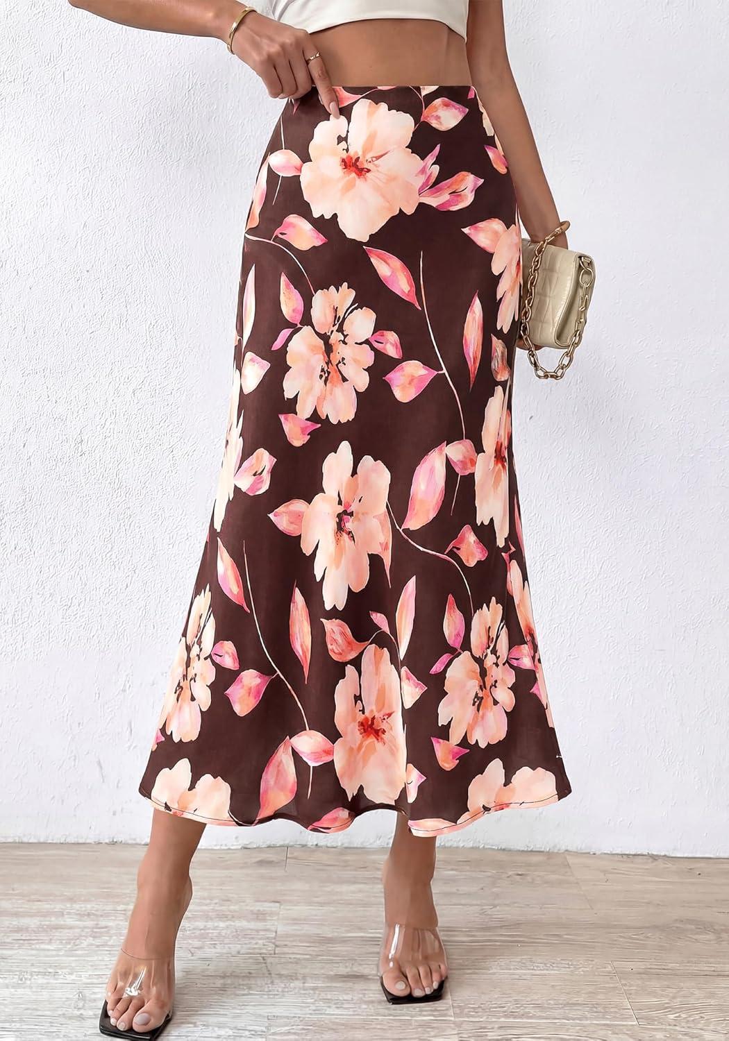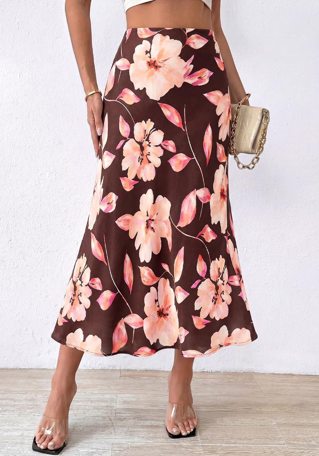 BTFBM Satin Skirts for Women Trendy Spring Summer 2026 High Waisted Leopard Print Cocktail Wedding Long Silk Midi Skirt(Floral Brown Pink)