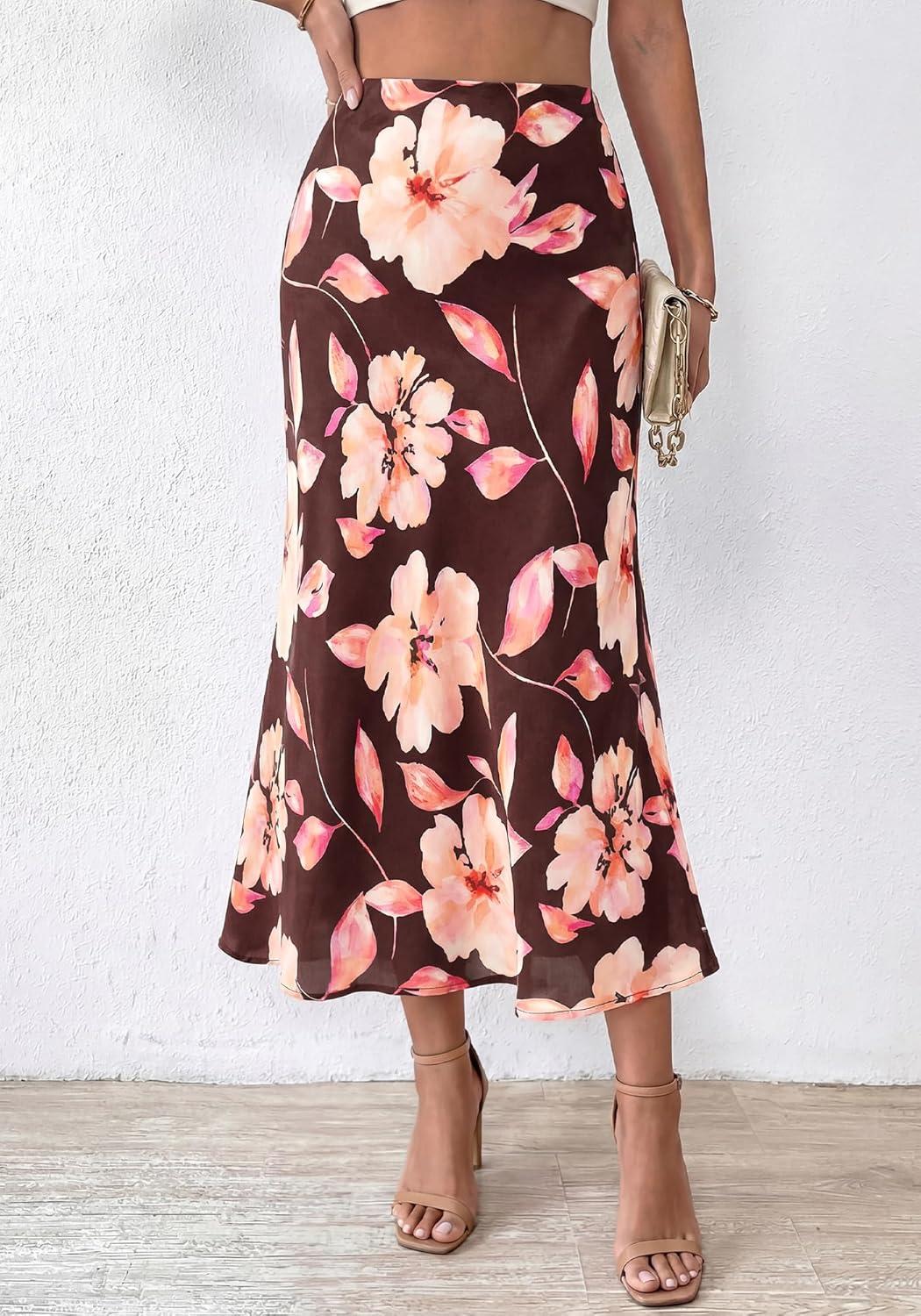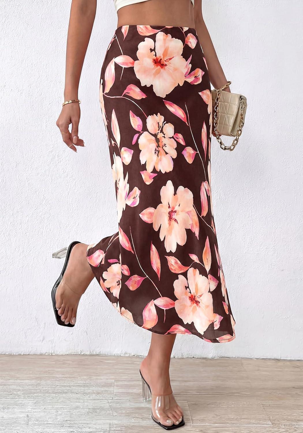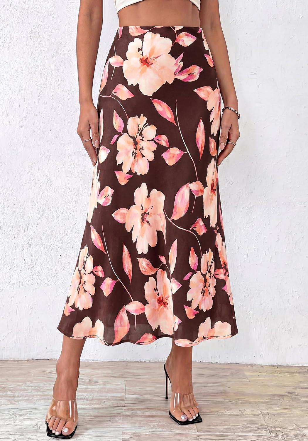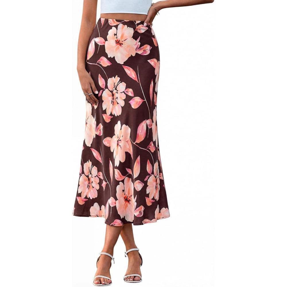 BTFBM Satin Skirts for Women Trendy Spring Summer 2026 High Waisted Leopard Print Cocktail Wedding Long Silk Midi Skirt(Floral Brown Pink)