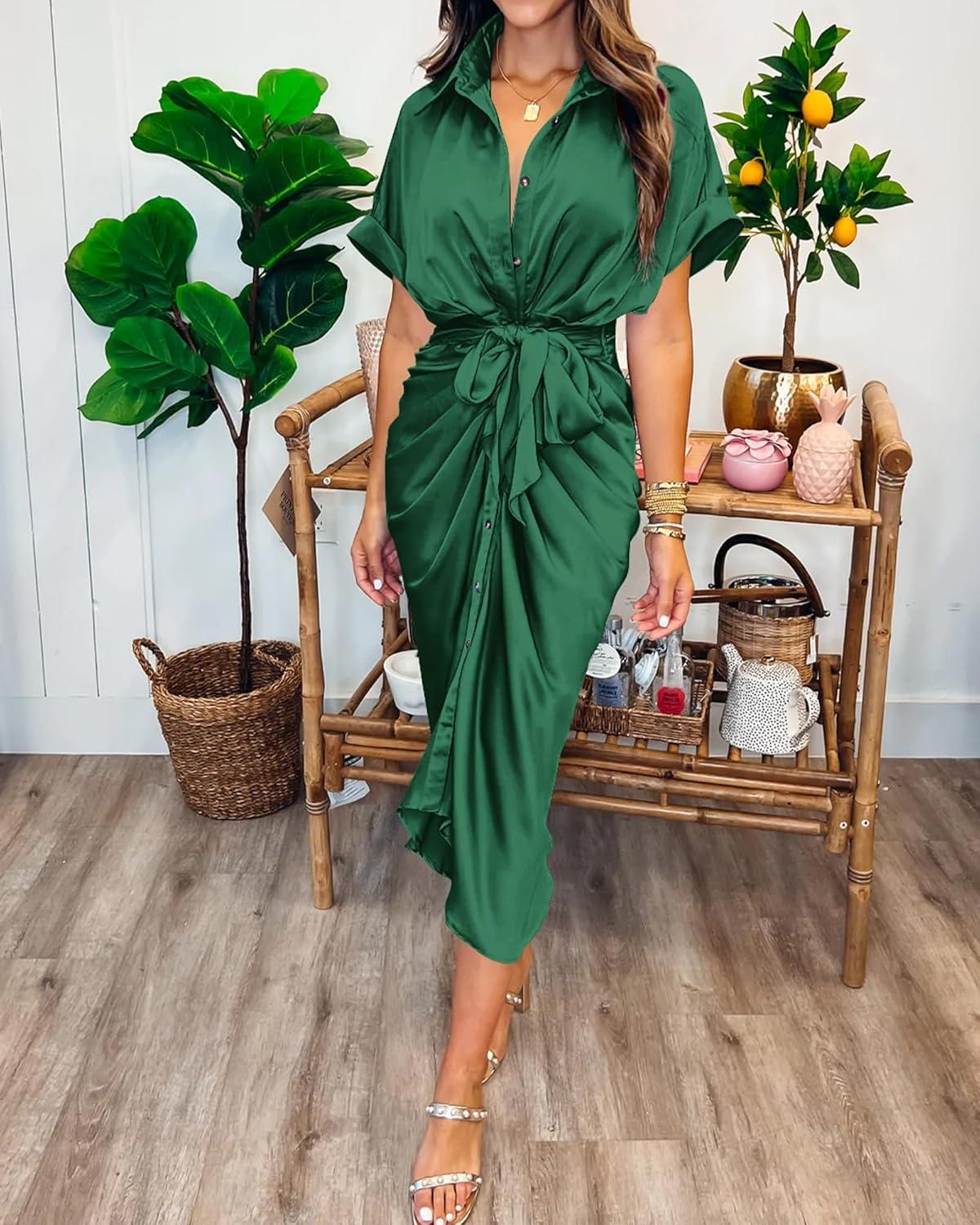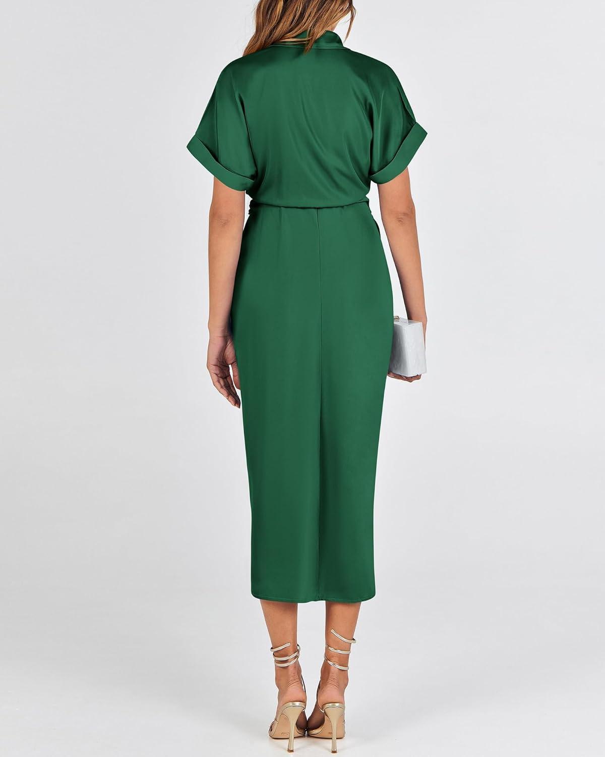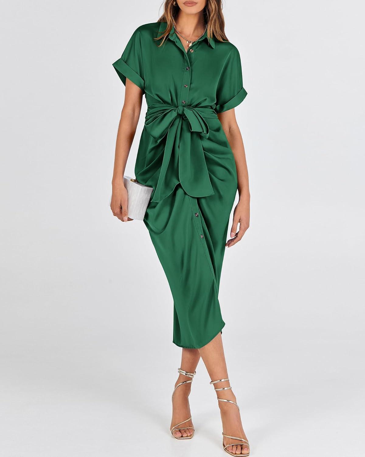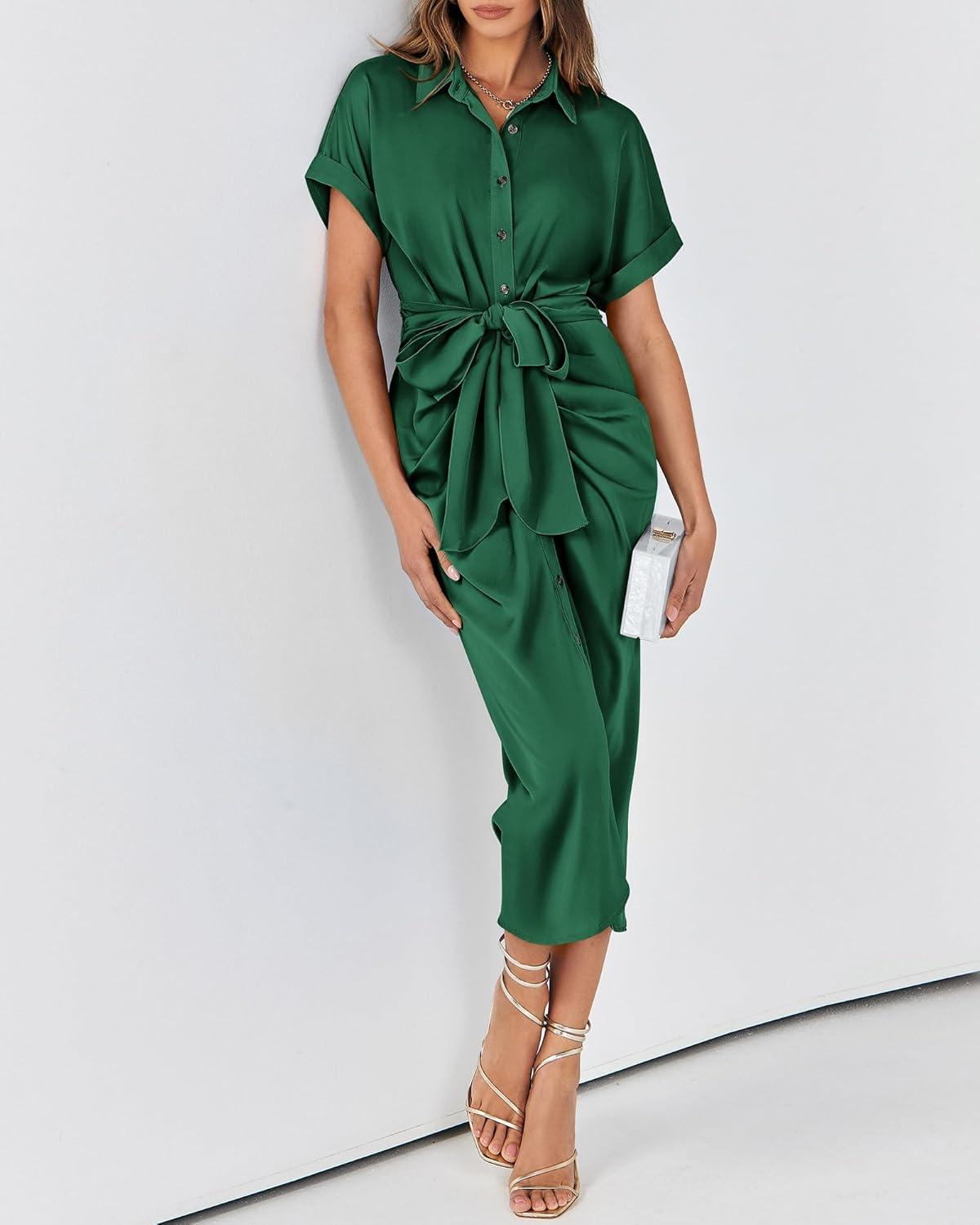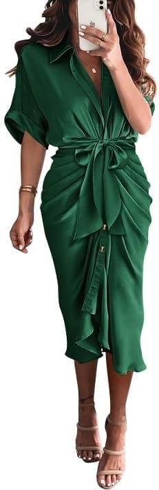 imageBTFBM Shirt Dresses for Women Spring Button Short Sleeve Silk Satin Ruched Maxi Summer Dress 2026 Cocktail Party WeddingDeep Green