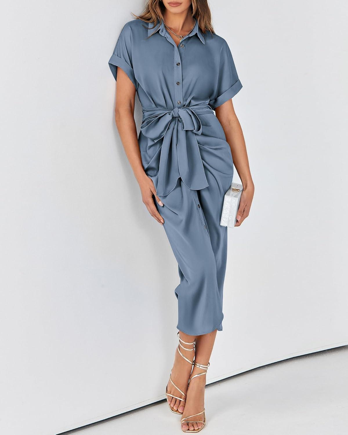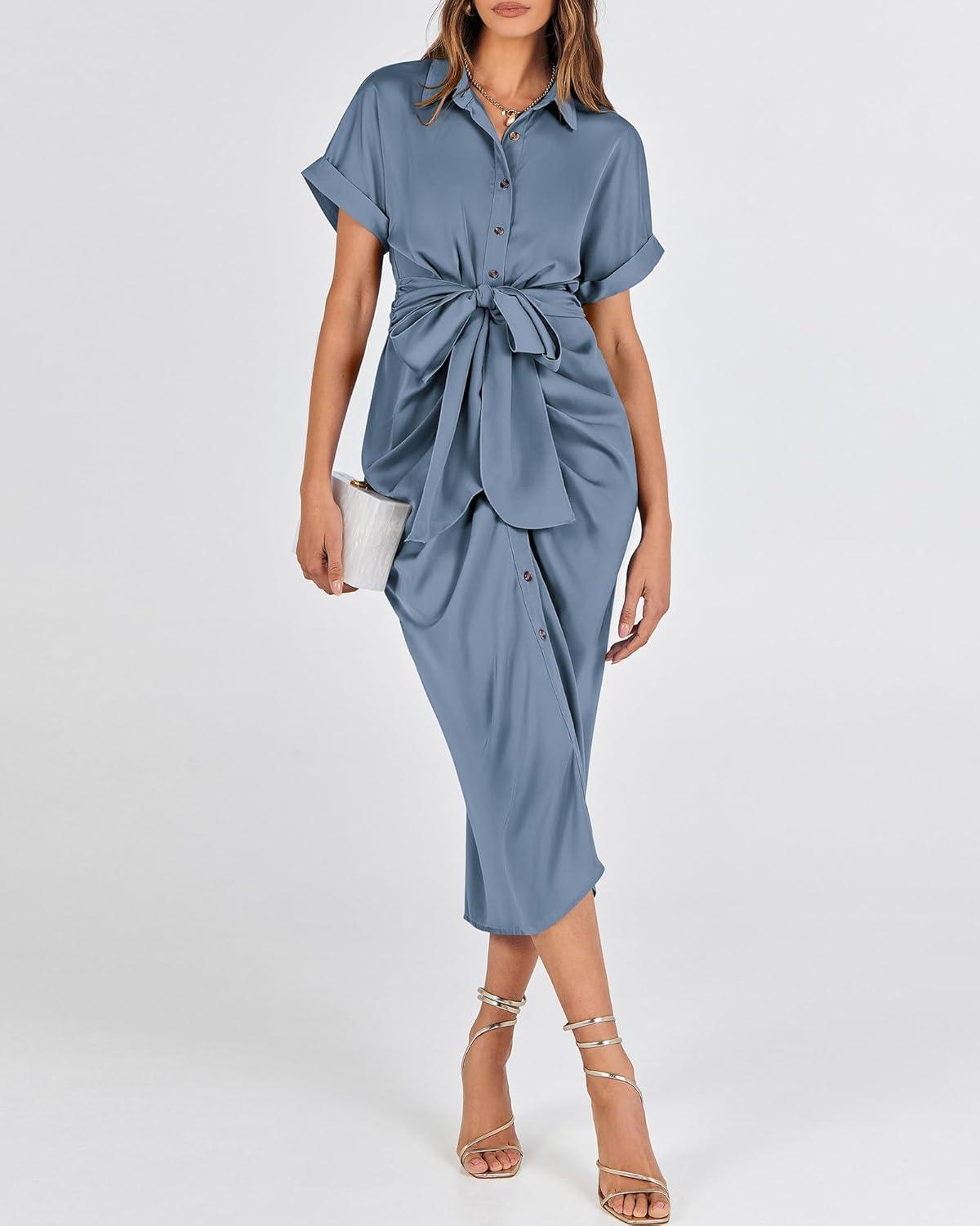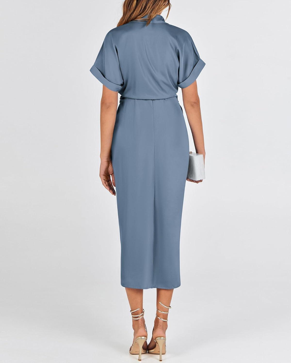 BTFBM Shirt Dresses for Women Spring Button Short Sleeve Silk Satin Ruched Maxi Summer Dress 2026 Cocktail Party Wedding(Grey Blue)