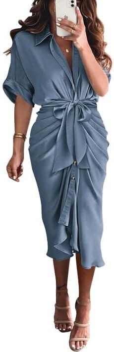 imageBTFBM Shirt Dresses for Women Spring Button Short Sleeve Silk Satin Ruched Maxi Summer Dress 2026 Cocktail Party WeddingGrey Blue