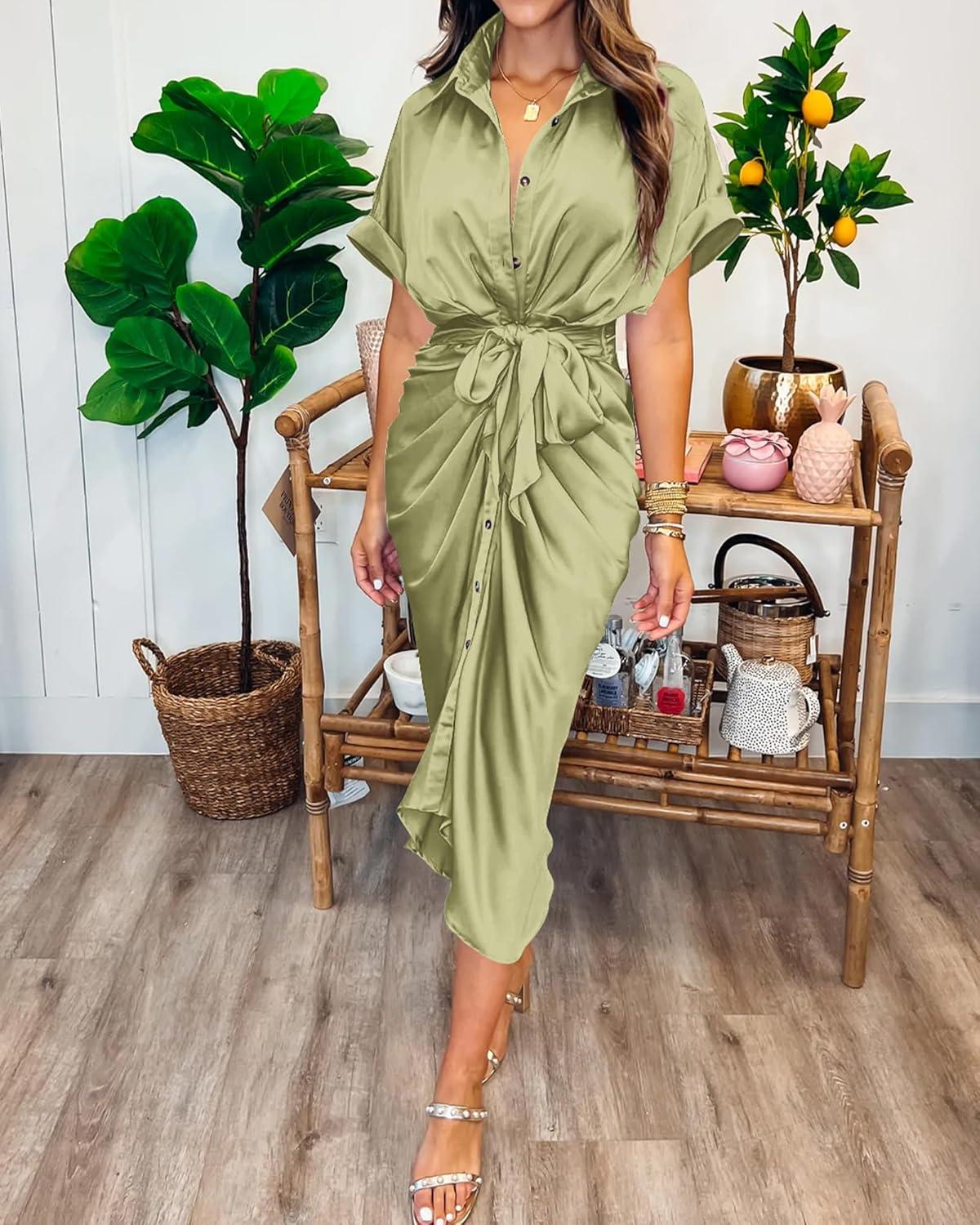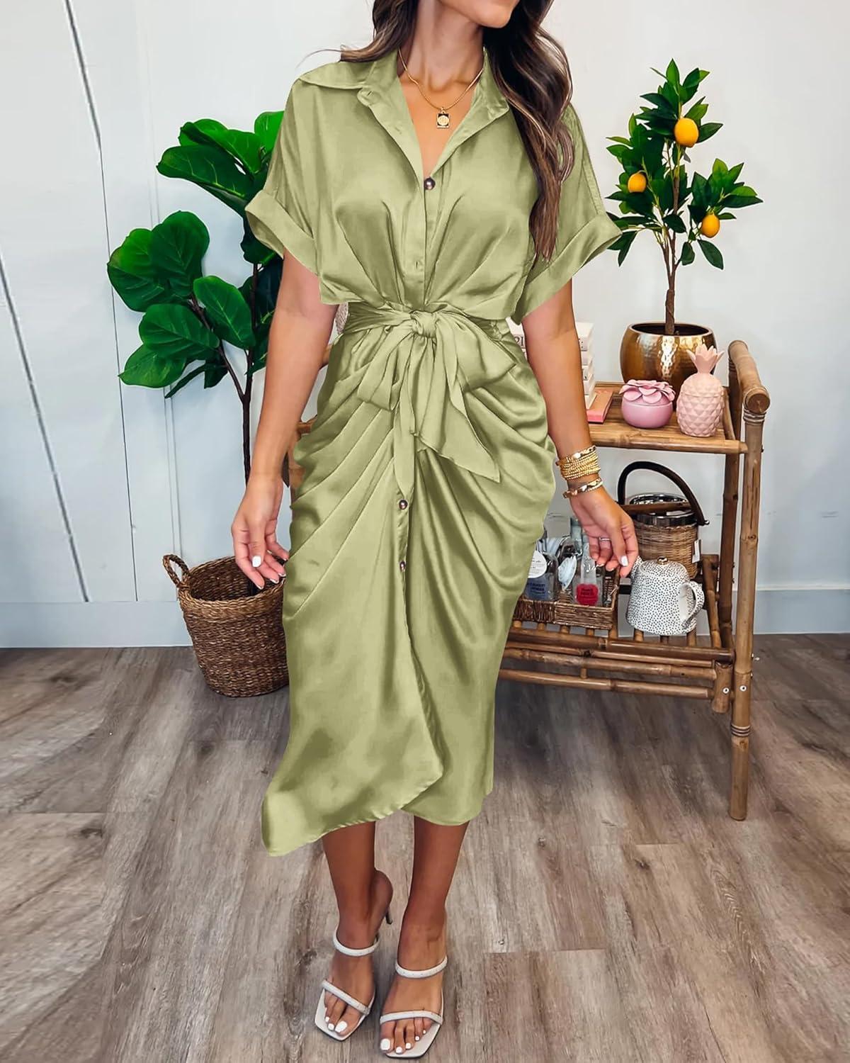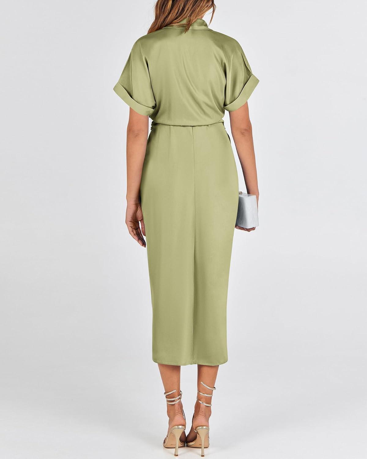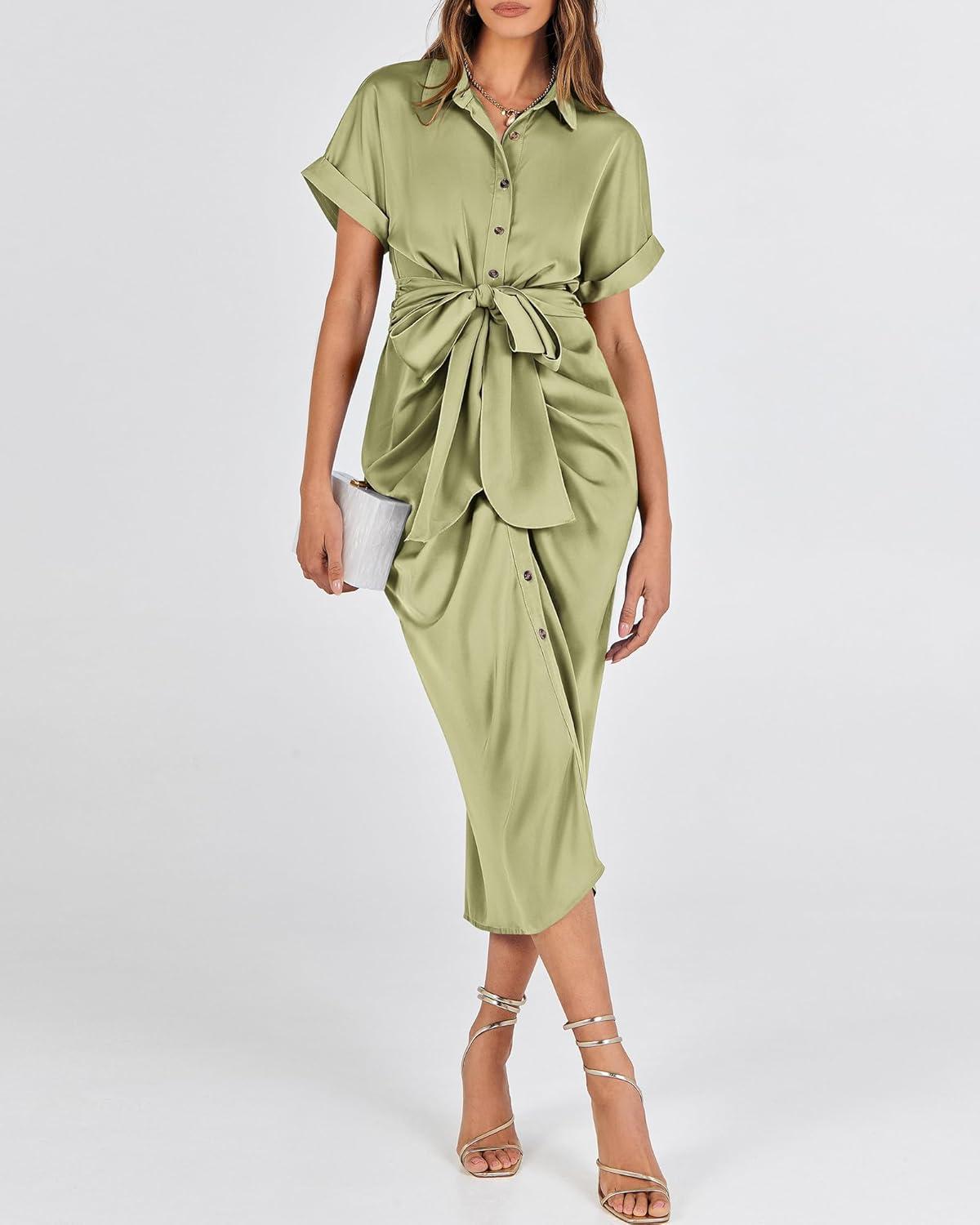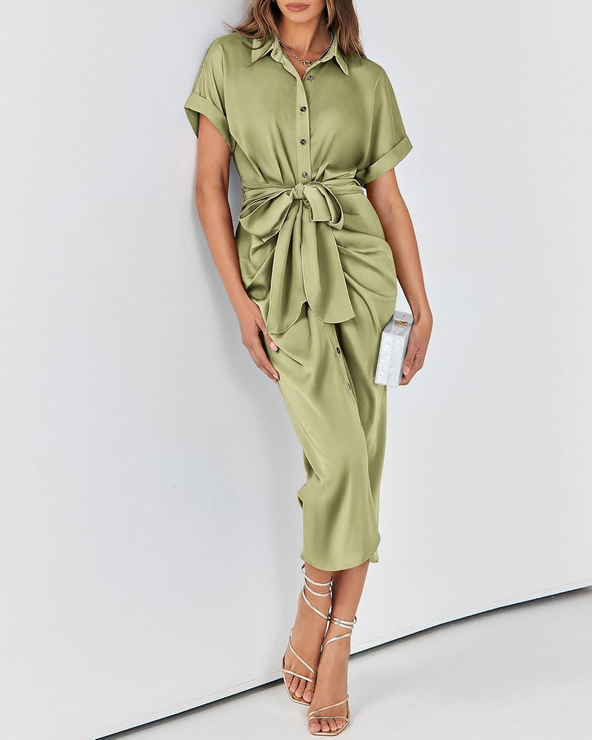 imageBTFBM Shirt Dresses for Women Spring Button Short Sleeve Silk Satin Ruched Maxi Summer Dress 2026 Cocktail Party WeddingLight Green