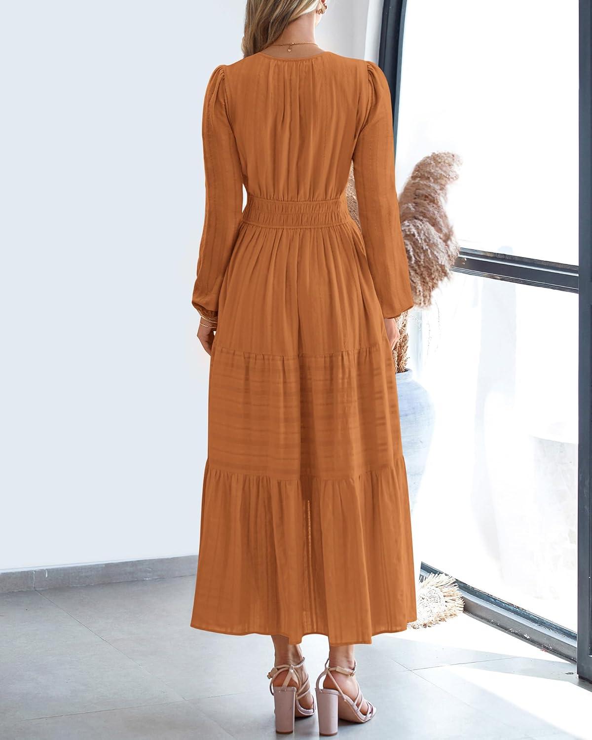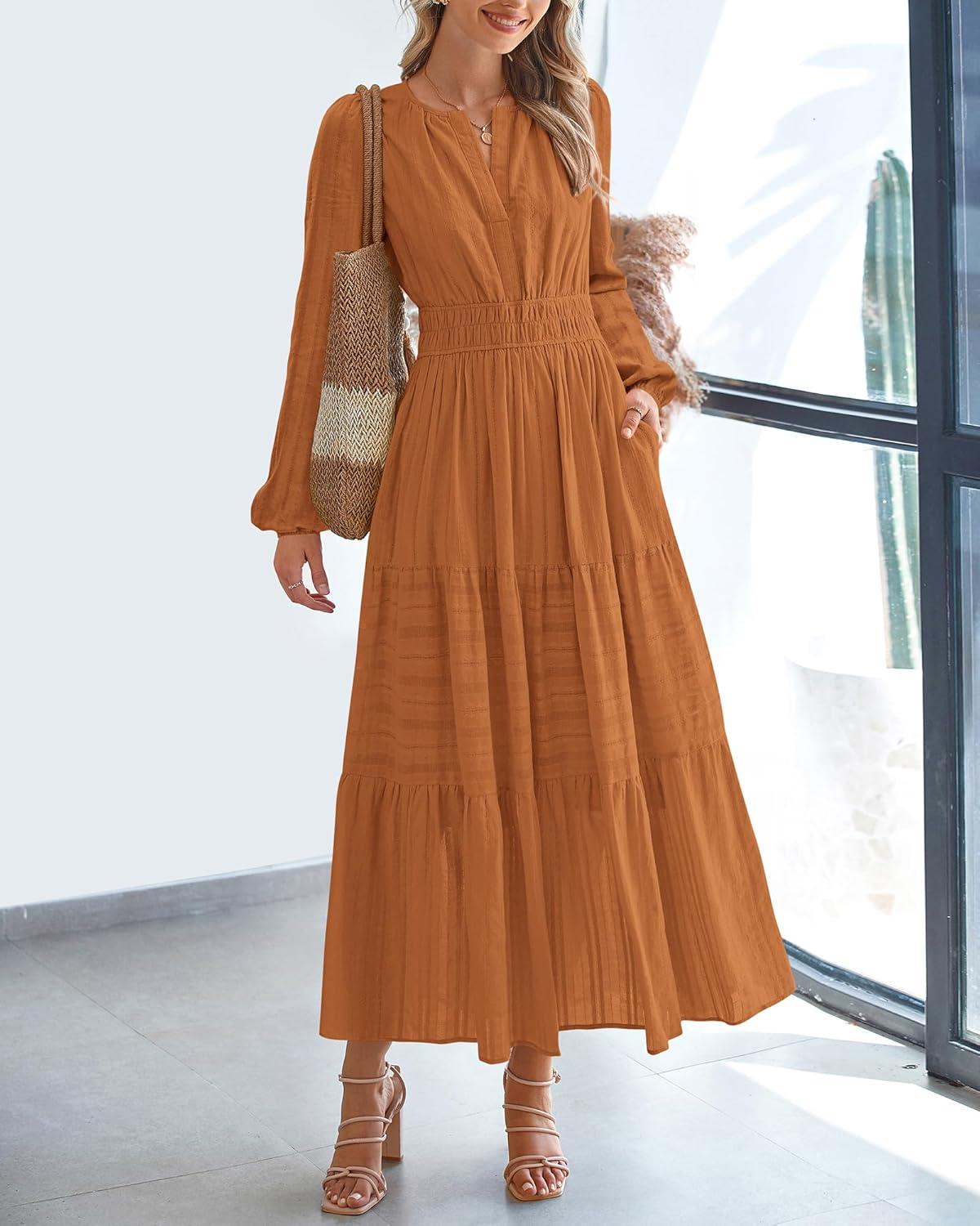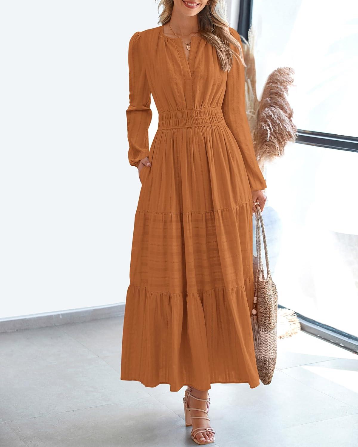 BTFBM Spring Dresses for Women 2026 Casual Long Sleeve V Neck Elastic Waist Lightweight Maxi Wedding Guest Dress Pockets(Brown Orange)
