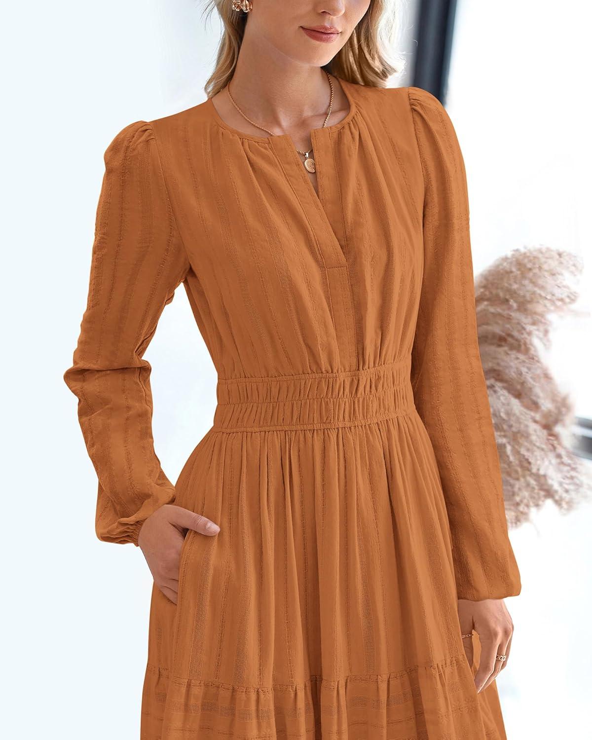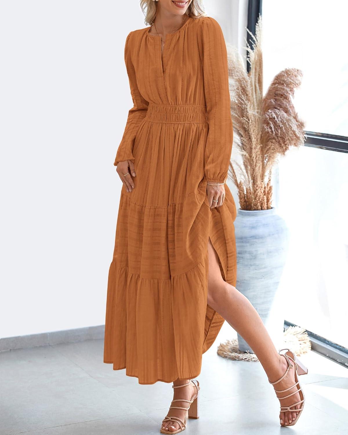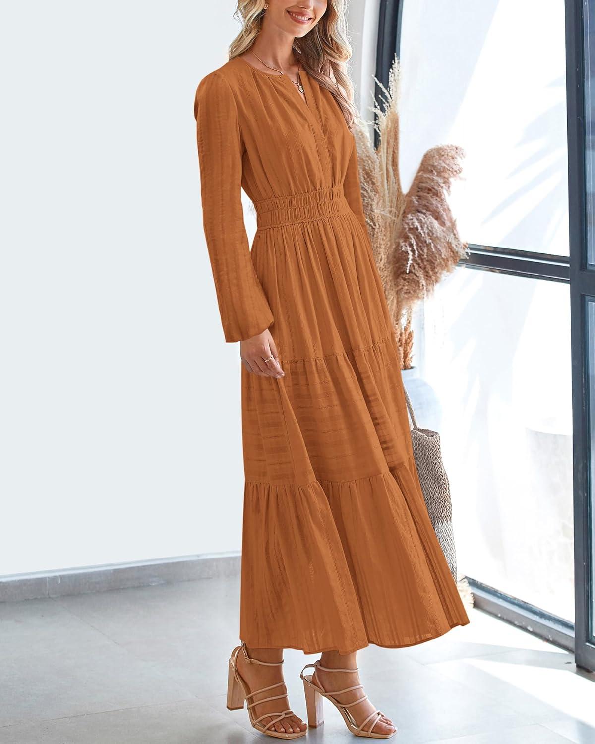 BTFBM Spring Dresses for Women 2026 Casual Long Sleeve V Neck Elastic Waist Lightweight Maxi Wedding Guest Dress Pockets(Brown Orange)