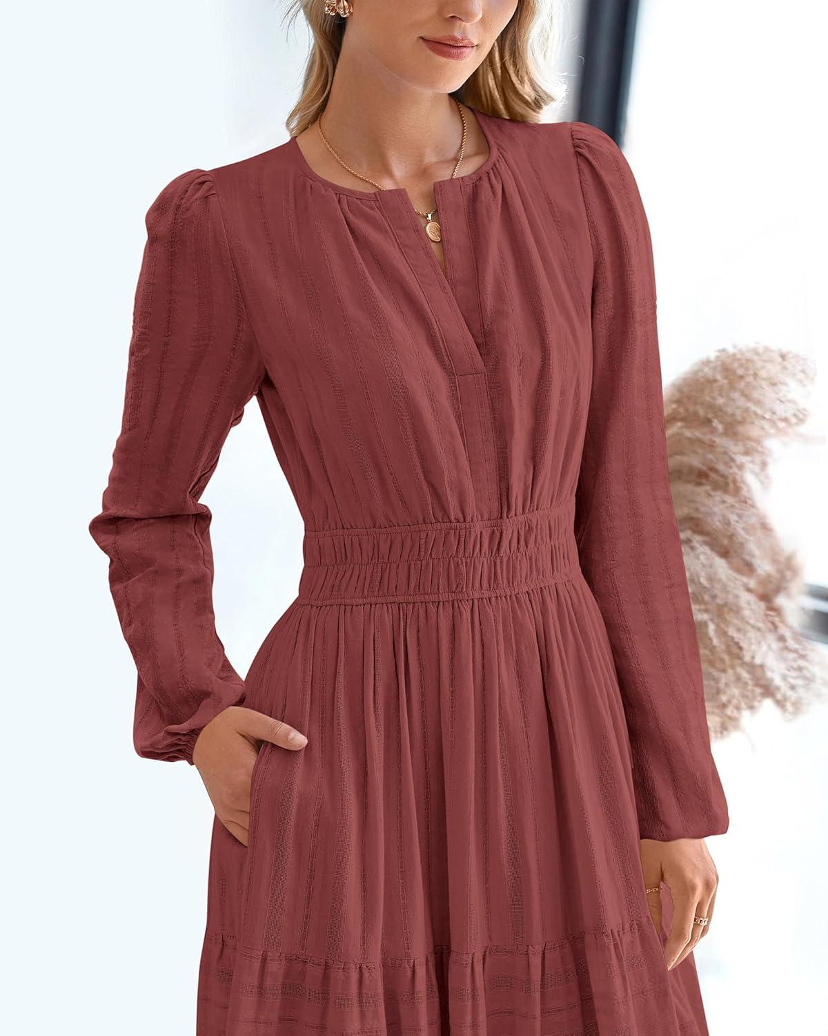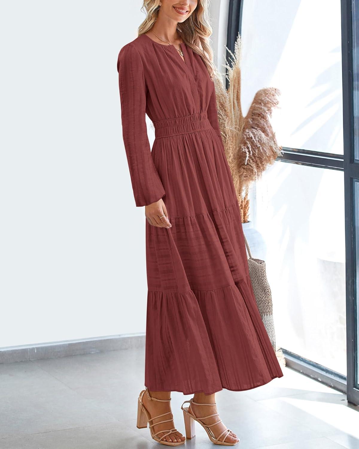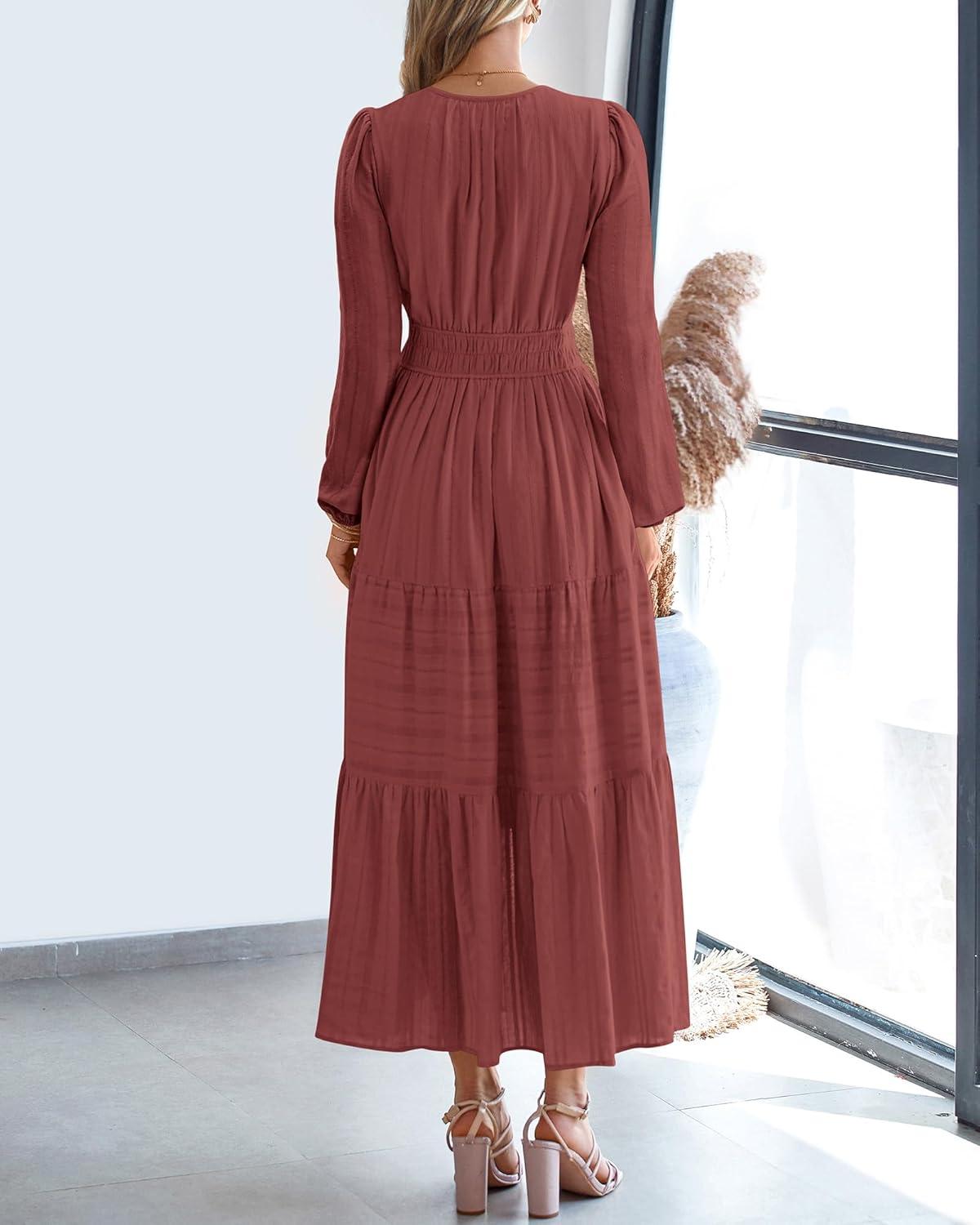 BTFBM Spring Dresses for Women 2026 Casual Long Sleeve V Neck Elastic Waist Lightweight Maxi Wedding Guest Dress Pockets(Brown Red)