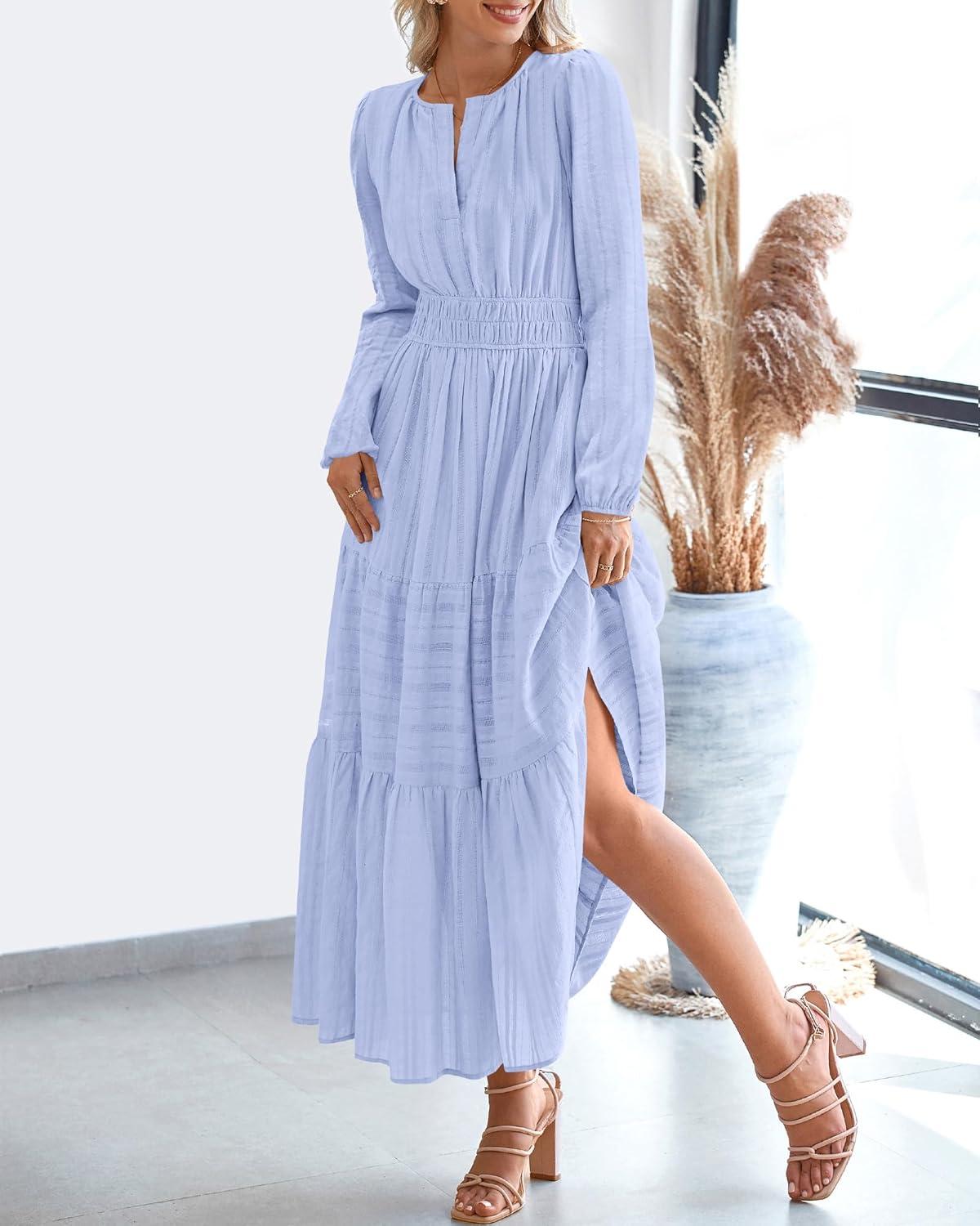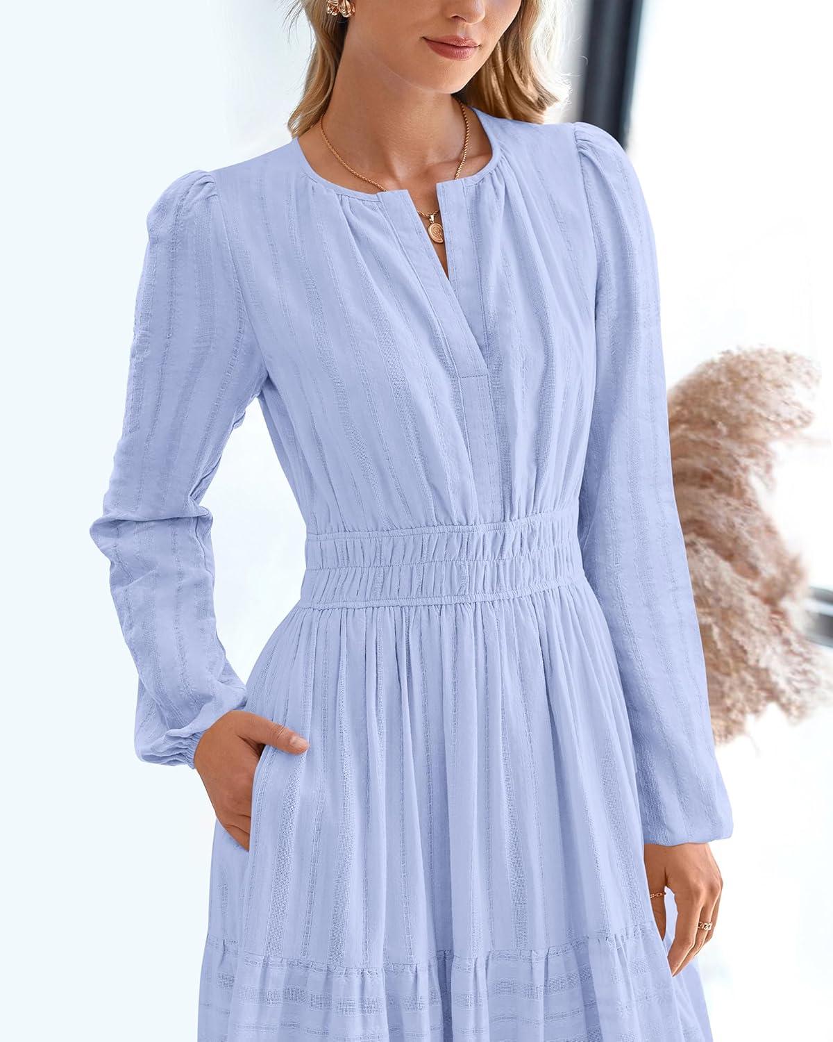 BTFBM Spring Dresses for Women 2026 Casual Long Sleeve V Neck Elastic Waist Lightweight Maxi Wedding Guest Dress Pockets(Light Blue)