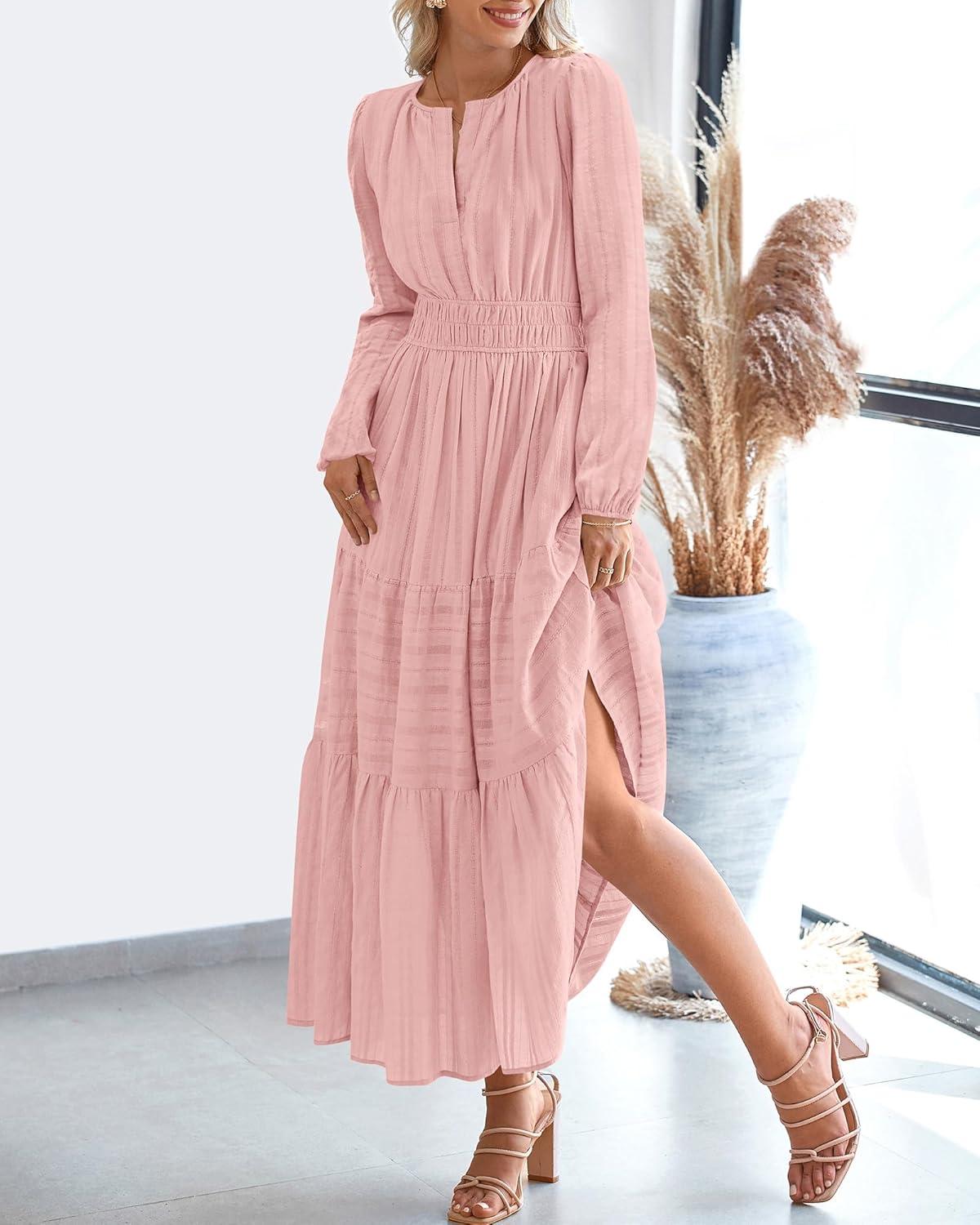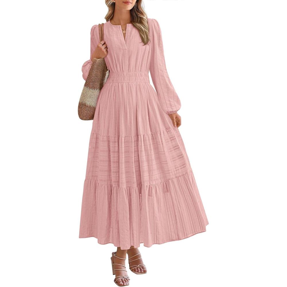 BTFBM Spring Dresses for Women 2026 Casual Long Sleeve V Neck Elastic Waist Lightweight Maxi Wedding Guest Dress Pockets(Pink)